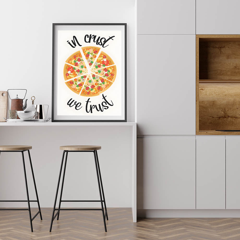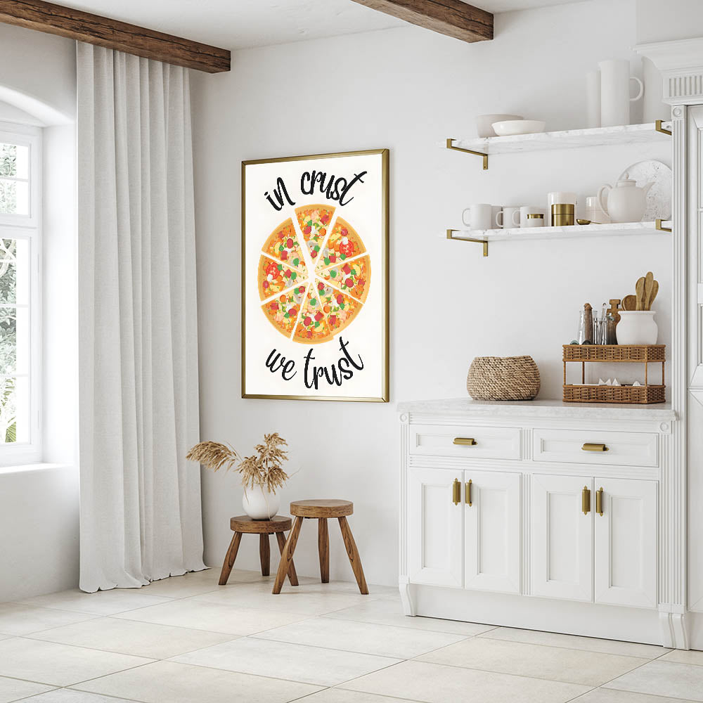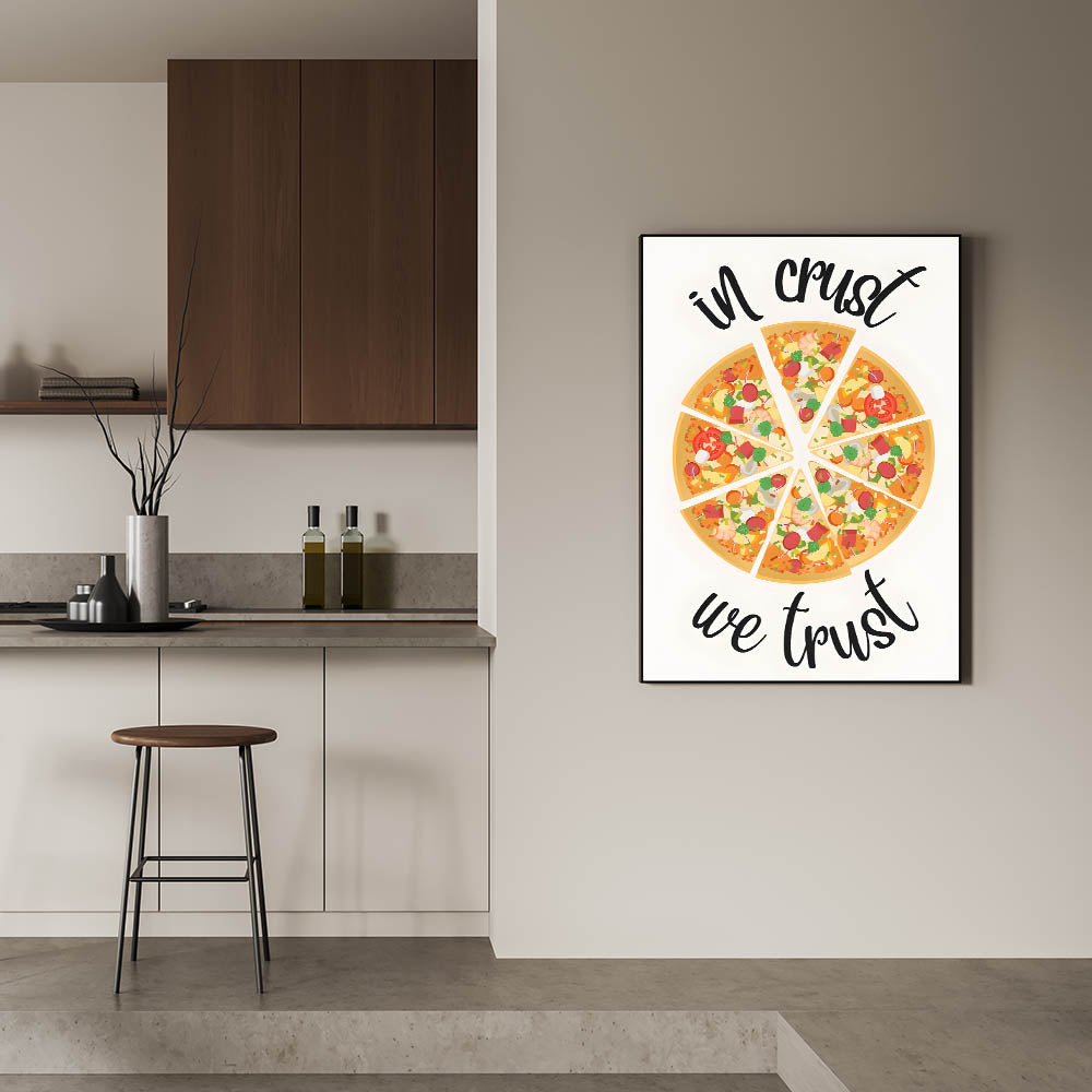 Add a playful and delicious touch to your space with this Inspirational Culinary Wall Art featuring the phrase "In Crust We Trust." This lively Motivational Kitchen Wall Decor is perfect for pizza lovers, foodies, and anyone who enjoys a fun kitchen aesthetic. The vibrant pizza illustration, complete with fresh toppings, pairs beautifully with the bold typography, creating an eye-catching and mouthwatering design.