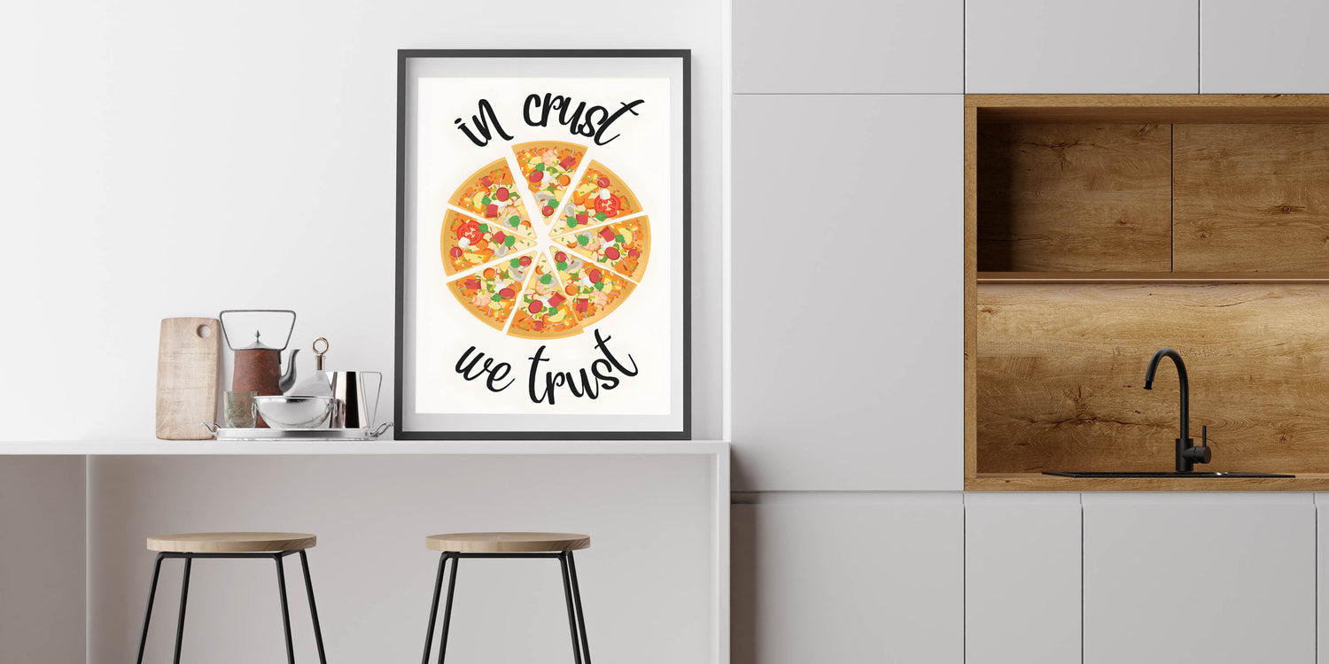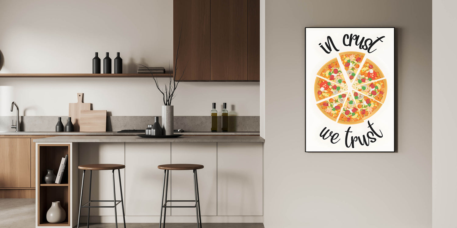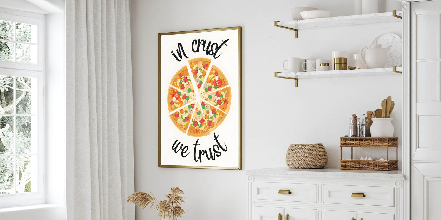 Add a playful and delicious touch to your space with this Inspirational Culinary Wall Art featuring the phrase "In Crust We Trust." This lively Motivational Kitchen Wall Decor is perfect for pizza lovers, foodies, and anyone who enjoys a fun kitchen aesthetic. The vibrant pizza illustration, complete with fresh toppings, pairs beautifully with the bold typography, creating an eye-catching and mouthwatering design.