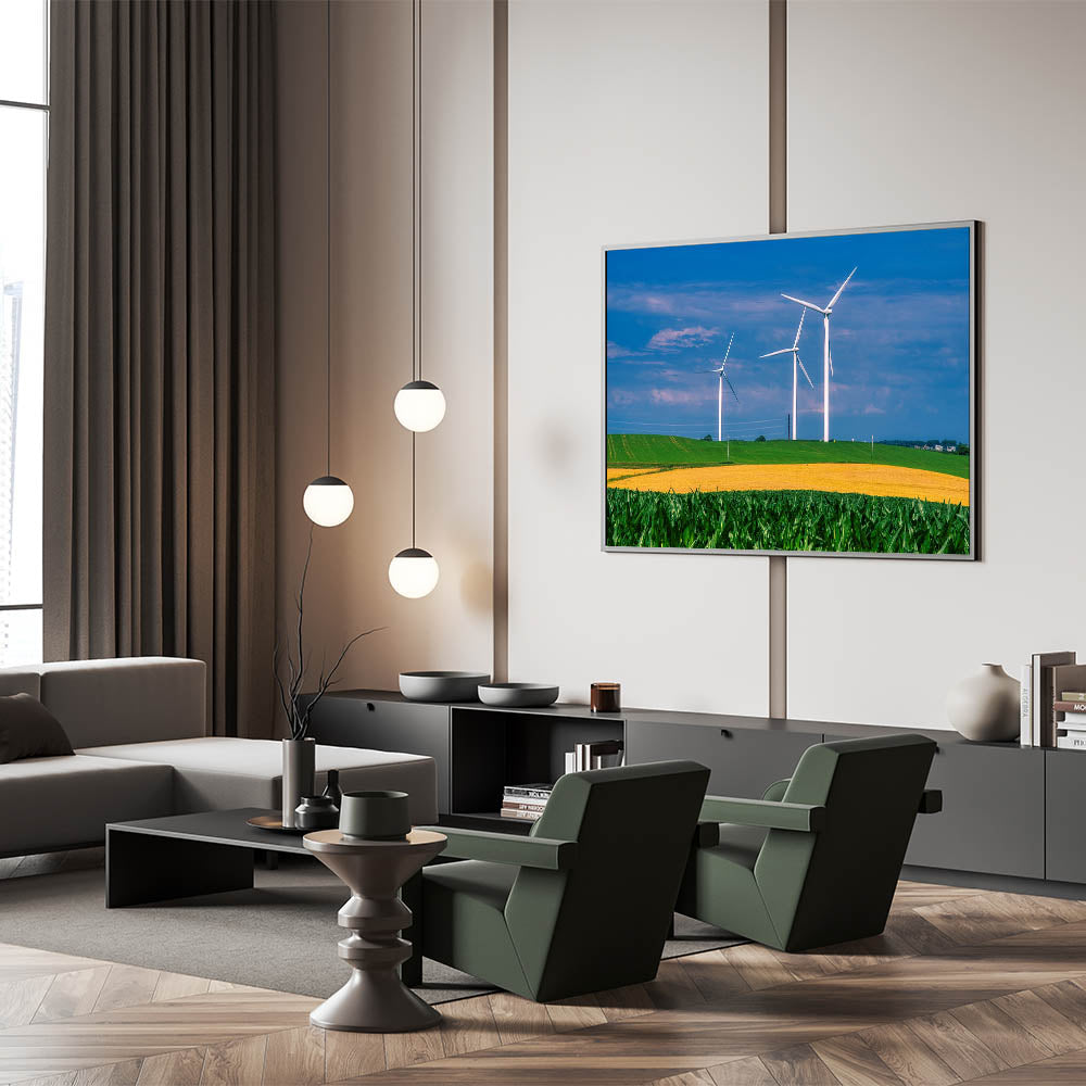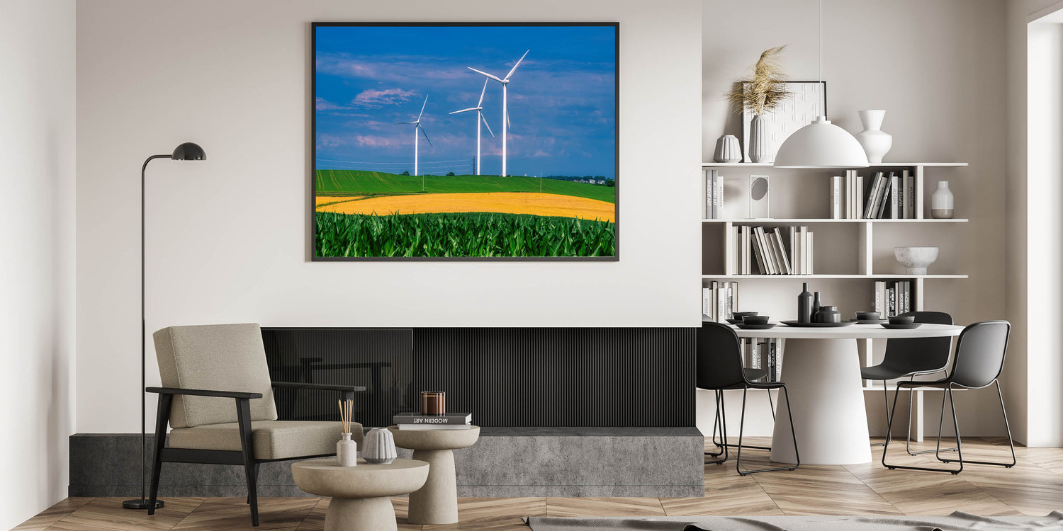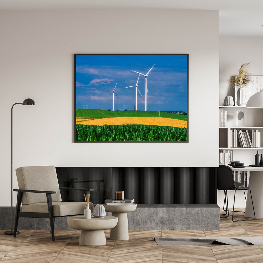 Capture the harmony of Iowa's natural landscape and modern energy with this stunning Iowa Canvas Print. This vibrant photograph features wind turbines standing tall over lush green fields and golden farmlands, symbolizing the perfect balance of nature and technology in Iowa rural scenery. Ideal for those who appreciate Iowa home decor with a contemporary touch, this artwork is available in a variety of formats, including stretched canvas, framed prints, and acrylic glass, ensuring a perfect fit for your space.