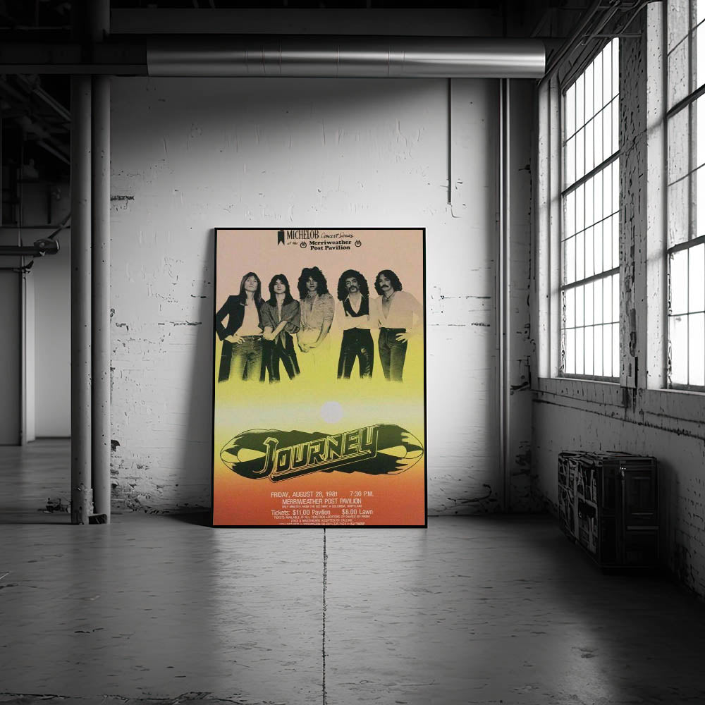 Bring the retro aesthetic of the 1980s into your space with this Journey vintage decor poster. Featuring a classic retro style with a warm sunset gradient, bold typography, and an iconic image of the legendary rock band, this nostalgic art print captures the essence of an unforgettable concert. Designed with timeless retro designs, this poster is a must-have for rock music fans and collectors of retro poster art.