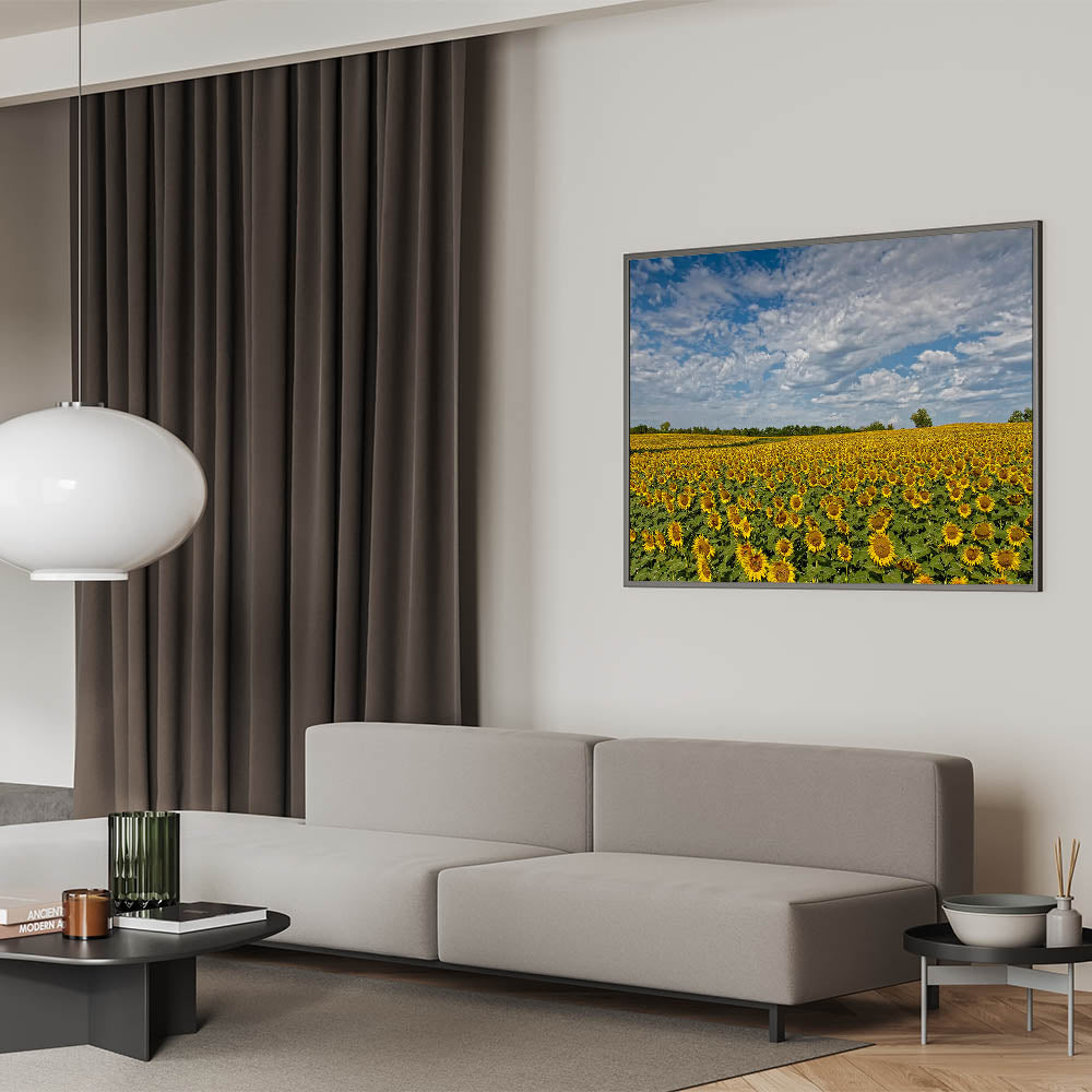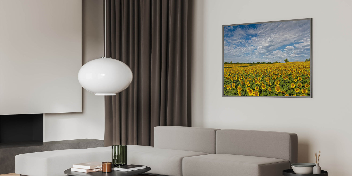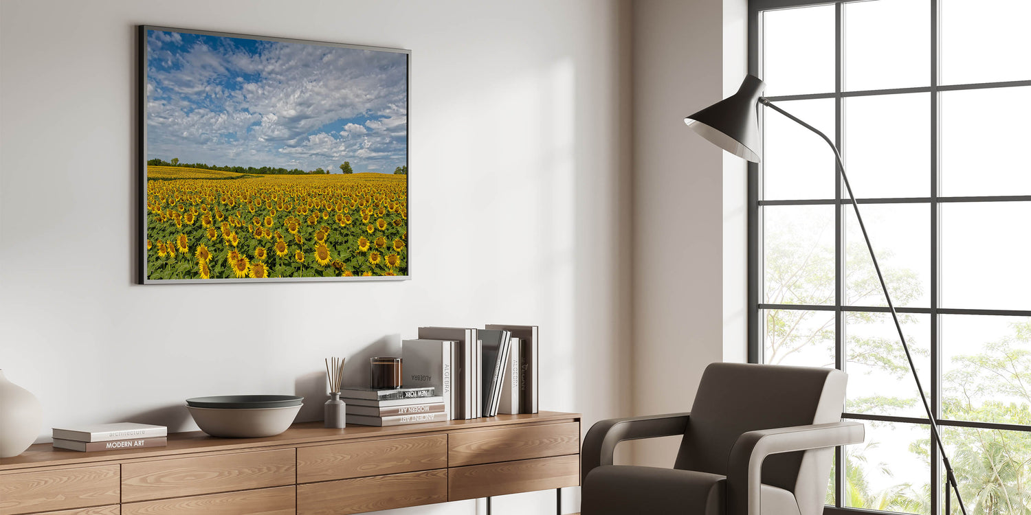 Whether you opt for framed Kansas art or sleek acrylic Kansas art, this piece will enhance any room with its vibrant imagery and bring the peaceful charm of Kansas landscapes indoors. Make this sunflower field art a part of your decor and enjoy the beauty of nature year-round.