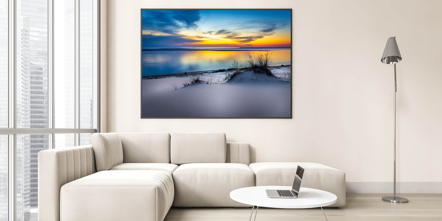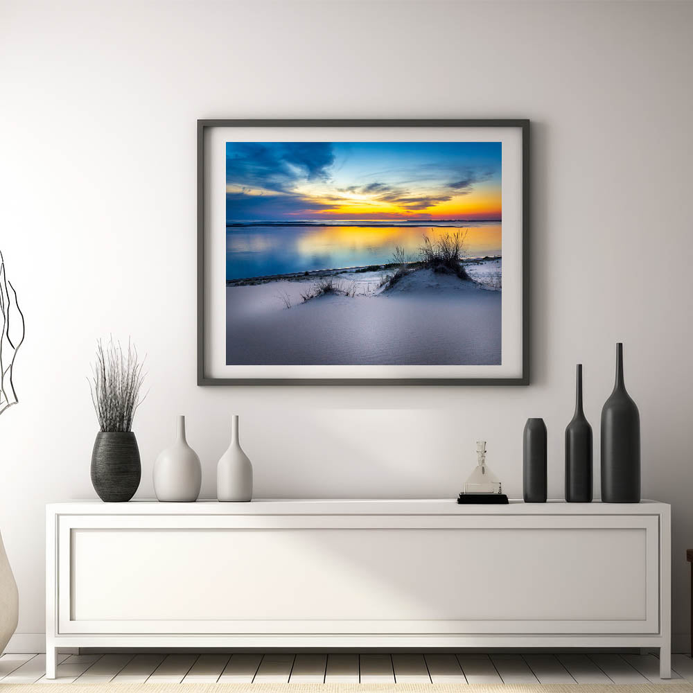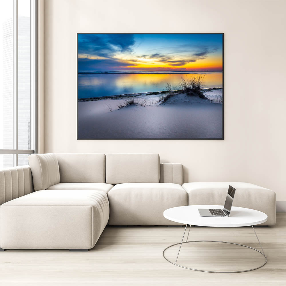 Bring a sense of calm and tranquility to your space with this Kansas nature art, featuring peaceful sand dunes and a serene sunset over a reflective lake. The gentle curves of the dunes, combined with the vivid blues, yellows, and oranges of the sky, create a harmonious scene perfect for anyone who loves scenic Kansas artwork. This Kansas landscape print captures the quiet beauty of nature, making it a perfect addition to any room in your home or office.