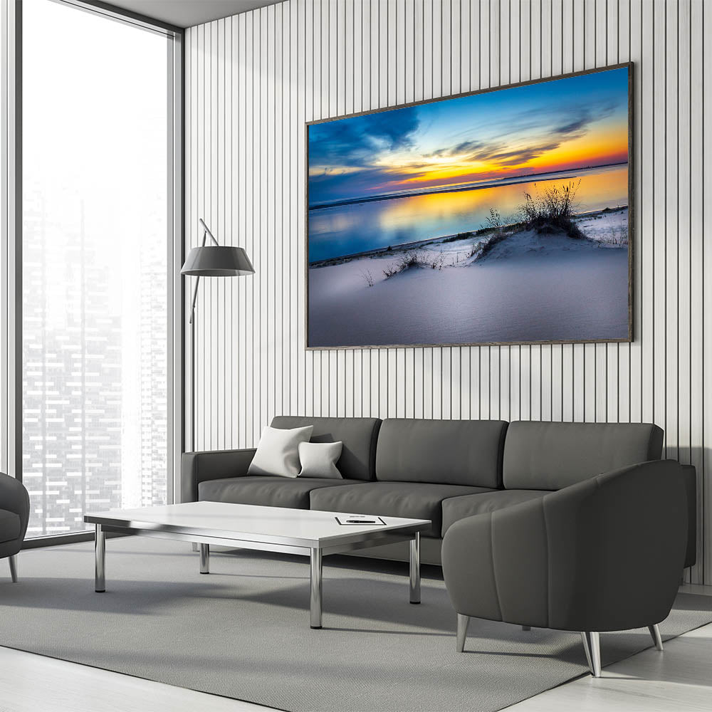 This framed Kansas art or acrylic Kansas art piece beautifully captures the stillness of the dunes and the vibrancy of the sunset, making it a perfect choice for any room. Celebrate the beauty of Kansas landscapes with this stunning piece of wall art.