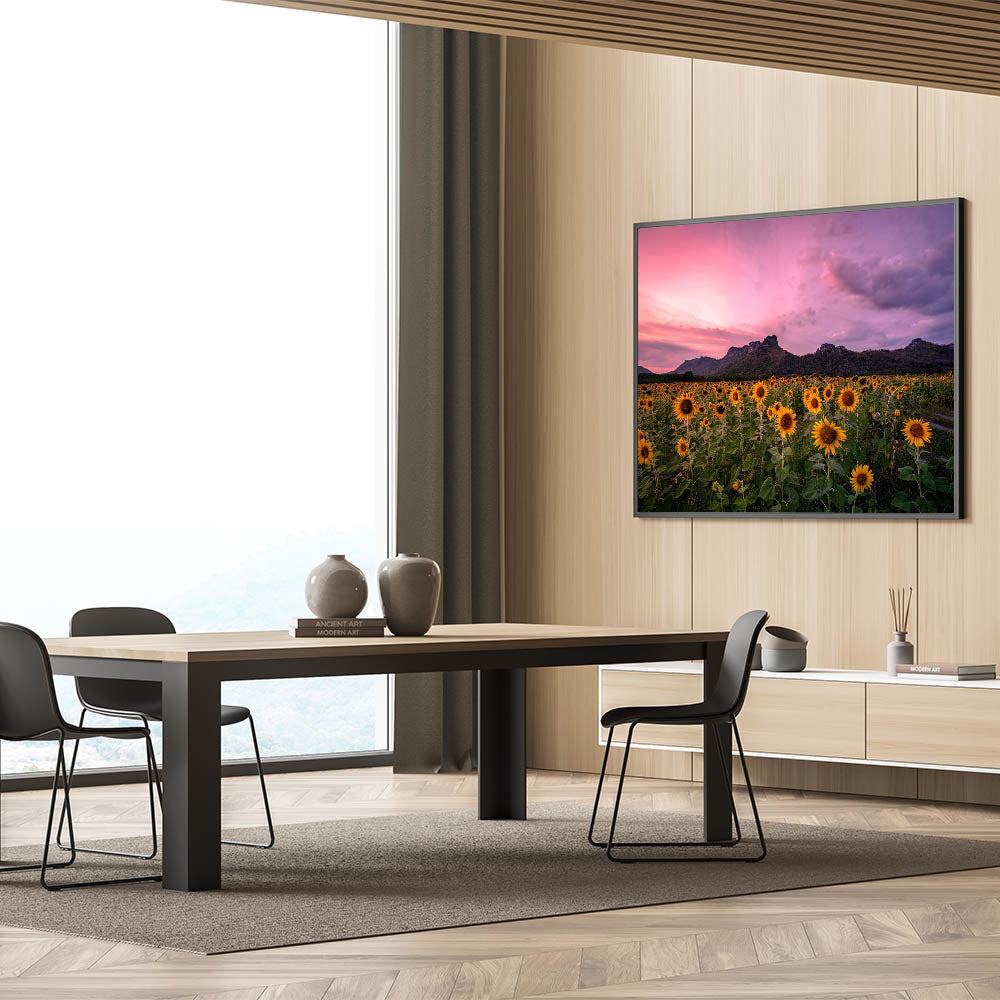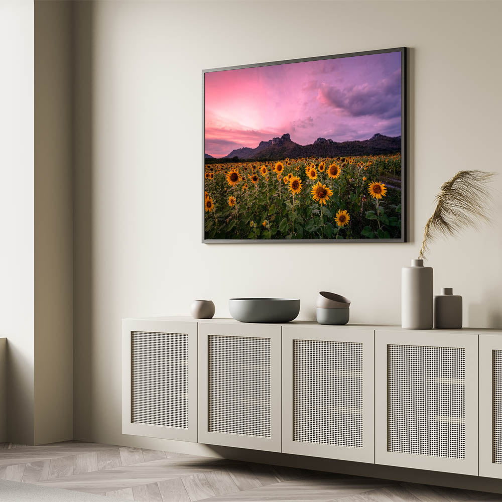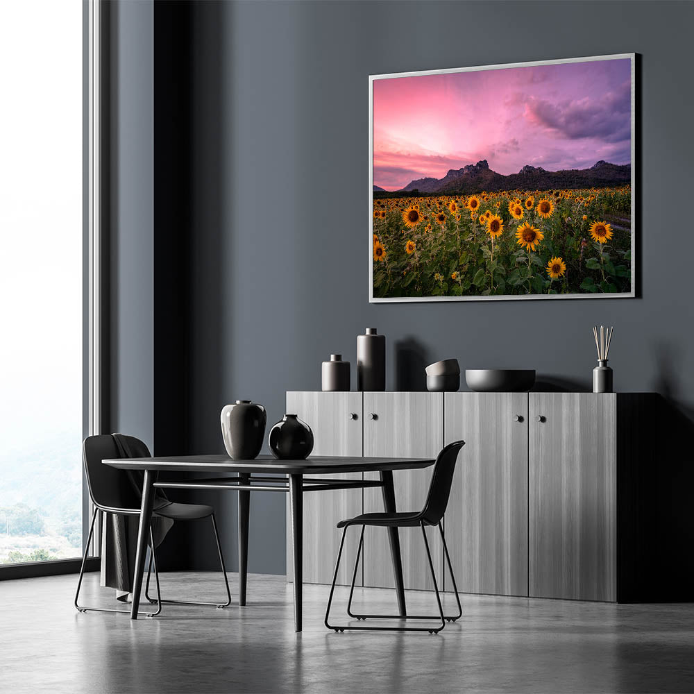 Kansas Nature Art - Sunflower Field at Dusk with Mountain Backdrop Print