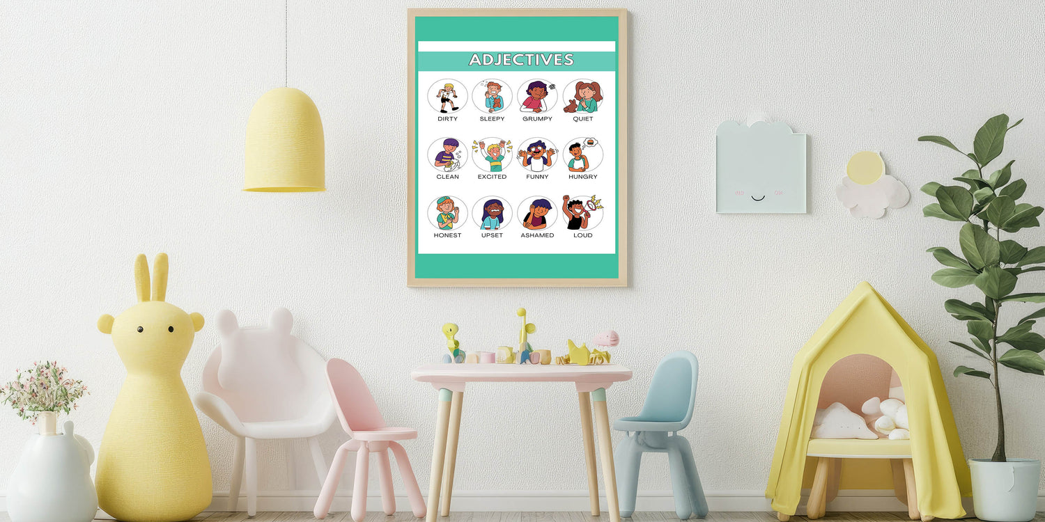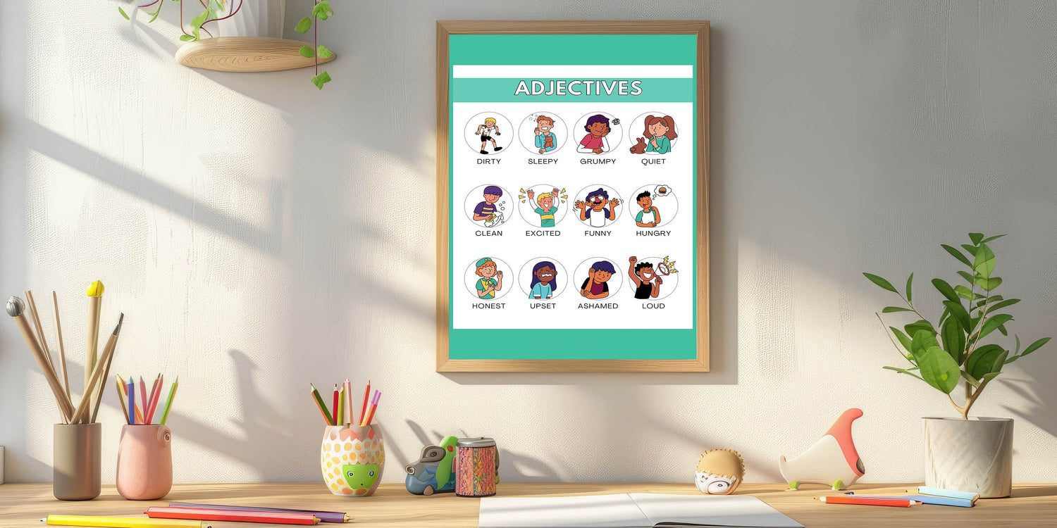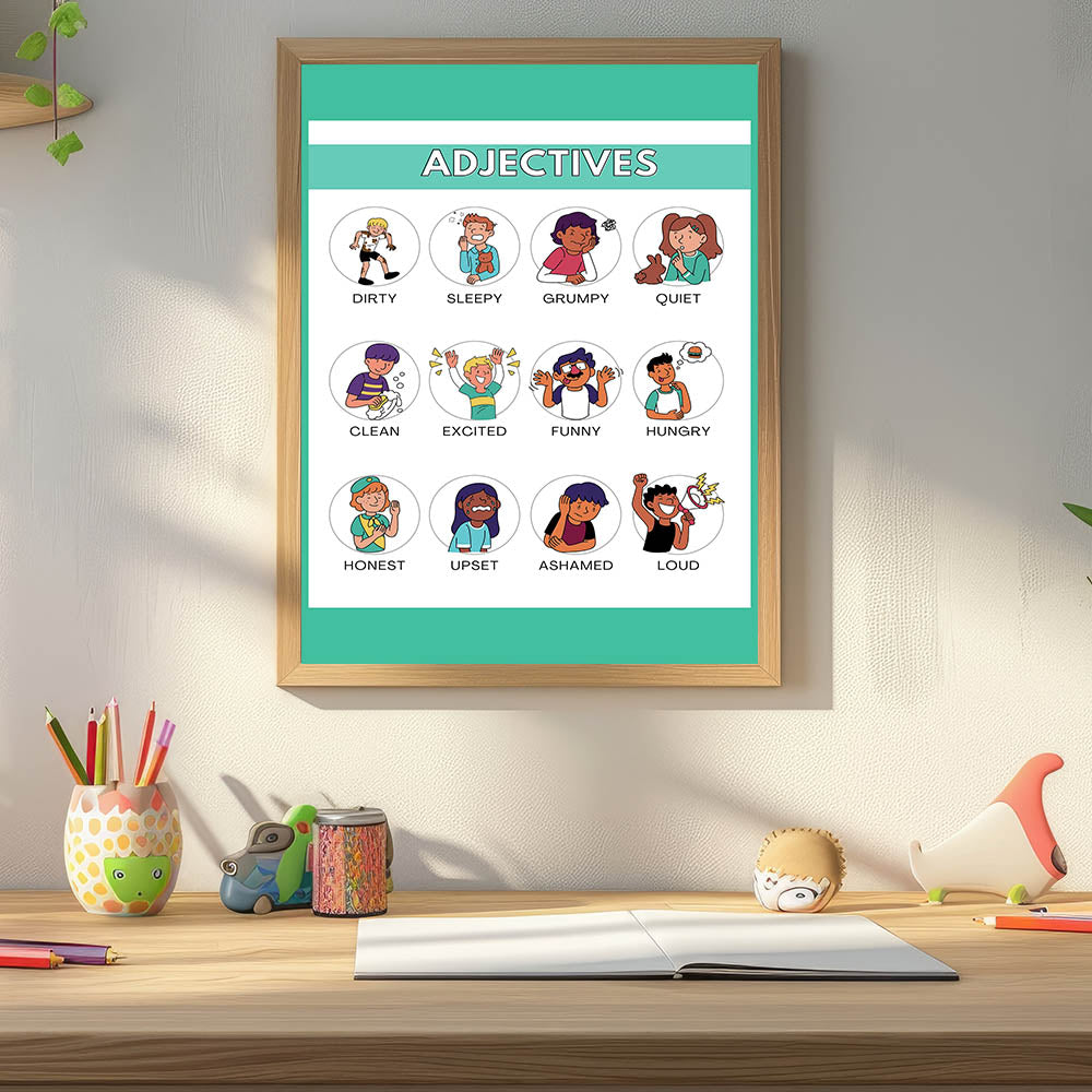 • Fun and interactive Learning Poster for Kids showcasing common adjectives.