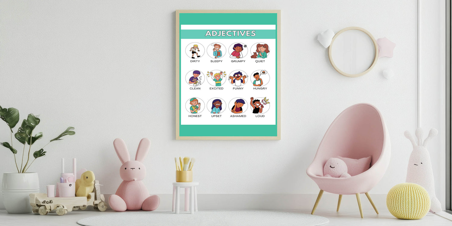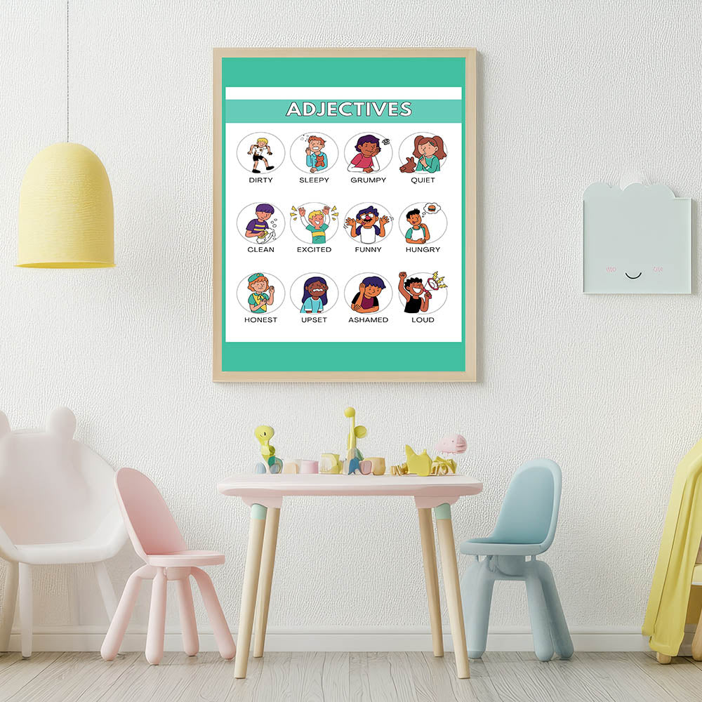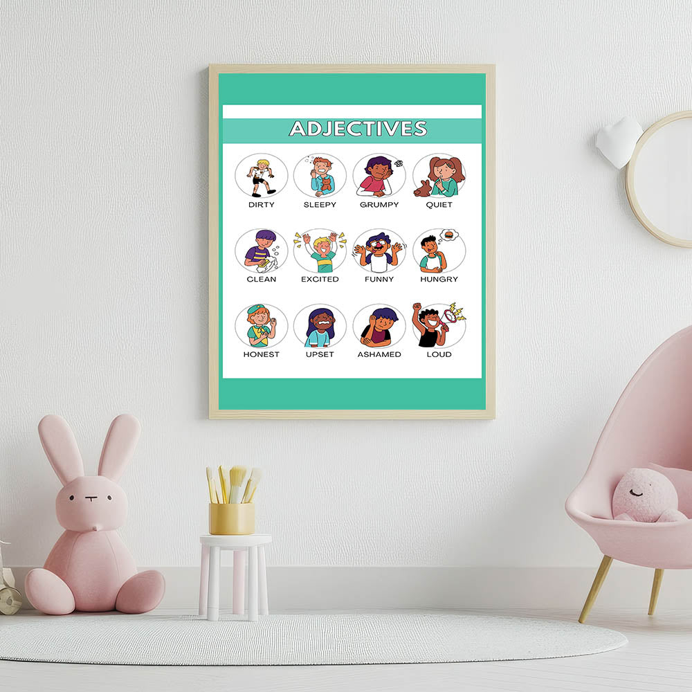 Help children expand their vocabulary with this Kids Educational Wall Art, featuring an engaging Adjectives Learning Chart. This Children’s Learning Art Print introduces essential describing words like dirty, sleepy, grumpy, quiet, excited, funny, hungry, honest, upset, ashamed, and loud, using fun illustrations that make learning interactive and engaging. Perfect for Classroom Educational Posters, nurseries, and kids' rooms, this Educational Art for Kids' Rooms supports early language development and emotional intelligence.