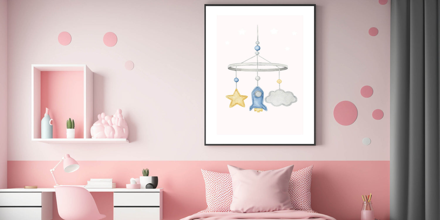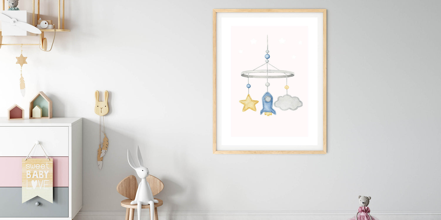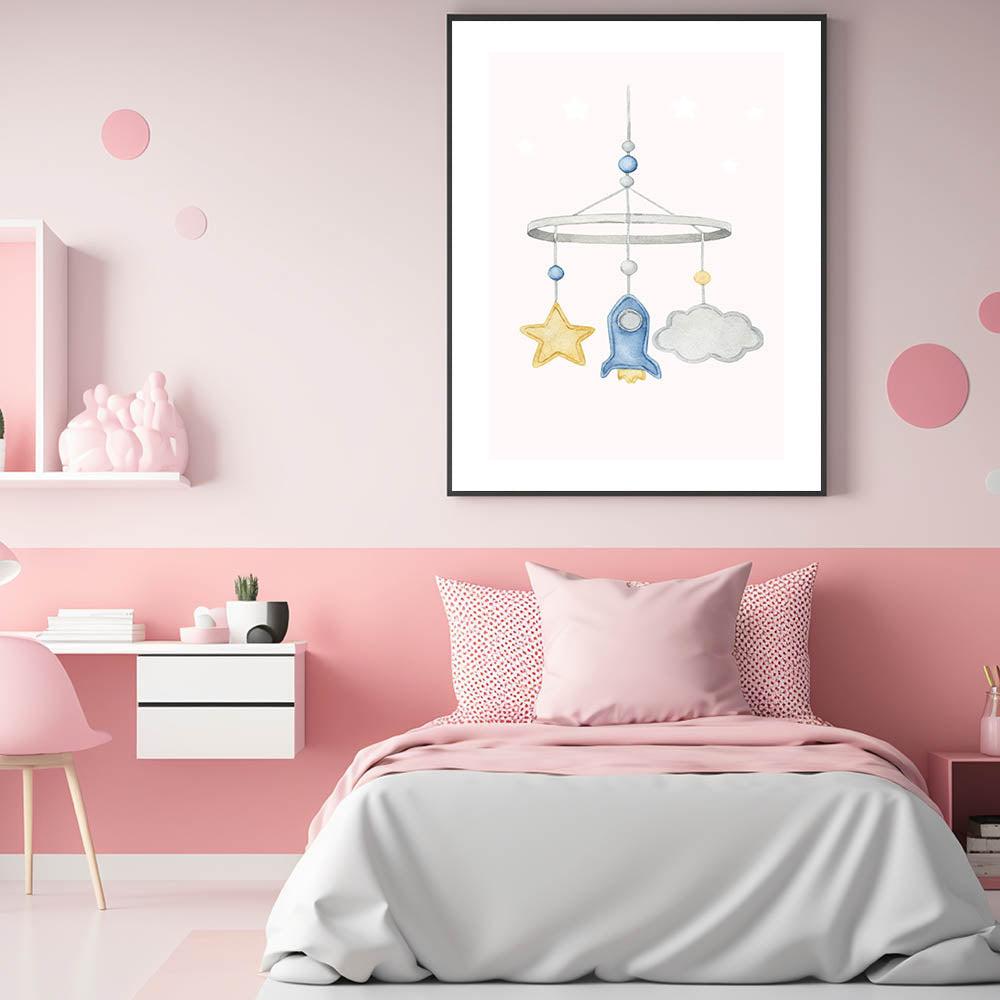 Create a dreamy atmosphere with this enchanting Kids Room Art Print featuring a watercolor baby mobile with a rocket, star, and cloud. The soft pastel hues and celestial theme bring warmth and wonder, making it a perfect addition to nurseries, playrooms, and children's bedrooms.