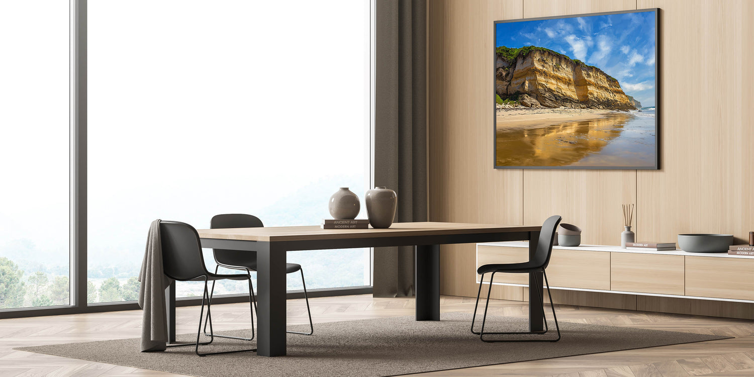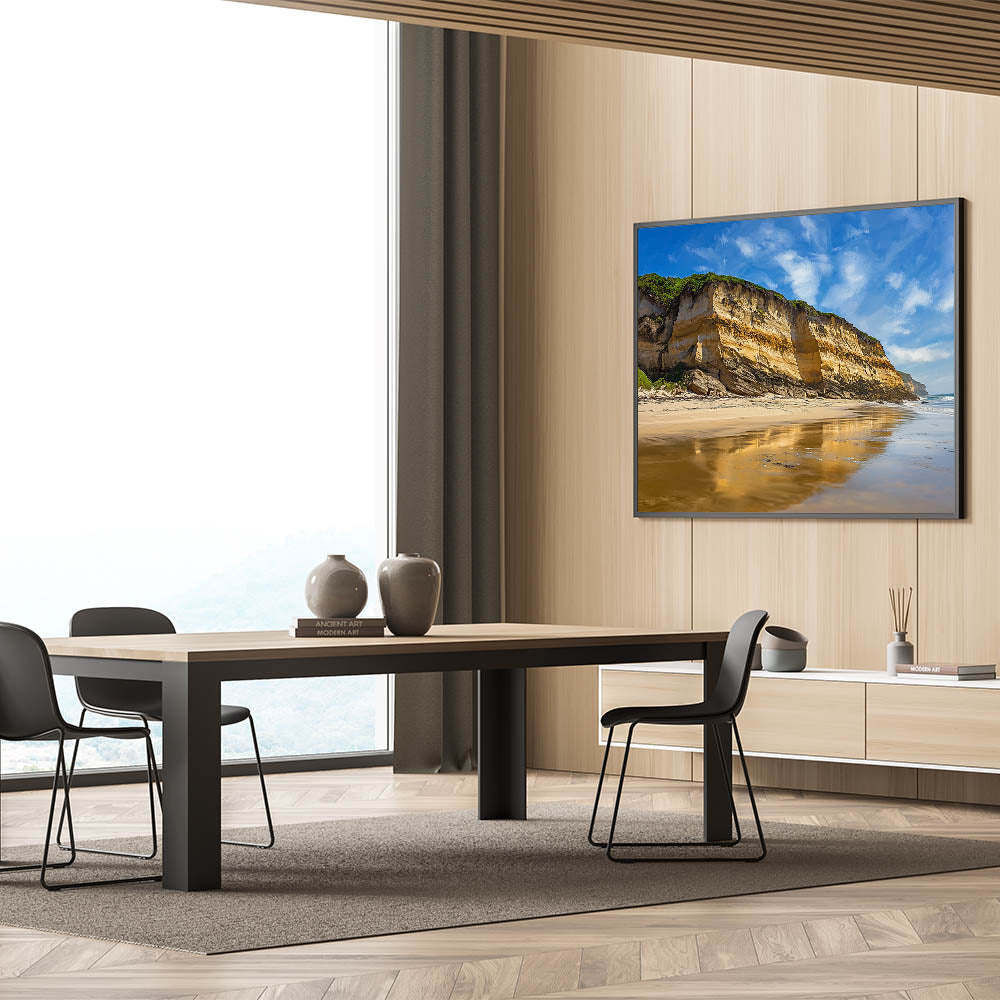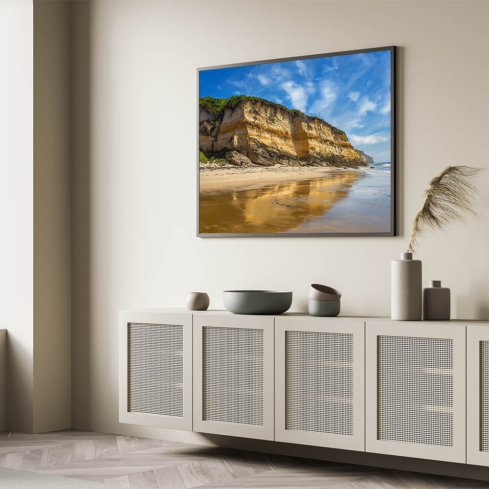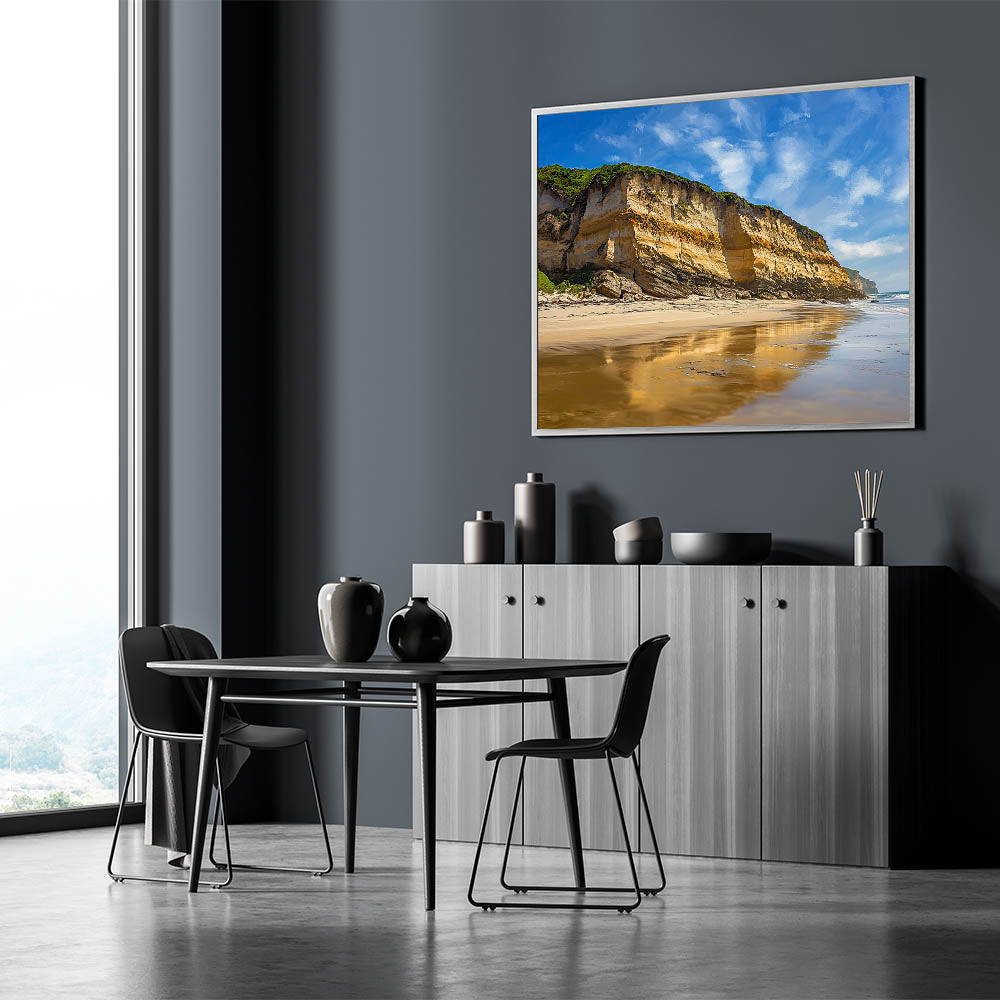 Bring the beauty of nature into your home with this landscape art cliffs design featuring golden cliffs reflected on a serene beach. The vibrant tones of the rocky cliffs contrast beautifully with the deep blue sky, creating a tranquil and picturesque coastal scene.