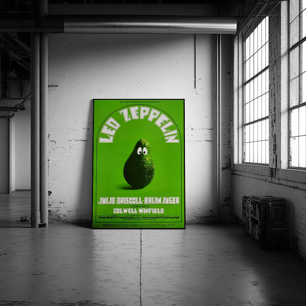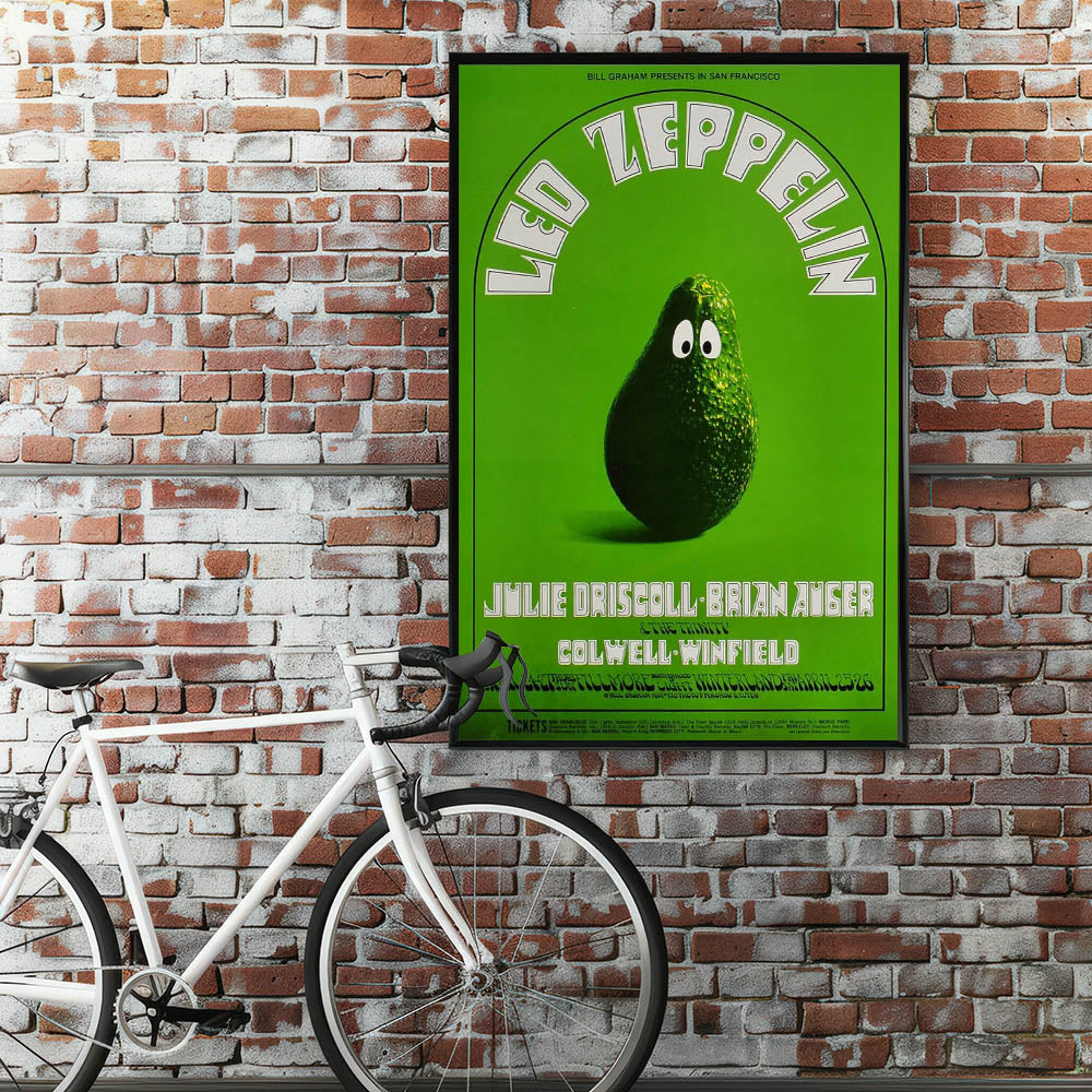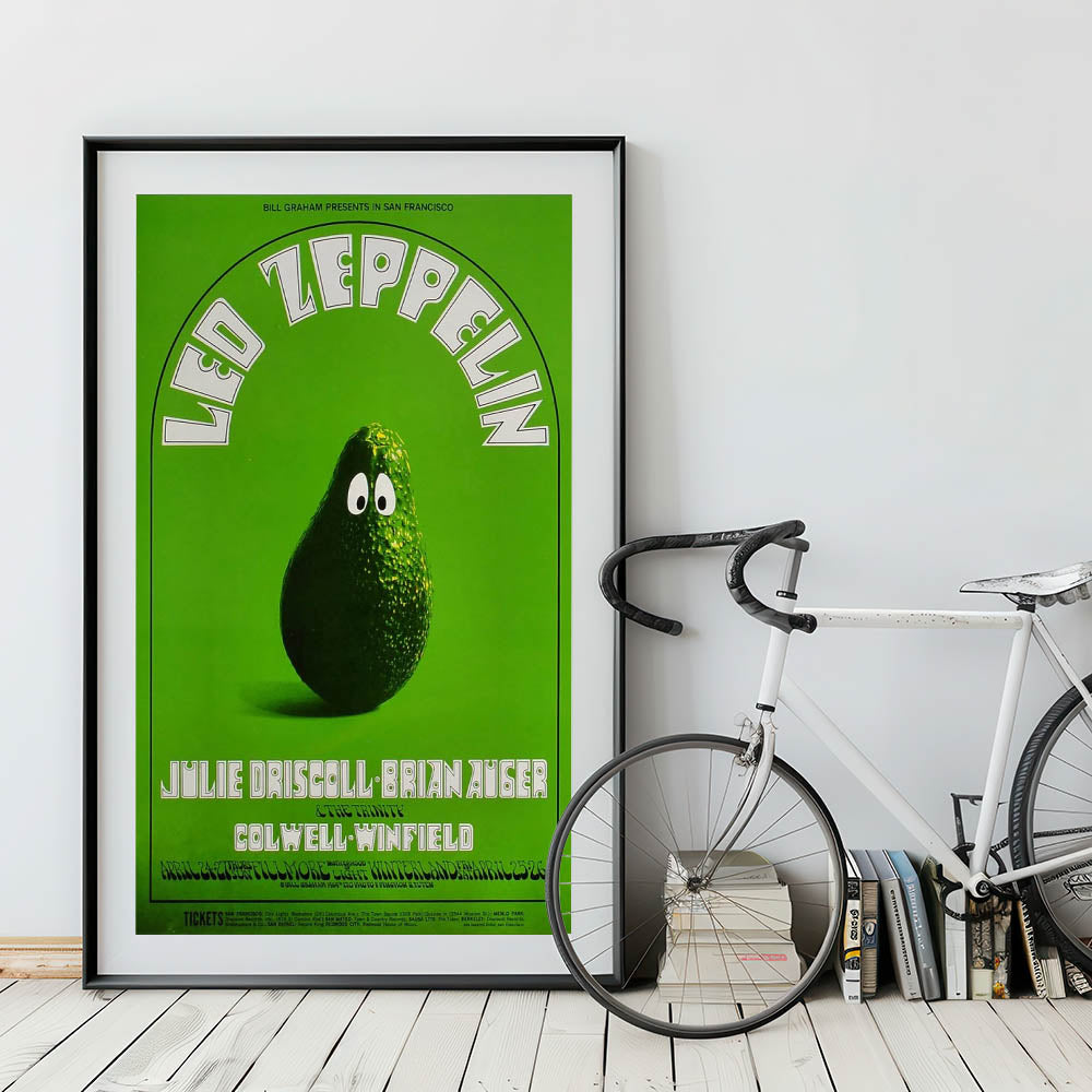 Step back in time with this unique Led Zeppelin Fillmore poster from their 1969 San Francisco performance. Featuring the quirky and iconic avocado artwork, this retro piece adds a playful yet bold touch to any music lover's collection. A fun and vibrant design that celebrates the band's early days and their rock 'n' roll energy, perfect for adding a vintage flair to your home.