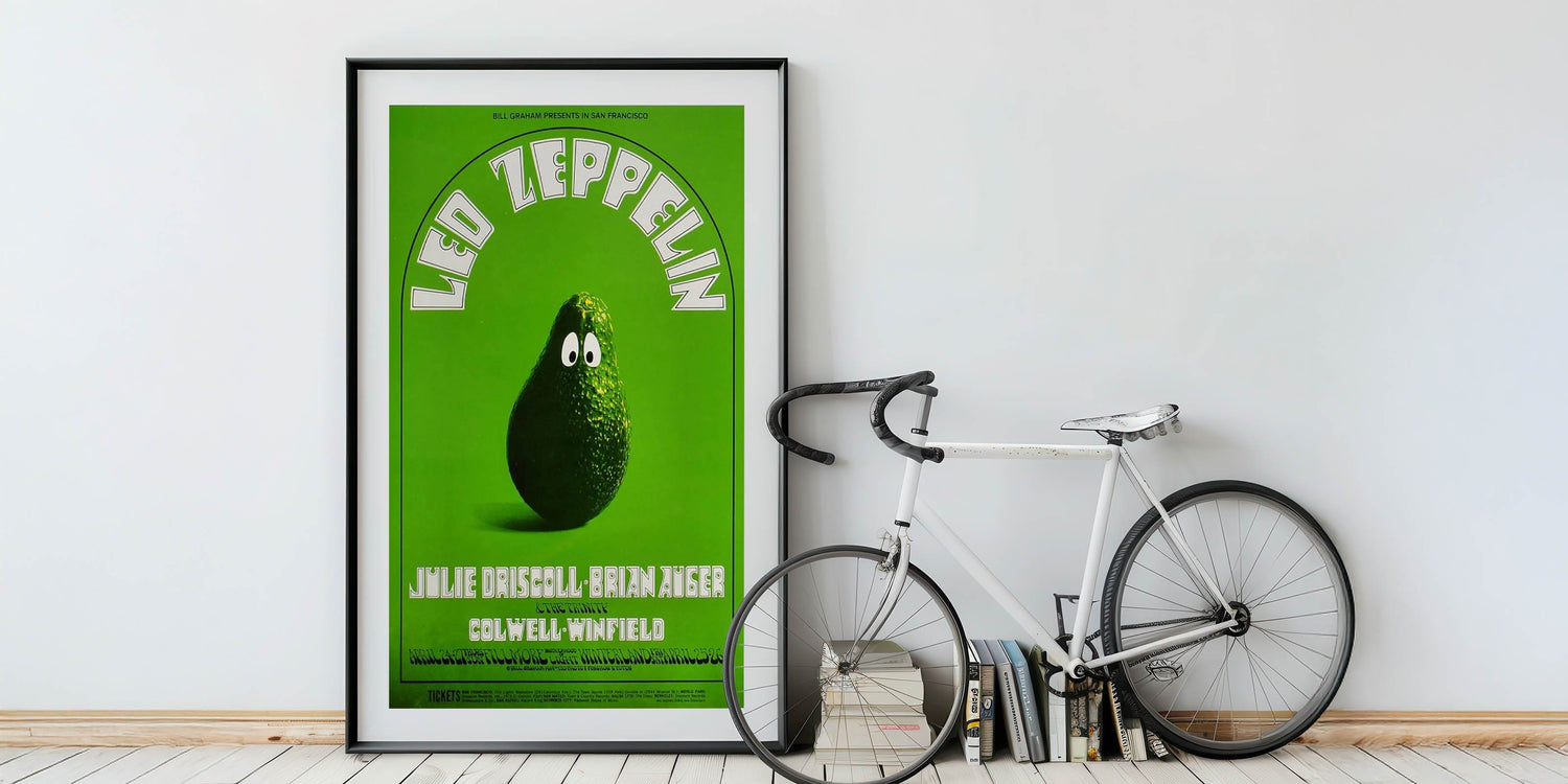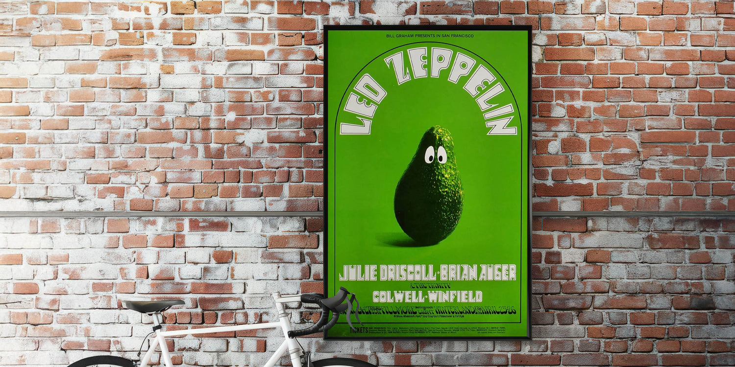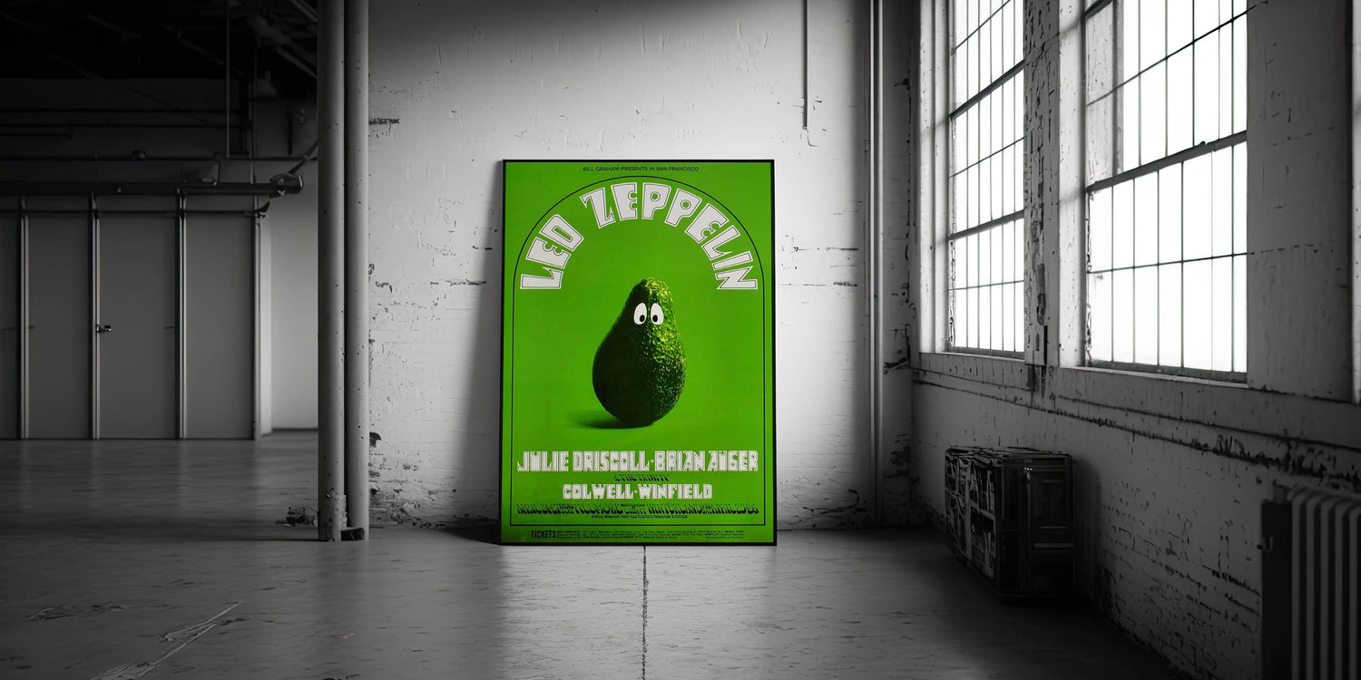 Step back in time with this unique Led Zeppelin Fillmore poster from their 1969 San Francisco performance. Featuring the quirky and iconic avocado artwork, this retro piece adds a playful yet bold touch to any music lover's collection. A fun and vibrant design that celebrates the band's early days and their rock 'n' roll energy, perfect for adding a vintage flair to your home.