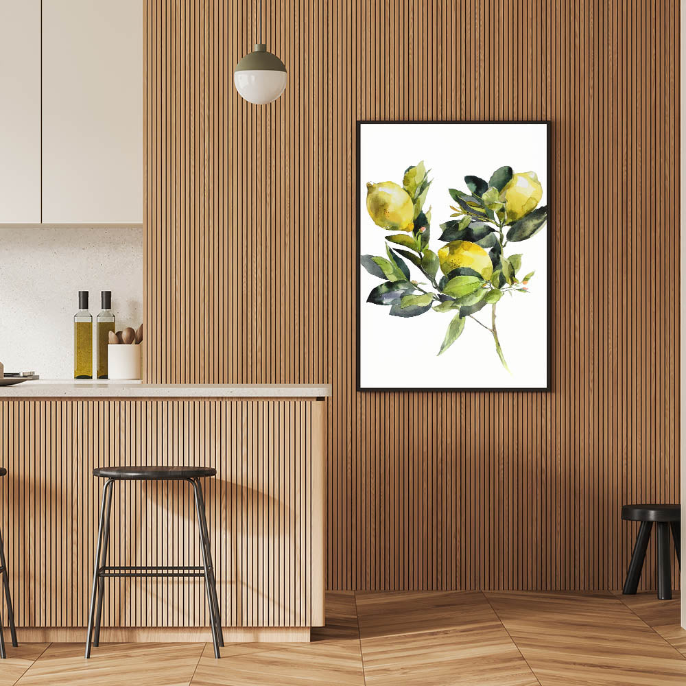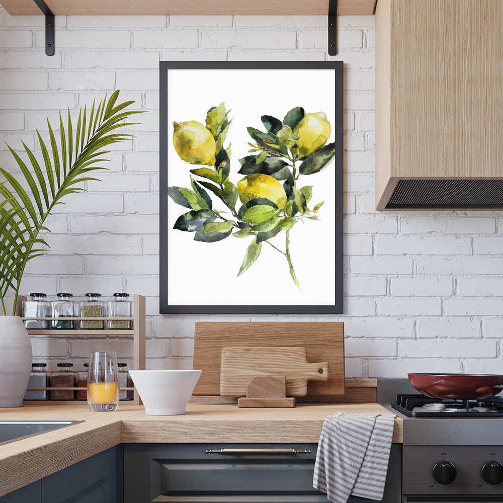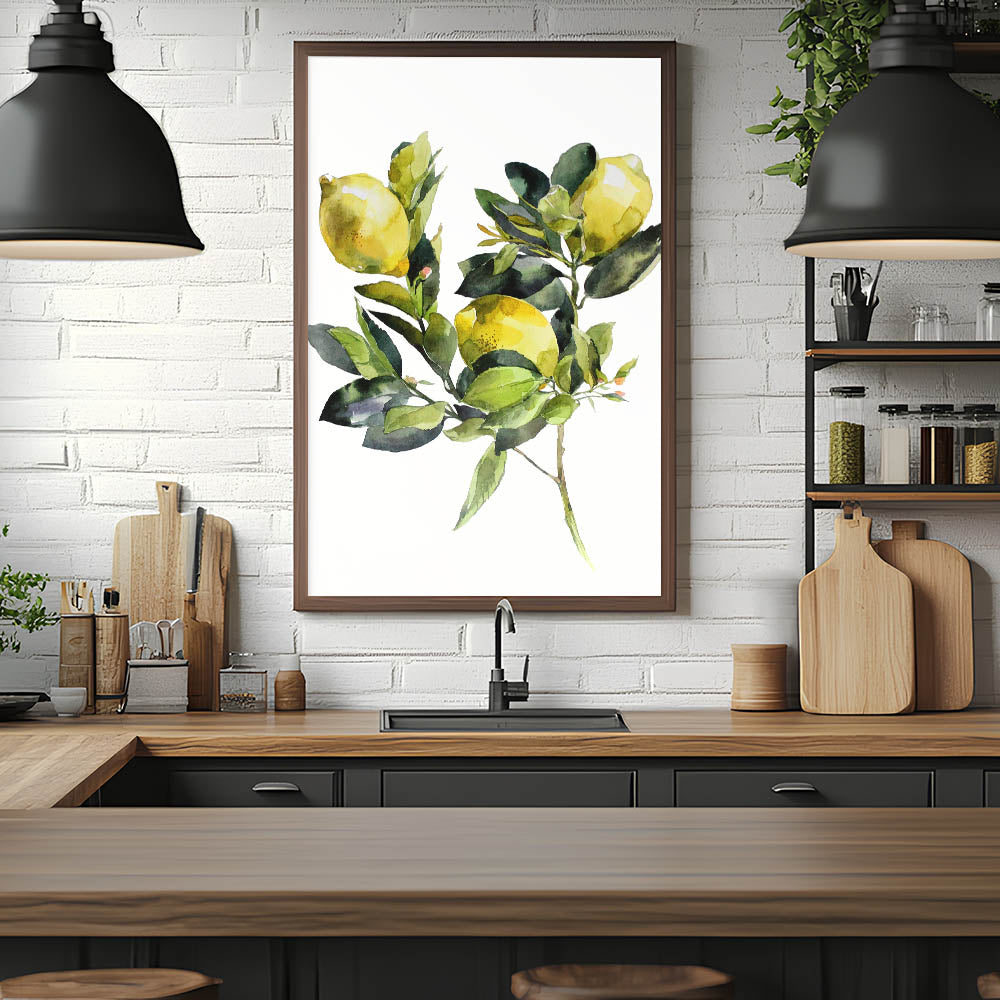 Brighten up your home with this fruit-themed wall art, featuring a stunning botanical watercolor illustration of ripe lemons on a leafy branch. The delicate brushstrokes and fresh color palette make this fruit illustration print a perfect choice for kitchens, dining areas, and farmhouse-inspired interiors. The lively combination of vibrant yellow and lush green creates a refreshing, nature-inspired look.
