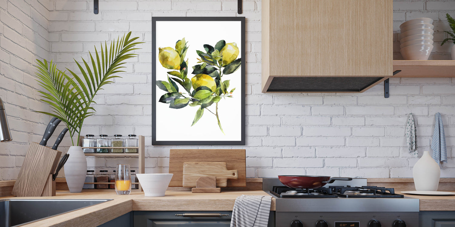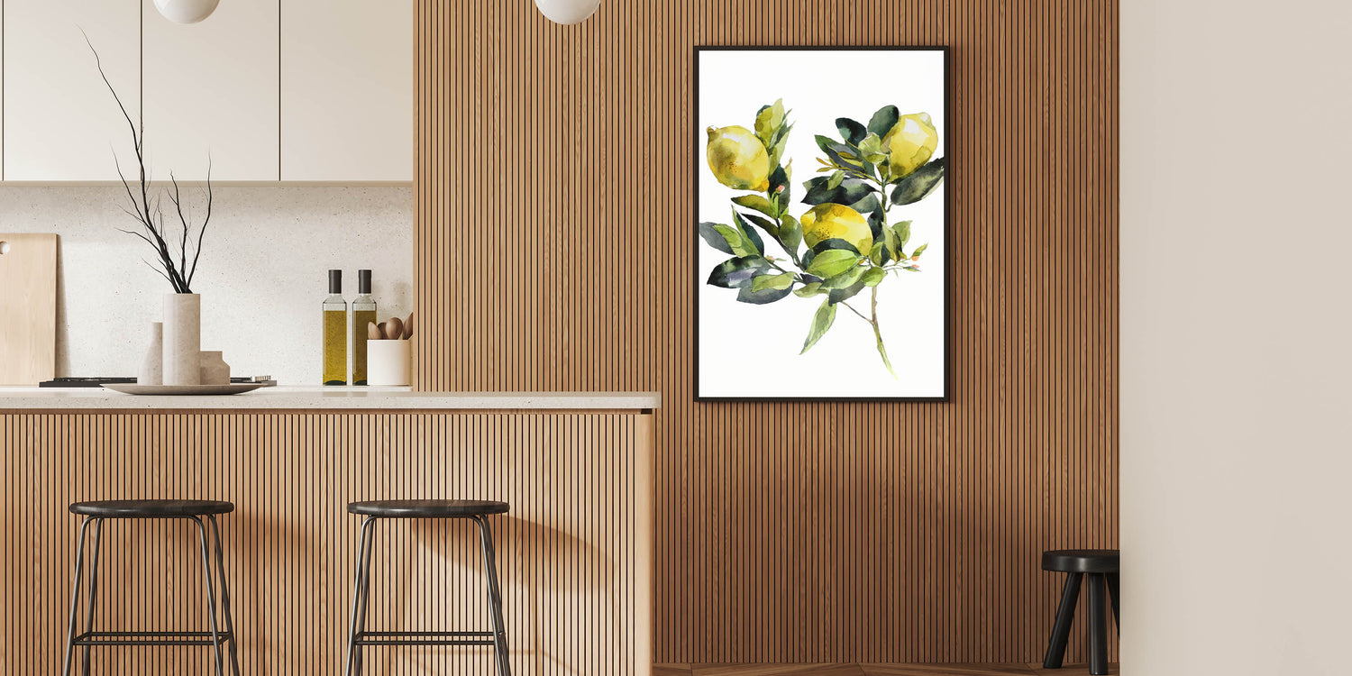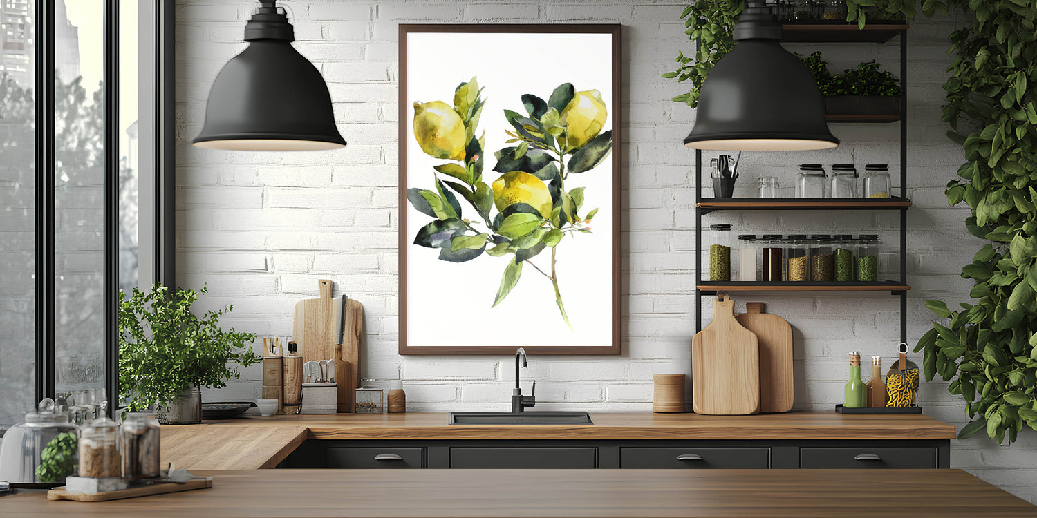Brighten up your home with this fruit-themed wall art, featuring a stunning botanical watercolor illustration of ripe lemons on a leafy branch. The delicate brushstrokes and fresh color palette make this fruit illustration print a perfect choice for kitchens, dining areas, and farmhouse-inspired interiors. The lively combination of vibrant yellow and lush green creates a refreshing, nature-inspired look.