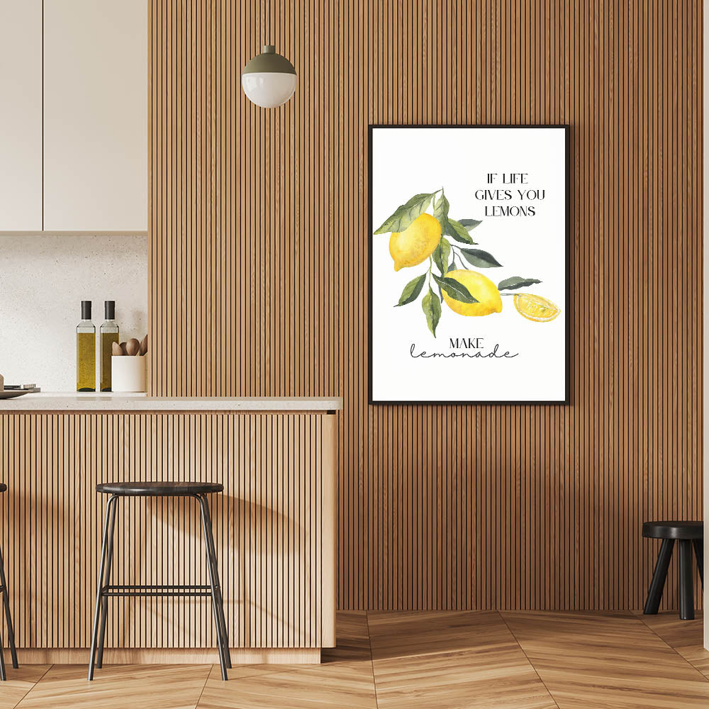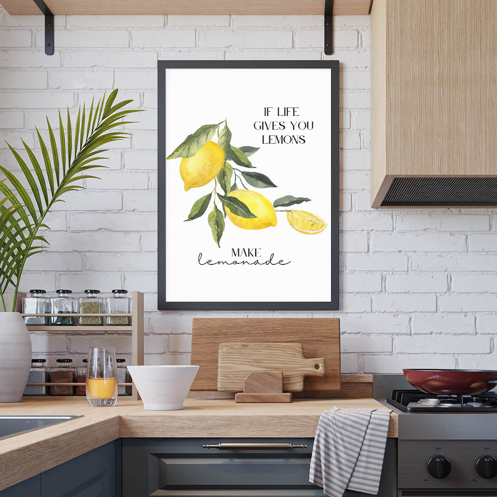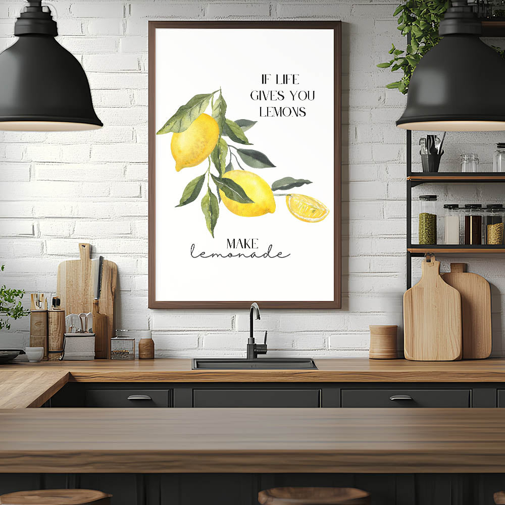 Add a refreshing and uplifting touch to your kitchen with this fruit-themed wall art featuring bright lemons and the motivational quote, "If life gives you lemons, make lemonade." This fruit illustration print blends cheerful colors with a positive message, making it a perfect addition to fruit kitchen art collections. Whether displayed in a dining area, cafe, or home kitchen, this fruit watercolor art brings energy and charm to any space.