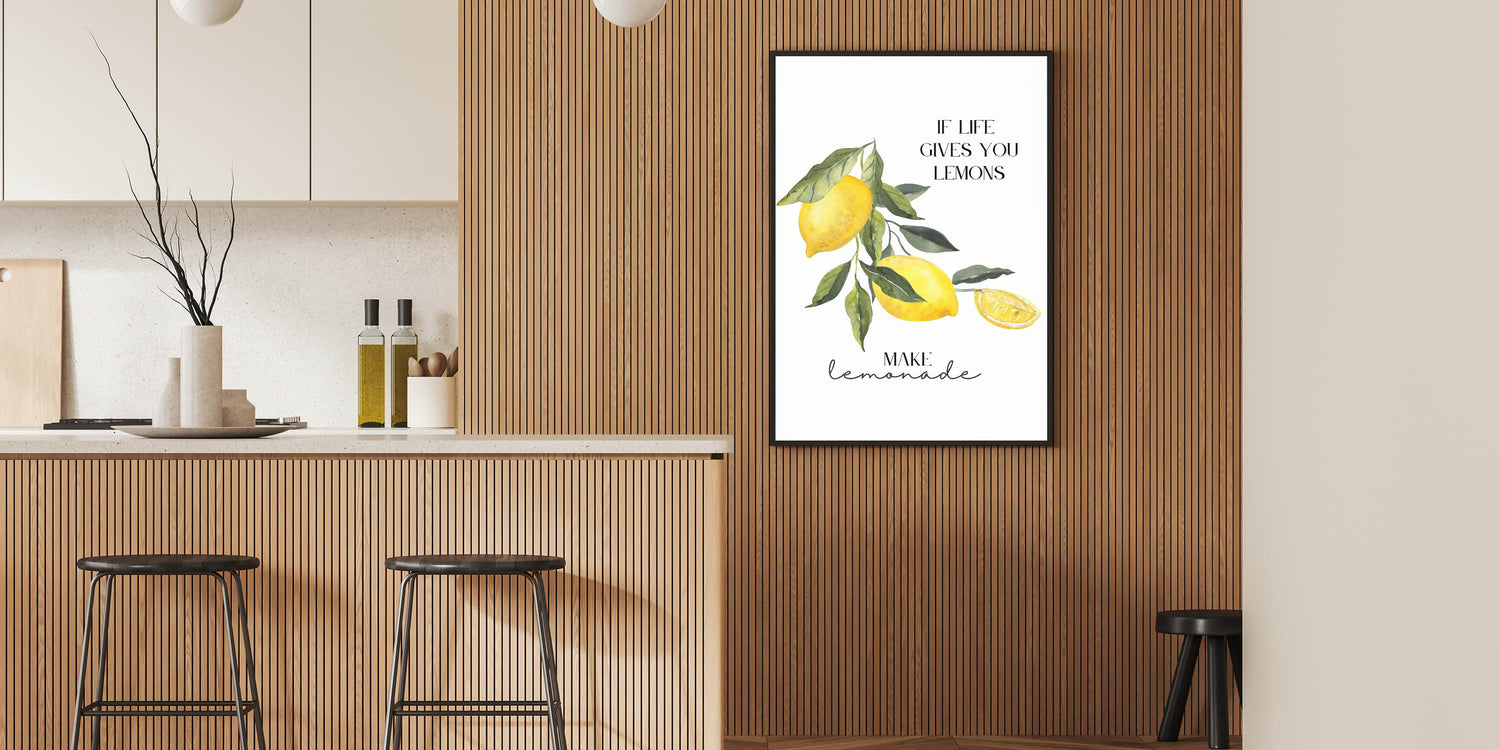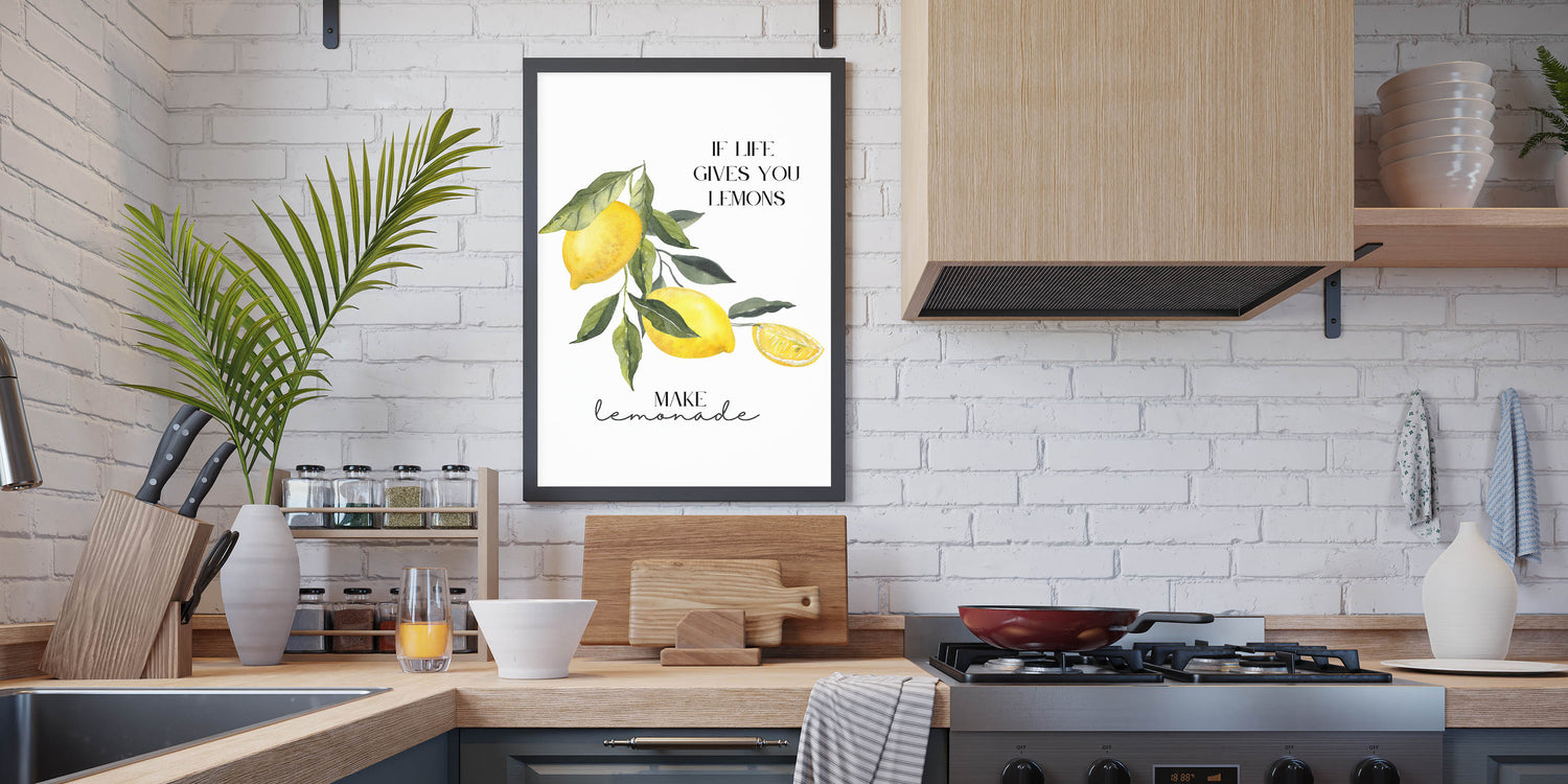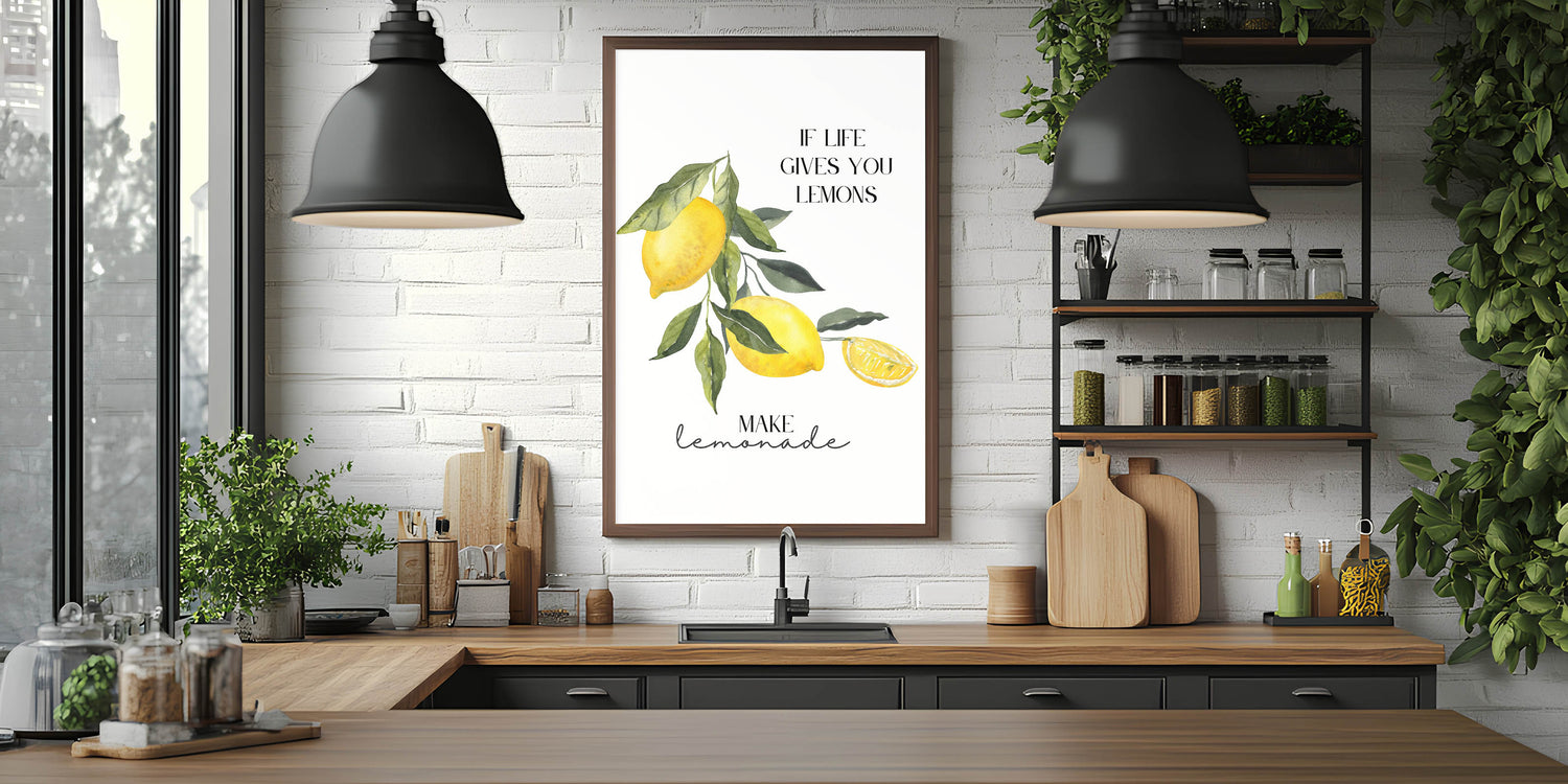 Add a refreshing and uplifting touch to your kitchen with this fruit-themed wall art featuring bright lemons and the motivational quote, "If life gives you lemons, make lemonade." This fruit illustration print blends cheerful colors with a positive message, making it a perfect addition to fruit kitchen art collections. Whether displayed in a dining area, cafe, or home kitchen, this fruit watercolor art brings energy and charm to any space.