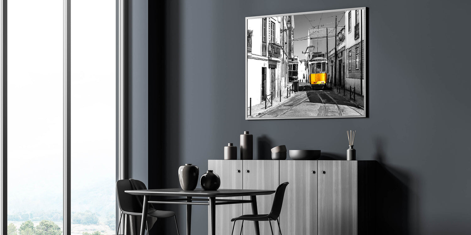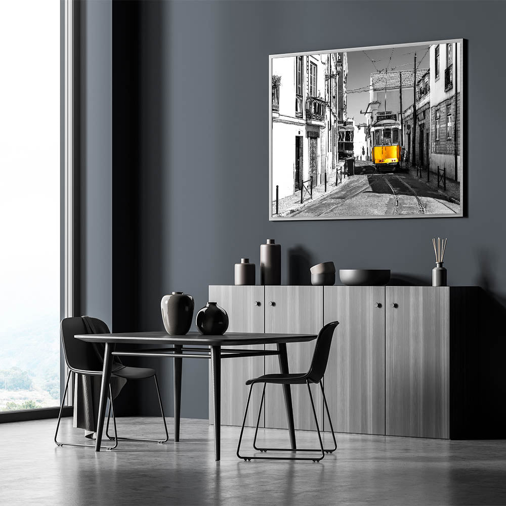 Lisbon Wall Art - Iconic Tram 28 in Black and White with Yellow Accent