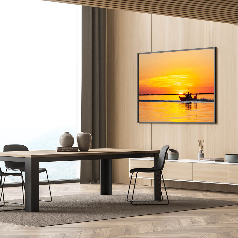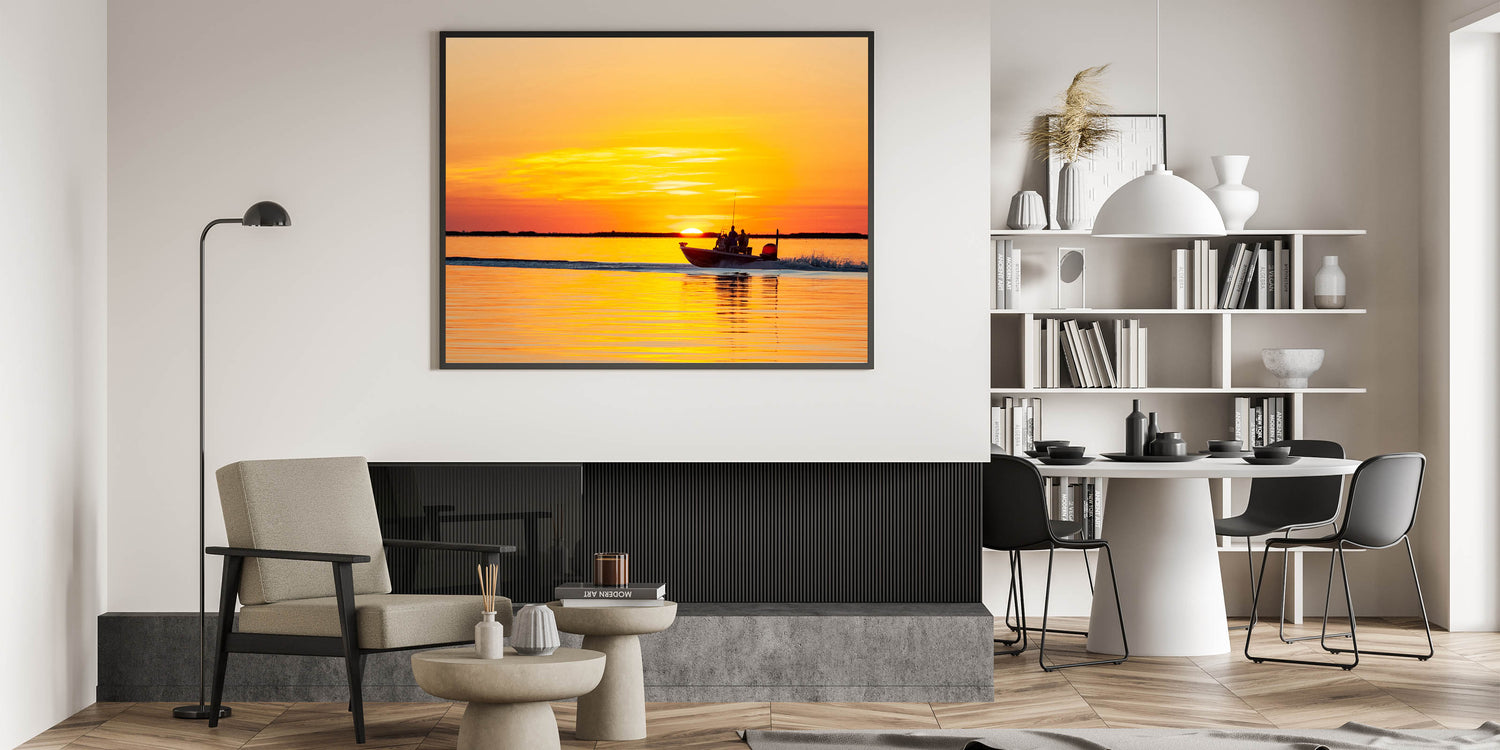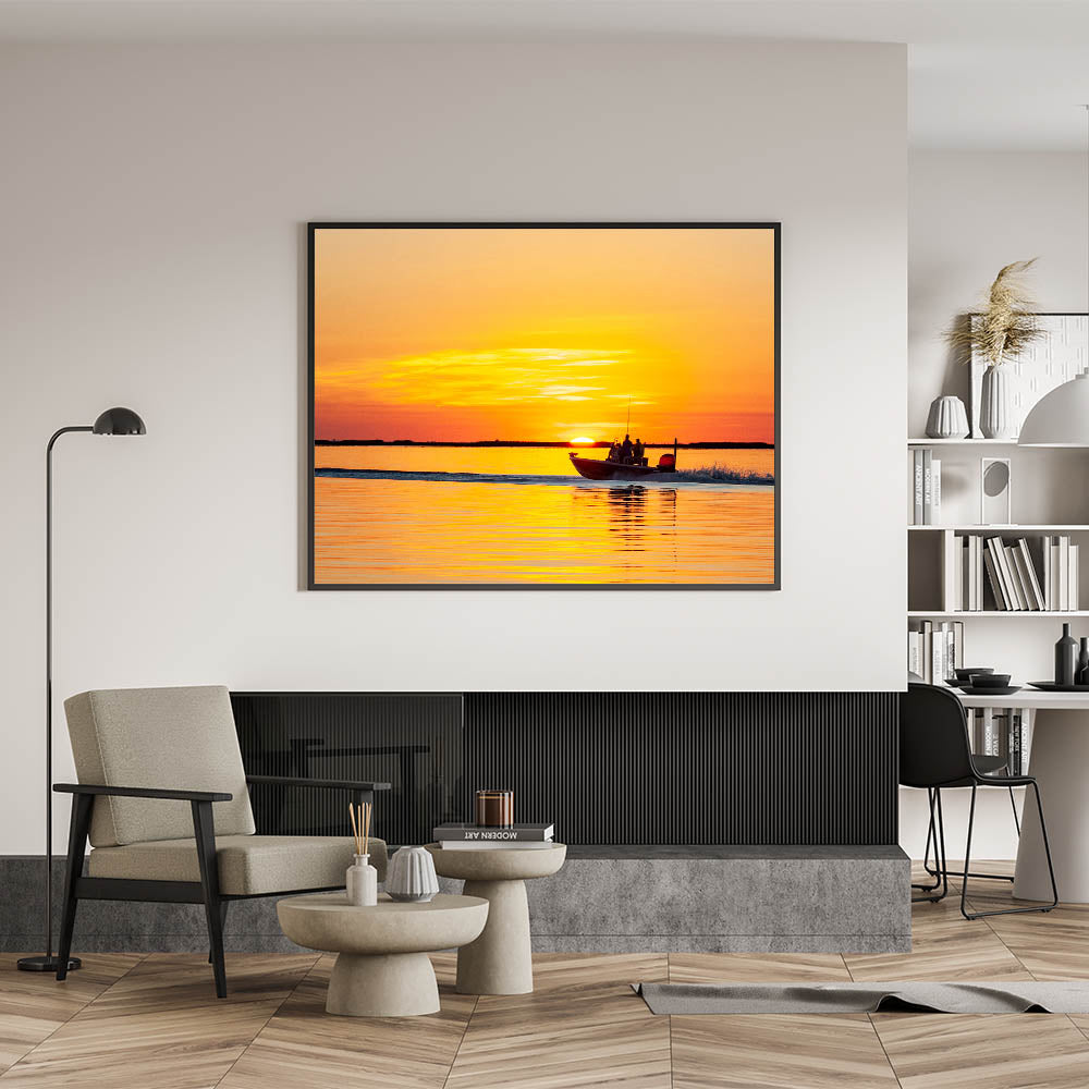 Capture the spirit of Louisiana’s coastal lifestyle with this breathtaking wall art, featuring a vivid sunset and a serene fishing boat skimming across the water. The warm, golden hues of the sky perfectly reflect on the calm waters, creating an atmosphere of tranquility and adventure. This piece from our Louisiana Coastal and Marshland Photography collection celebrates the connection between nature and the people who live and work along Louisiana’s waters.