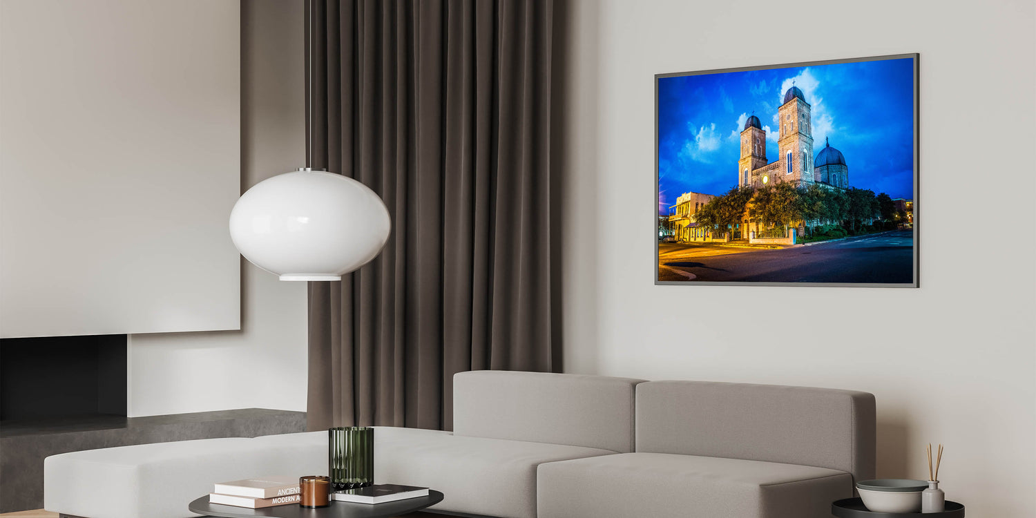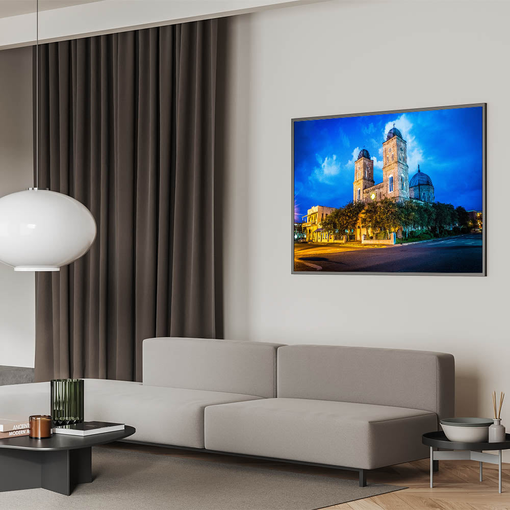 Celebrate the rich architectural history of Louisiana with this vibrant wall art featuring a historic church illuminated against a deep blue twilight sky. The glowing lights cast a warm hue over the building’s detailed brickwork, creating a beautiful contrast with the dramatic evening sky. This artwork captures both the cultural and architectural essence of Louisiana, making it a perfect addition for lovers of historic and scenic art.