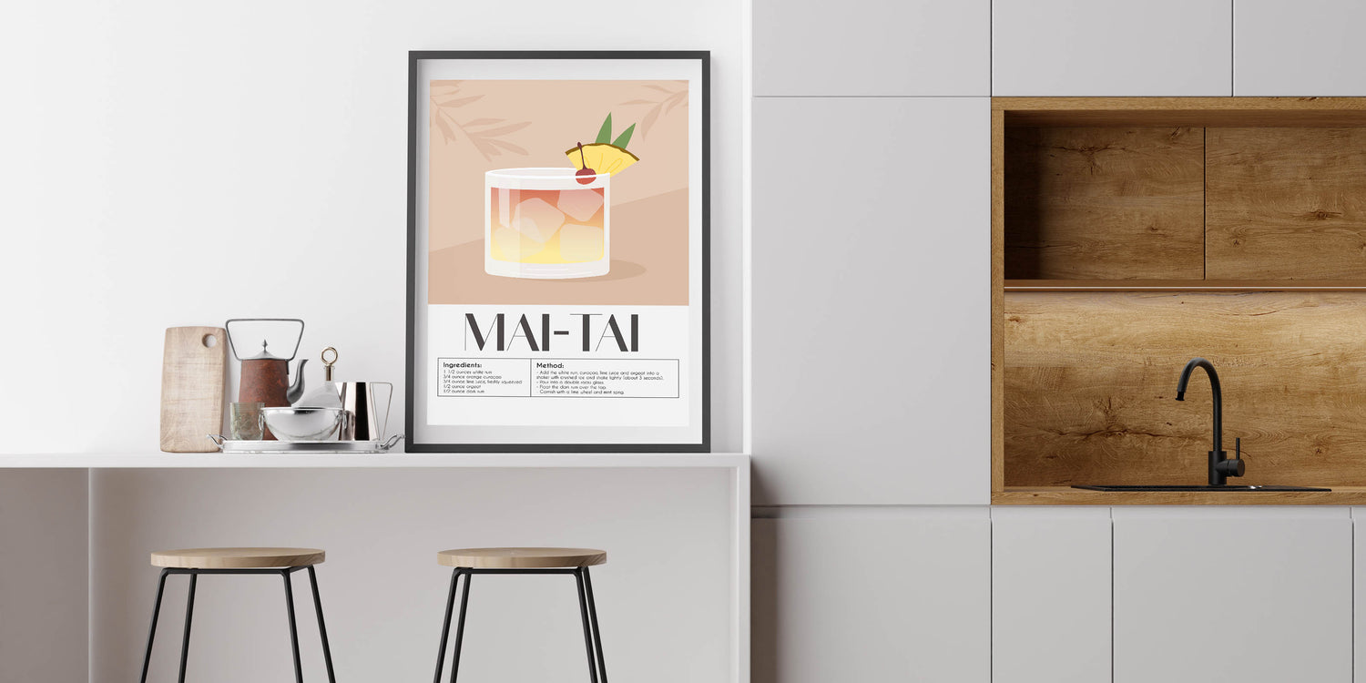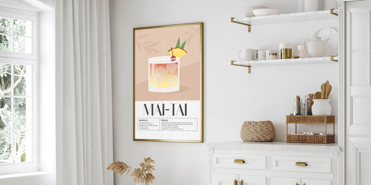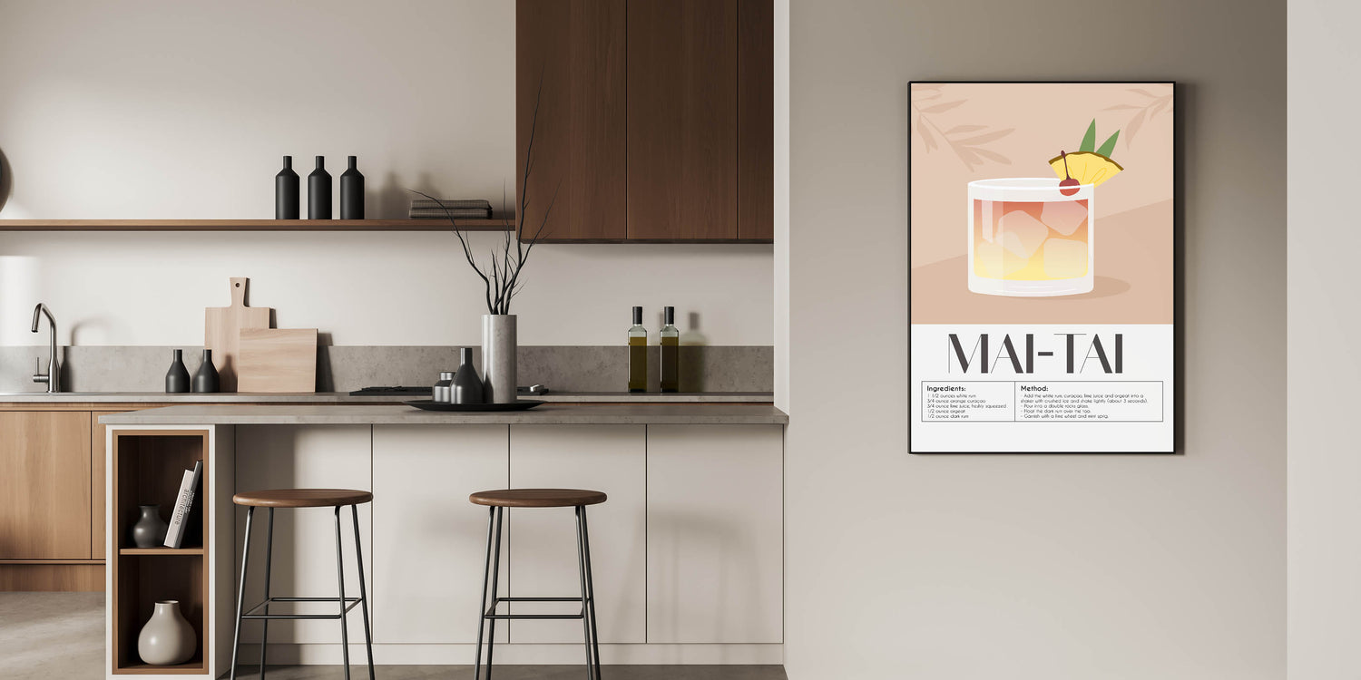Celebrate the art of mixology with this Mai Tai cocktail recipe wall art. Featuring a minimalist and modern illustration, this drink-themed art print highlights the refreshing and tropical Mai Tai cocktail, complete with its classic ingredients and method. Perfect for bars, kitchens, lounges, or dining spaces, this beverage wall art brings a sophisticated touch to your decor.