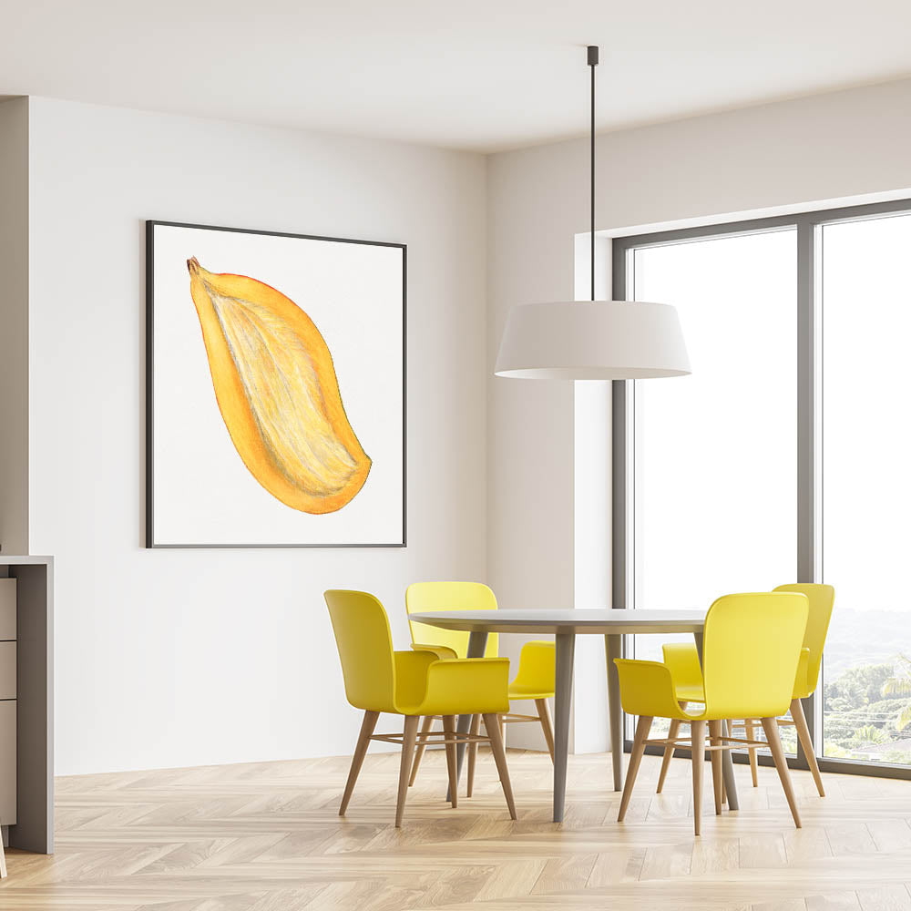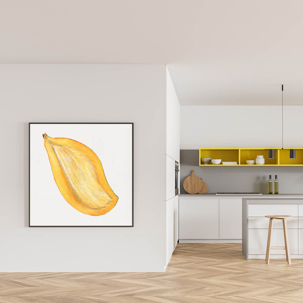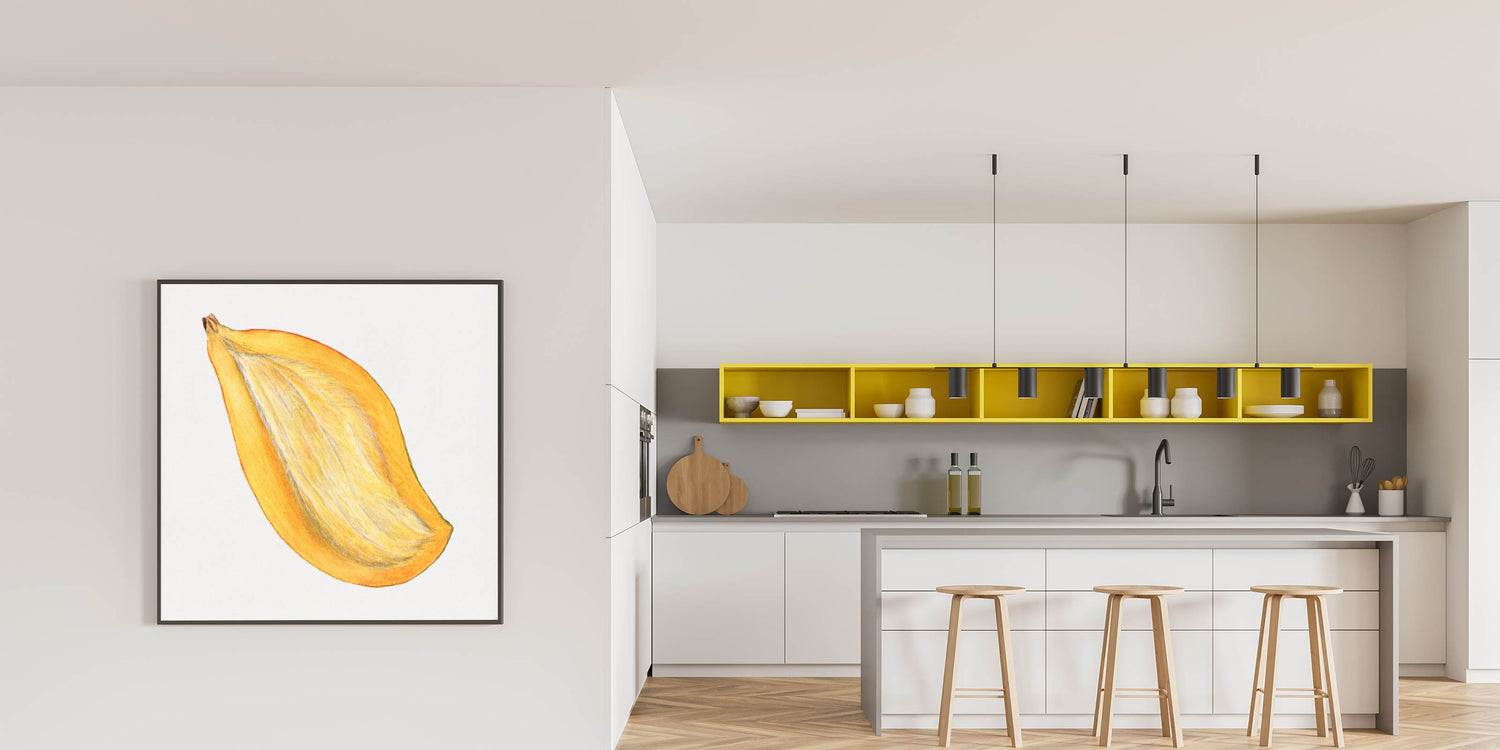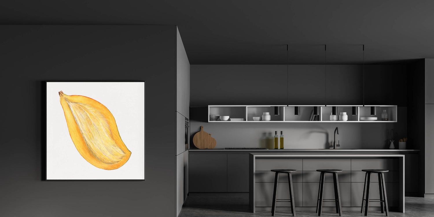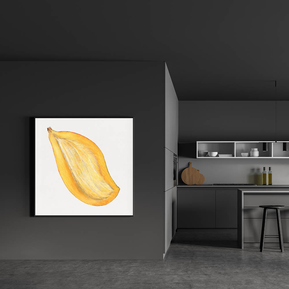 Brighten your space with this fruit-themed wall art featuring a beautifully detailed mango slice. This fruit illustration print showcases the rich golden tones and natural textures of ripe mango, making it a perfect addition to fruit kitchen art collections. Whether displayed in a dining area, cafe, or tropical-themed kitchen, this fruit watercolor art brings warmth and vibrancy to any setting.