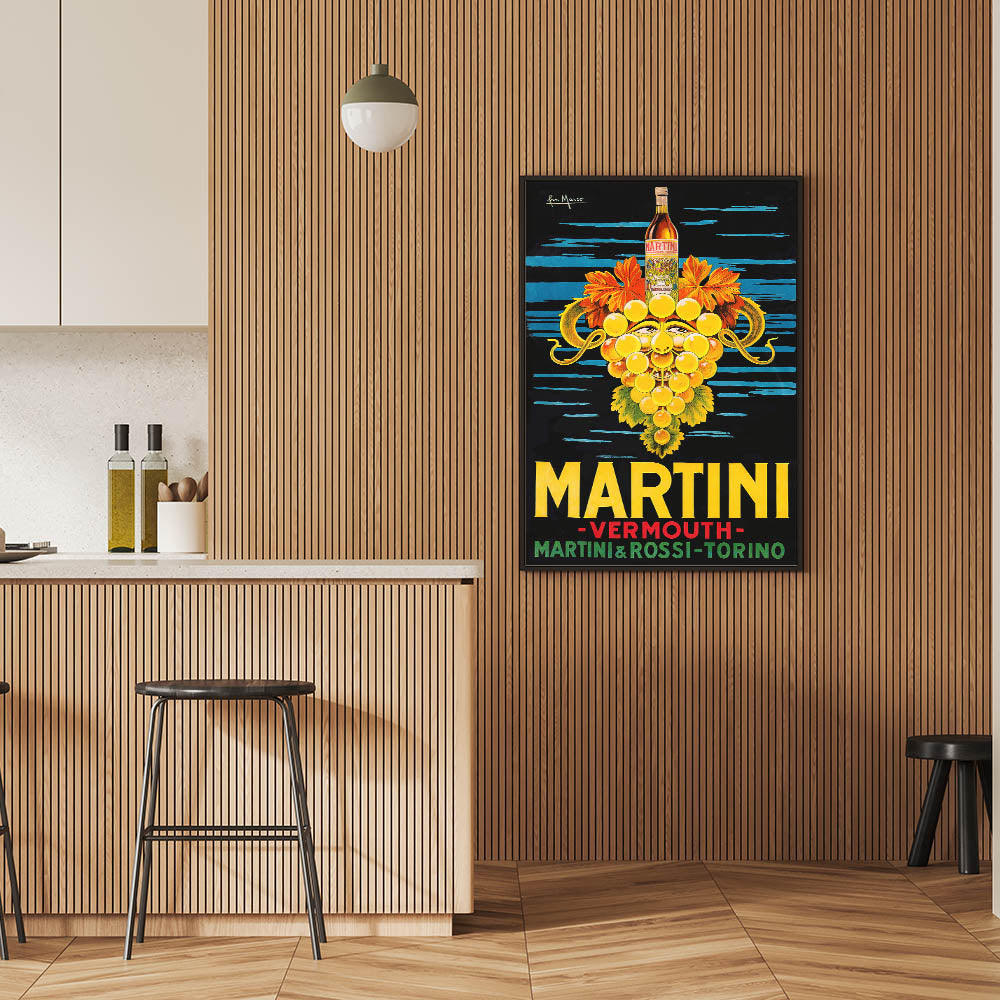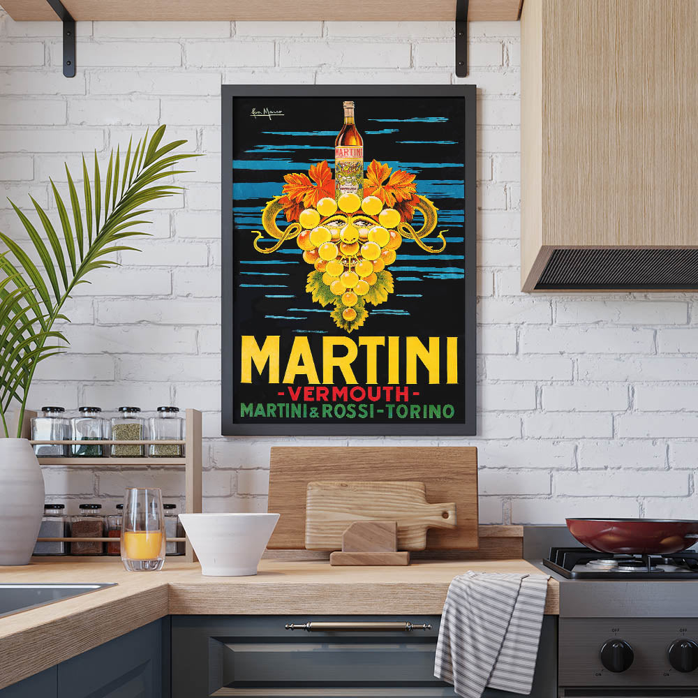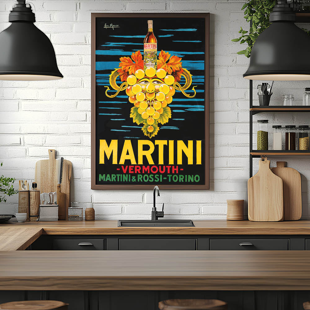 Add a bold and artistic touch to your space with this Martini & Rossi Vermouth vintage wall art. Featuring a striking Art Deco-style design, this drink-themed art print showcases a surreal, grape-faced character with a bottle of Martini Vermouth, vibrant colors, and classic typography. The deep black and blue background contrasts with the gold, yellow, and red details, making it a perfect statement piece for any bar, kitchen, lounge, or restaurant.