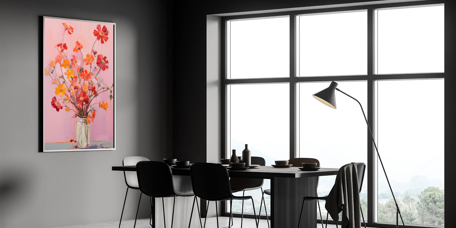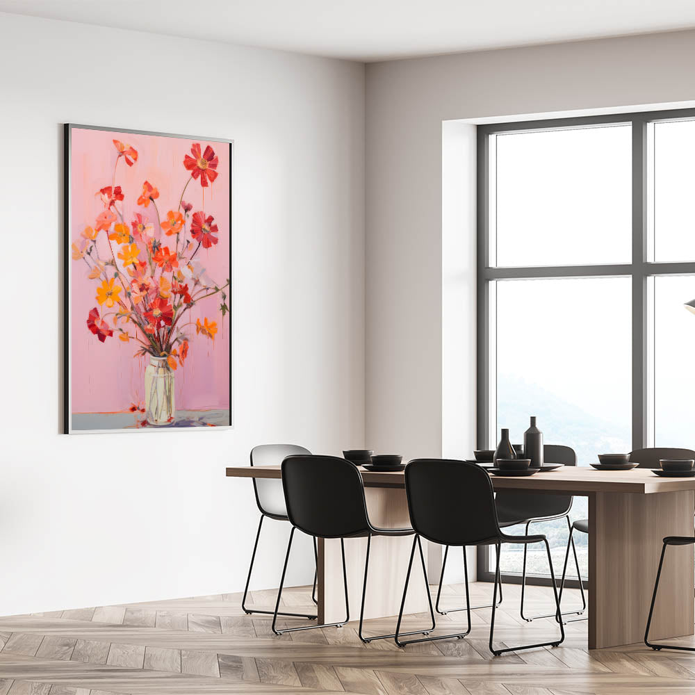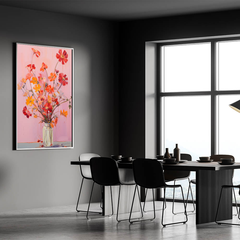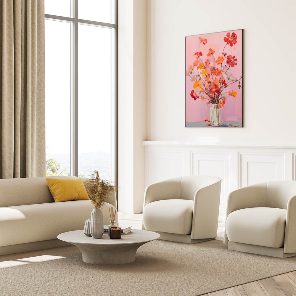Brighten your home with this bold maximalist floral wall art, featuring a vibrant bouquet of red, orange, and yellow flowers arranged in a classic white vase. The lively color palette contrasts beautifully with the soft pink background, creating a visually striking piece that adds warmth and energy to any space. Perfect for those who love expressive and eclectic designs, this artwork brings a sense of vibrancy and freshness to any room.