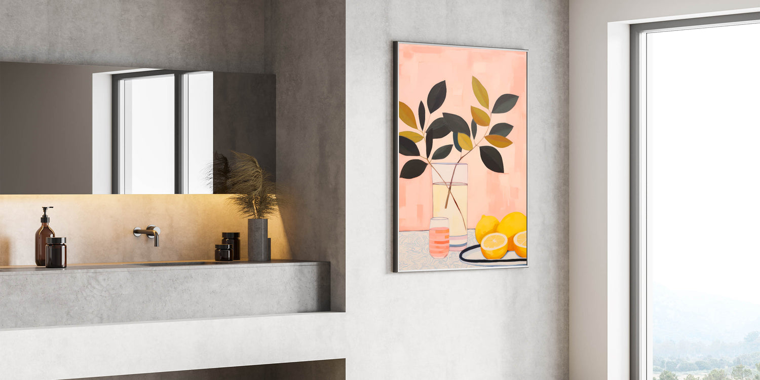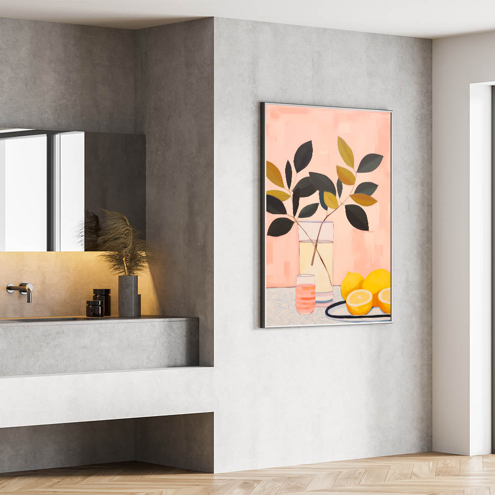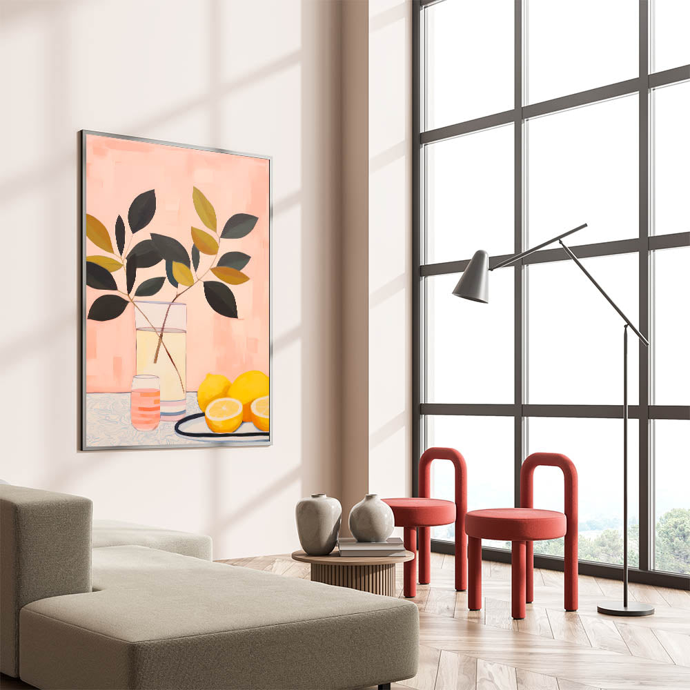 Elevate your home decor with this refreshing maximalist still life wall art featuring a composition of bold, dark green and yellow leaves in a tall glass vase, accompanied by a tray of bright yellow lemons. Set against a pastel pink background, this artwork brings a touch of warmth and zest to any space. The soft colors paired with the lively elements create a visually pleasing contrast, adding an inviting and stylish touch to your decor.