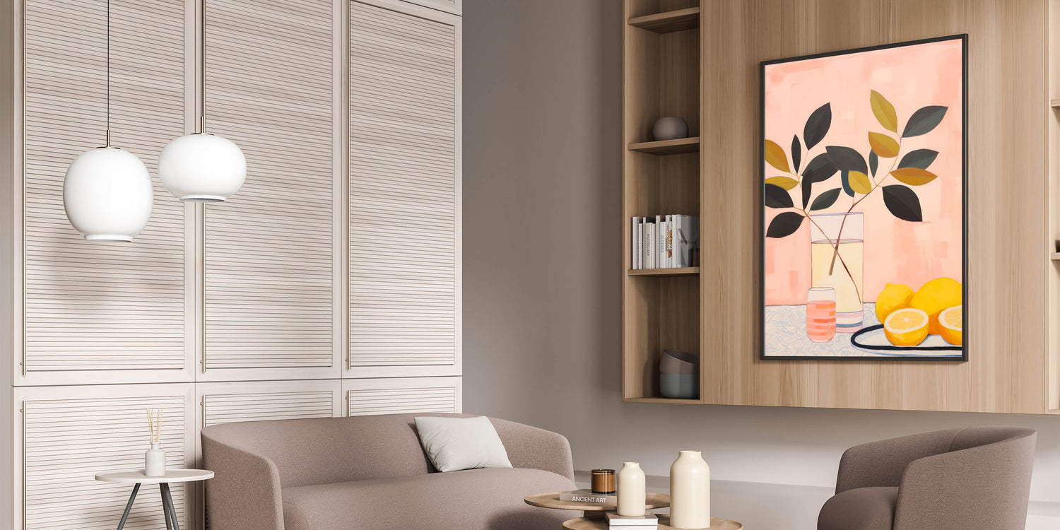 Maximalist Still Life Wall Art with Bold Leaves, Lemons, and Pastel Pink