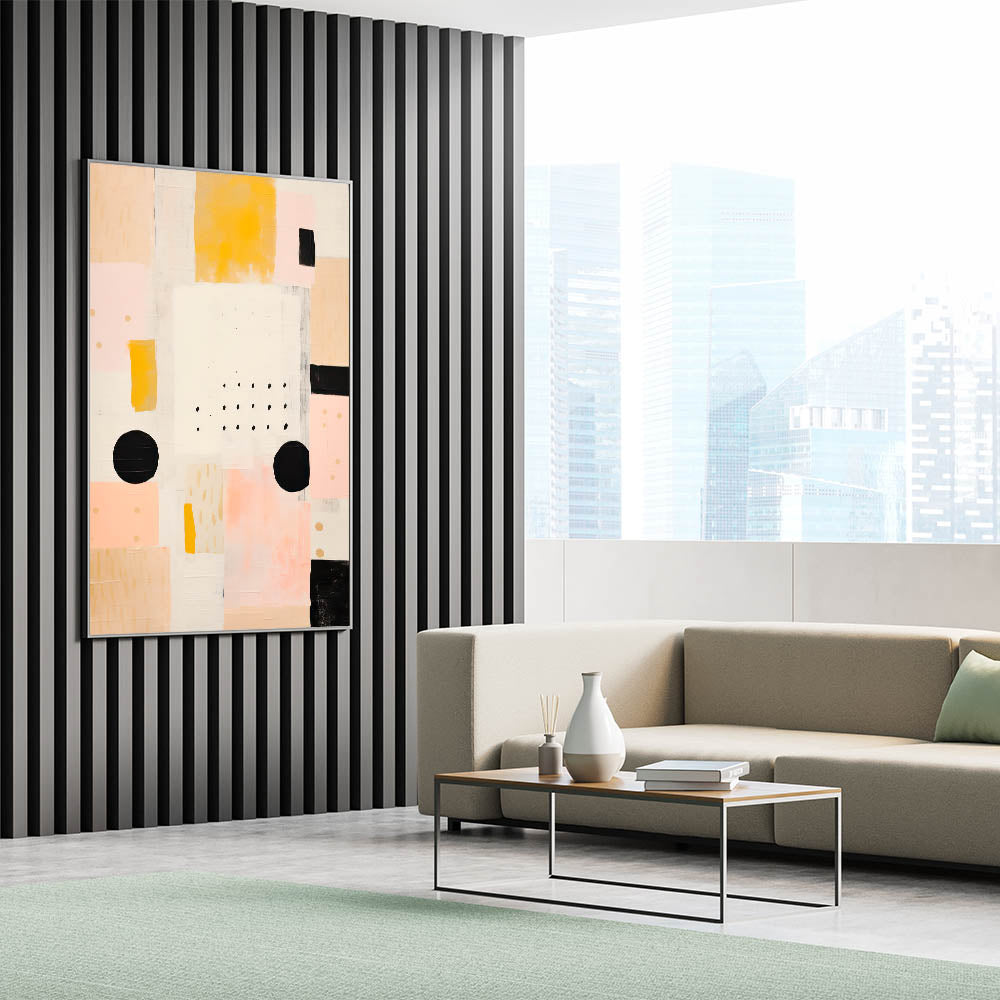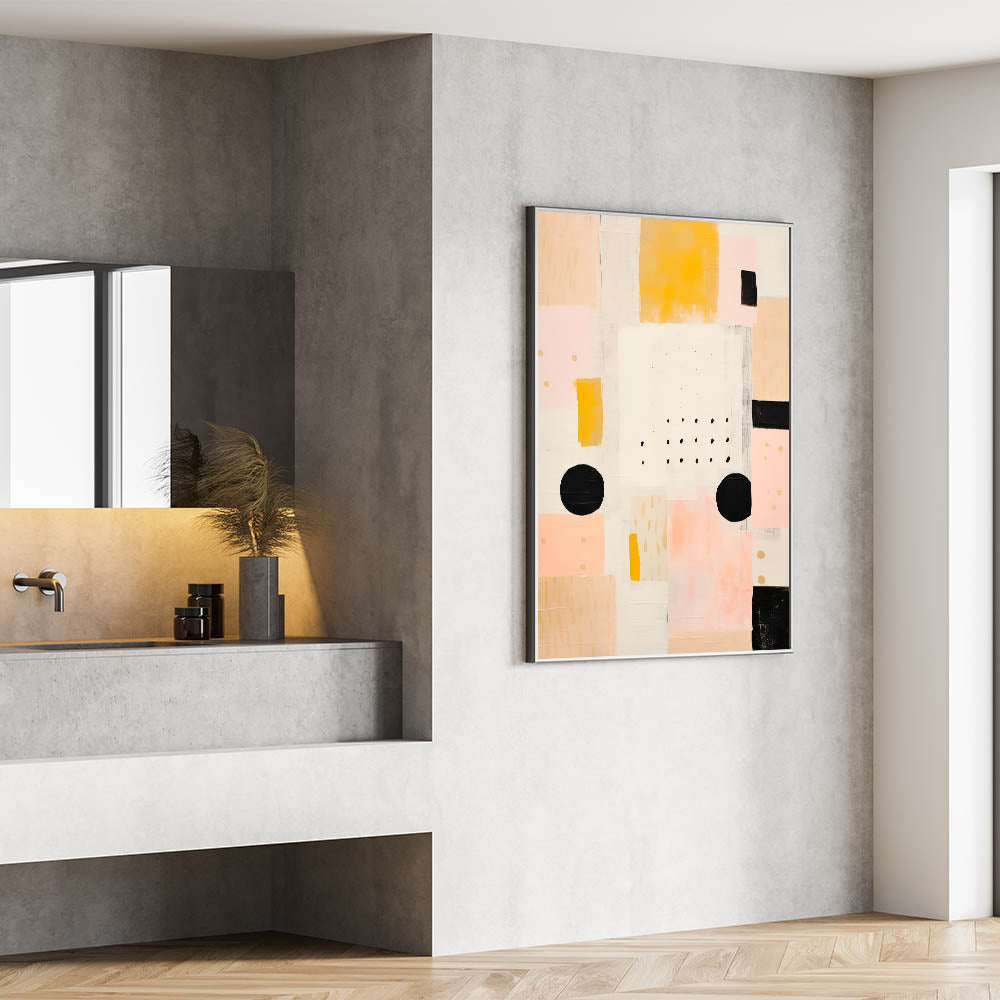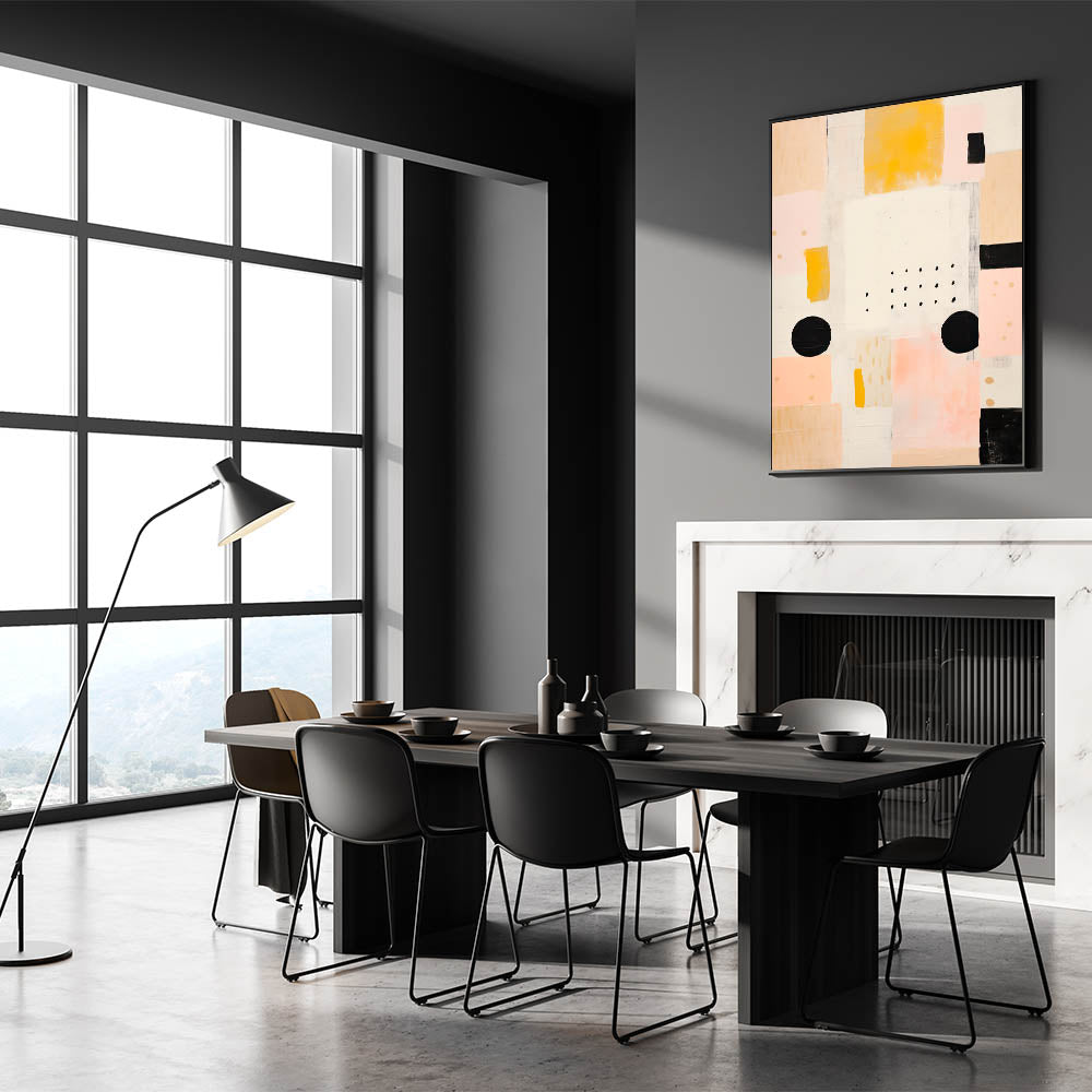 Elevate your home decor with this striking Maximalist Wall Art. Featuring bold geometric shapes and soft pastel tones, this abstract artwork plays with balance and contrast, combining blocks of yellow, black, and peach against a clean white backdrop. The minimalist patterns, interspersed with bold dots, bring a sense of rhythm and movement, making it an ideal piece for those who love vibrant maximalism and bold home decor. This eclectic design adds depth and character to living rooms, offices, or creative spaces.