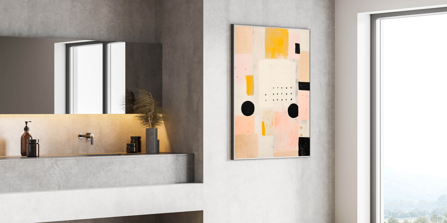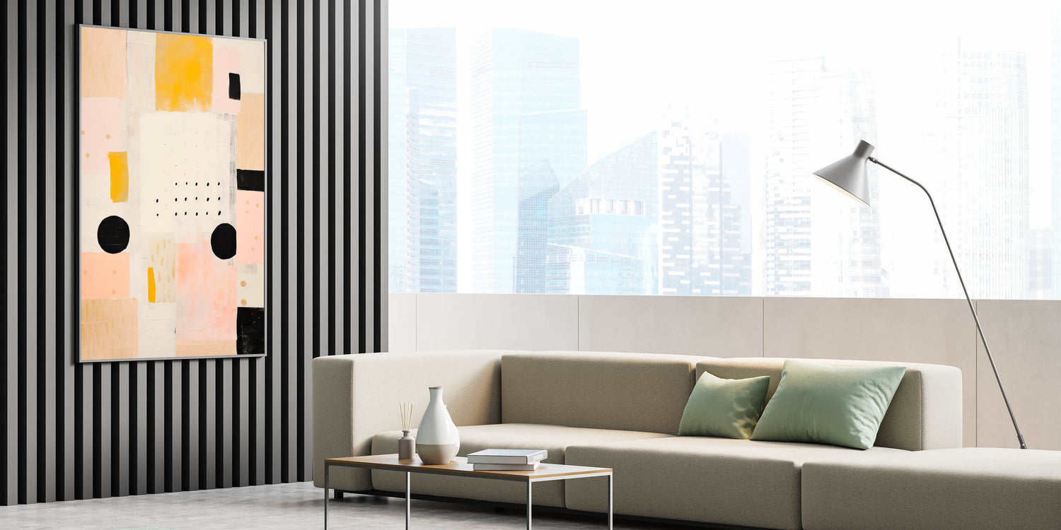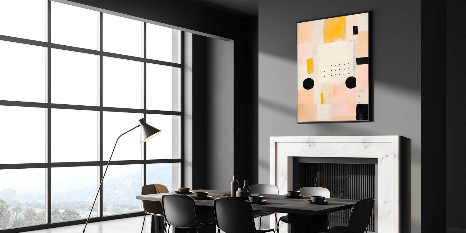 Elevate your home decor with this striking Maximalist Wall Art. Featuring bold geometric shapes and soft pastel tones, this abstract artwork plays with balance and contrast, combining blocks of yellow, black, and peach against a clean white backdrop. The minimalist patterns, interspersed with bold dots, bring a sense of rhythm and movement, making it an ideal piece for those who love vibrant maximalism and bold home decor. This eclectic design adds depth and character to living rooms, offices, or creative spaces.