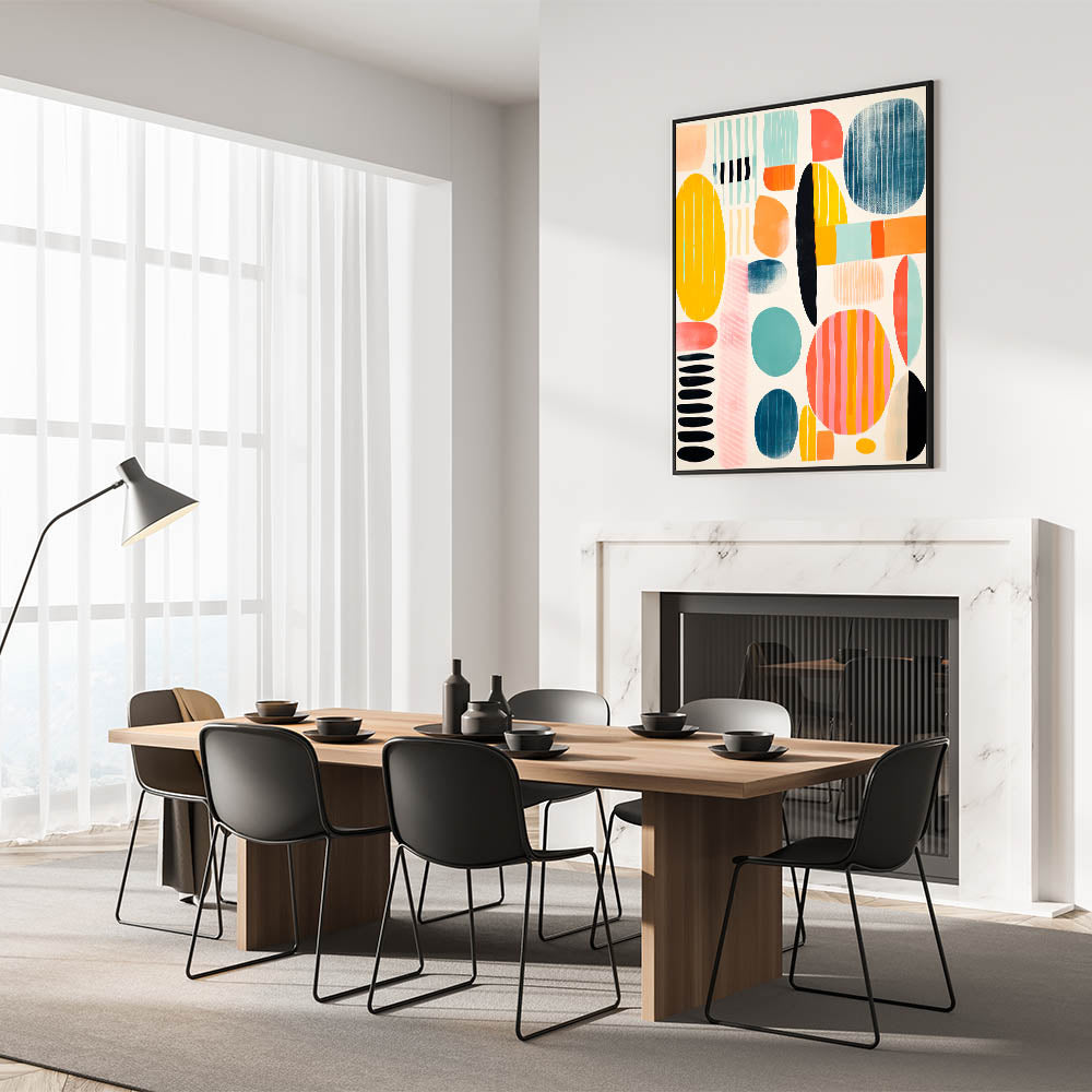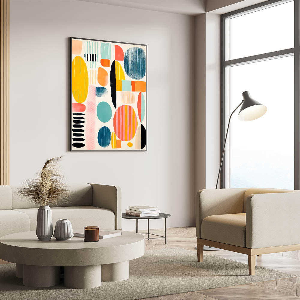 - Bold Colors and Patterns: Features a mix of vibrant hues and dynamic shapes for an eclectic look.