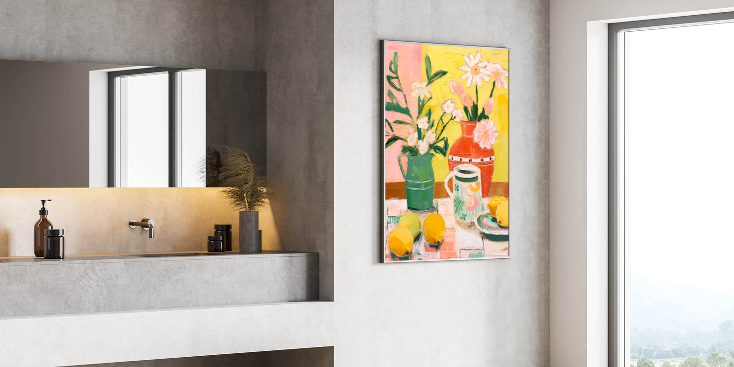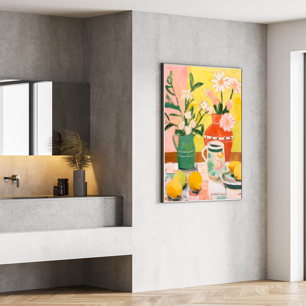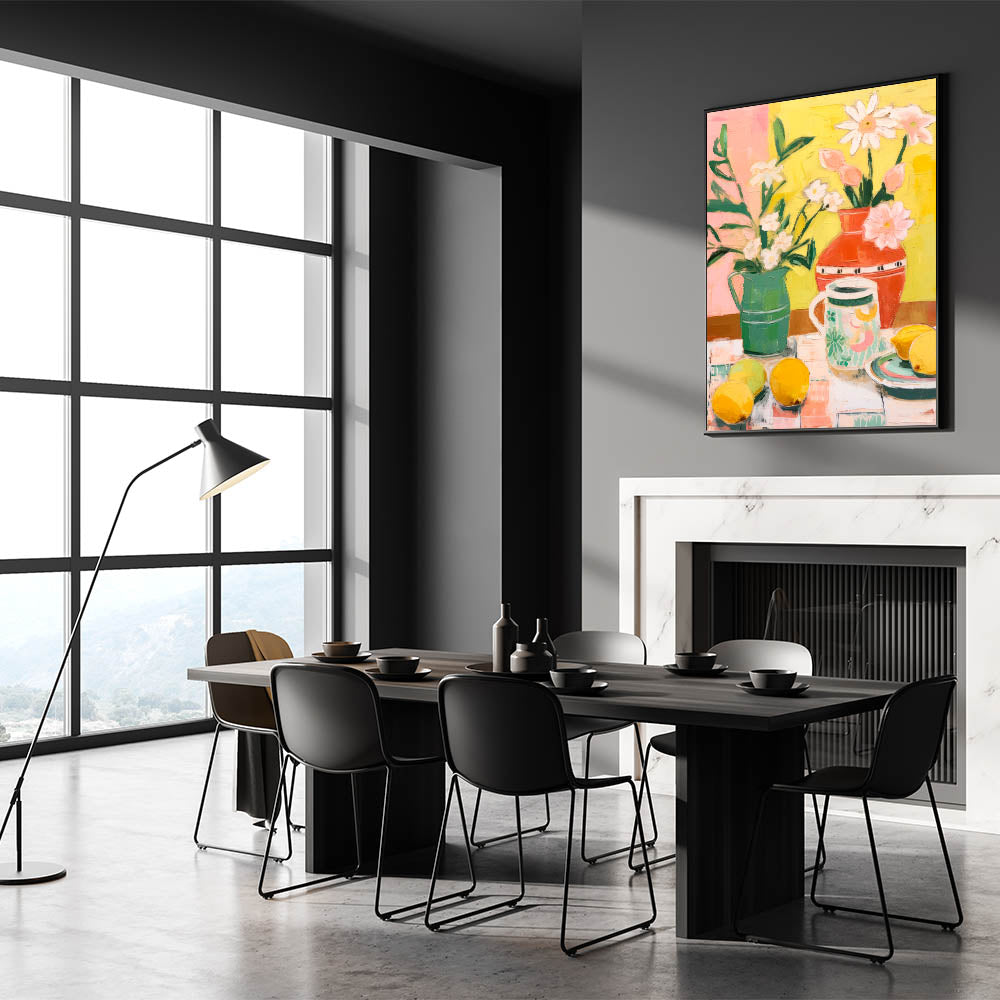 Infuse your space with a lively burst of color with this Maximalist Wall Art, featuring a bold and eclectic still life of florals, lemons, and vases. The playful combination of pink, yellow, green, and bright accents creates a visually striking design that brings a sense of warmth and joy to any room. This piece is perfect for those who enjoy vibrant maximalism and expressive decor that makes a bold statement.