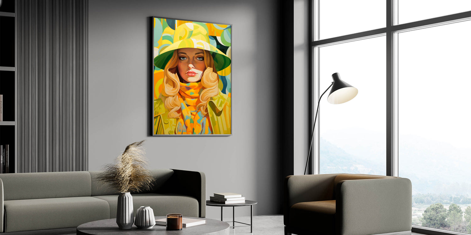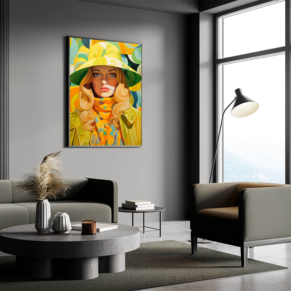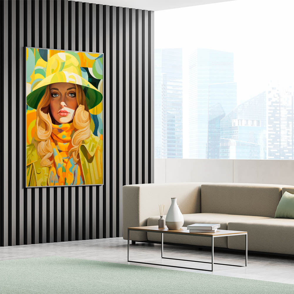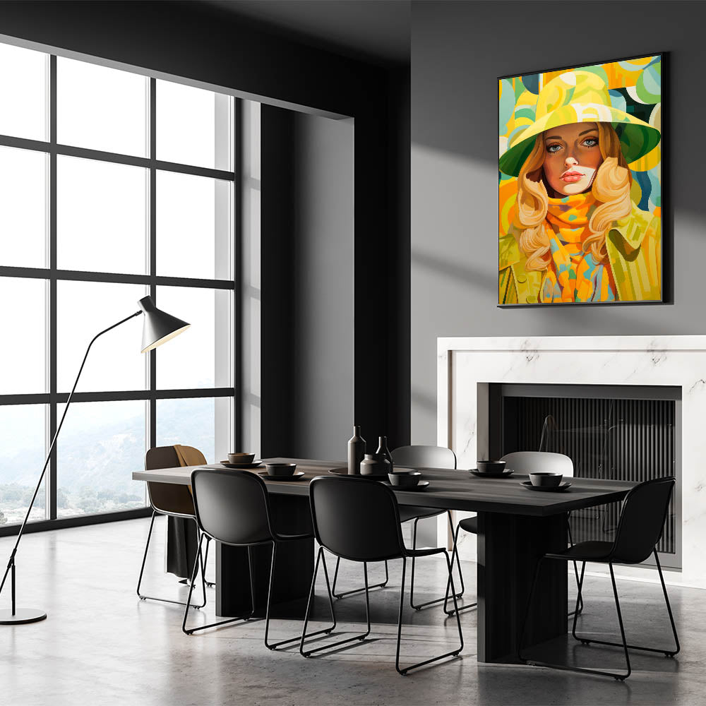 Add a dynamic touch to your decor with this bold maximalist wall art, featuring a striking retro-inspired portrait with vibrant yellow accents. The artwork captures the essence of 1970s style through expressive colors and playful patterns, making it a captivating statement piece for eclectic home decor. Ideal for living rooms, bedrooms, or creative spaces, this piece adds a sense of energy and personality to any room. The combination of bold hues and intricate details creates a visually stunning artwork that brings a touch of vintage charm to modern interiors.