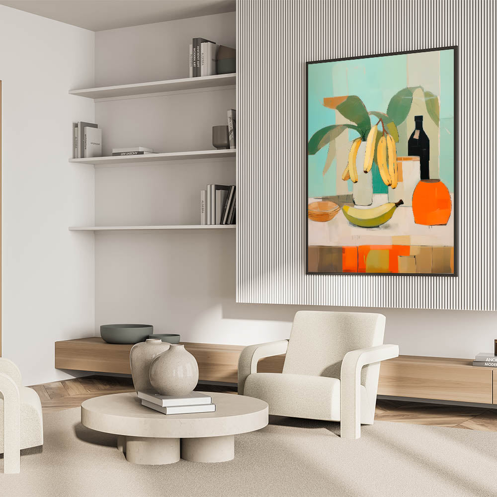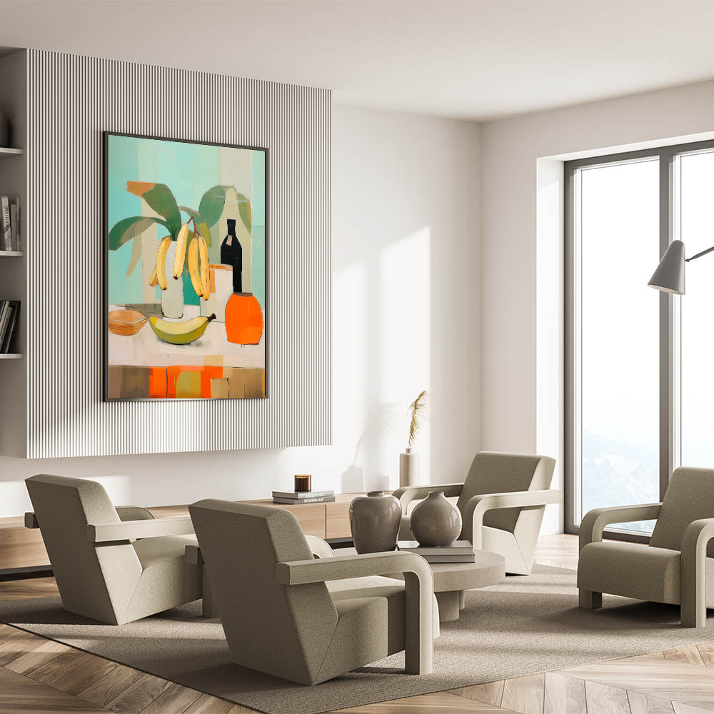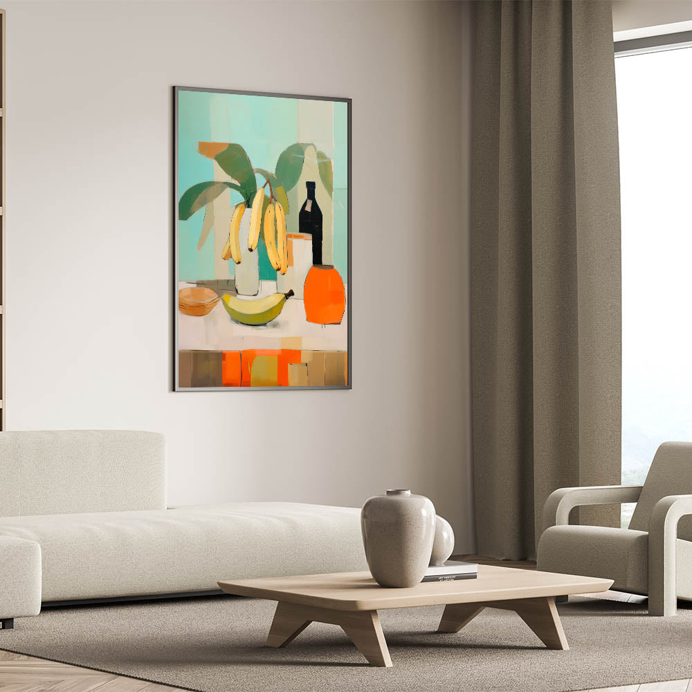 Add a touch of bold style to your home with this vibrant Maximalist wall art featuring a playful still life of bananas, a vase, and other household objects. The bright, tropical colors—ranging from soft greens and yellows to vivid oranges—create a dynamic and eye-catching composition. The abstract, geometric shapes of the objects lend a modern feel to this piece, making it ideal for eclectic spaces that embrace color and creativity. Perfect for kitchens, dining rooms, or living areas, this artwork brings a sense of freshness and warmth to any room.