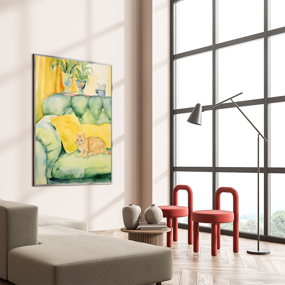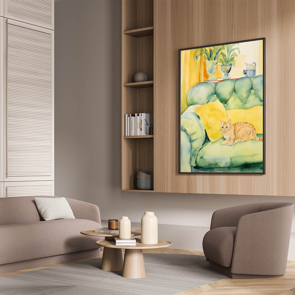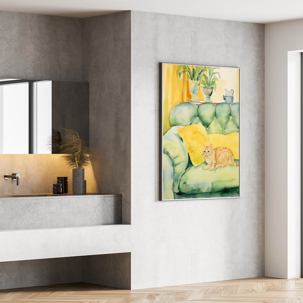 Bring a touch of whimsy to your space with this Maximalist Wall Art, featuring a charming depiction of a cat lounging on a cozy green sofa. The artwork is filled with vibrant colors, including shades of green, yellow, and warm orange, creating a visually delightful composition. Perfect for cat lovers and those who appreciate eclectic, playful decor, this piece adds a lively, inviting atmosphere to living rooms, bedrooms, or creative spaces.