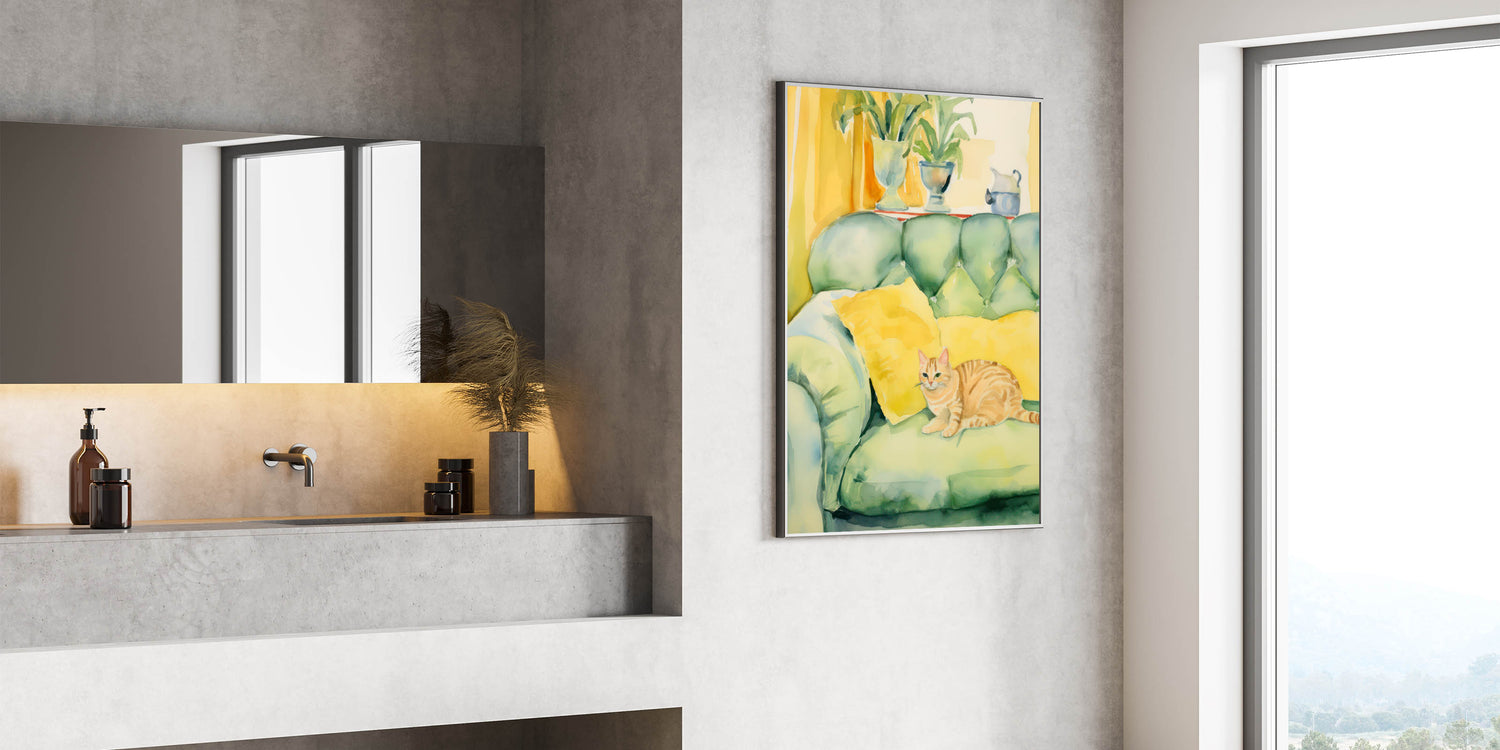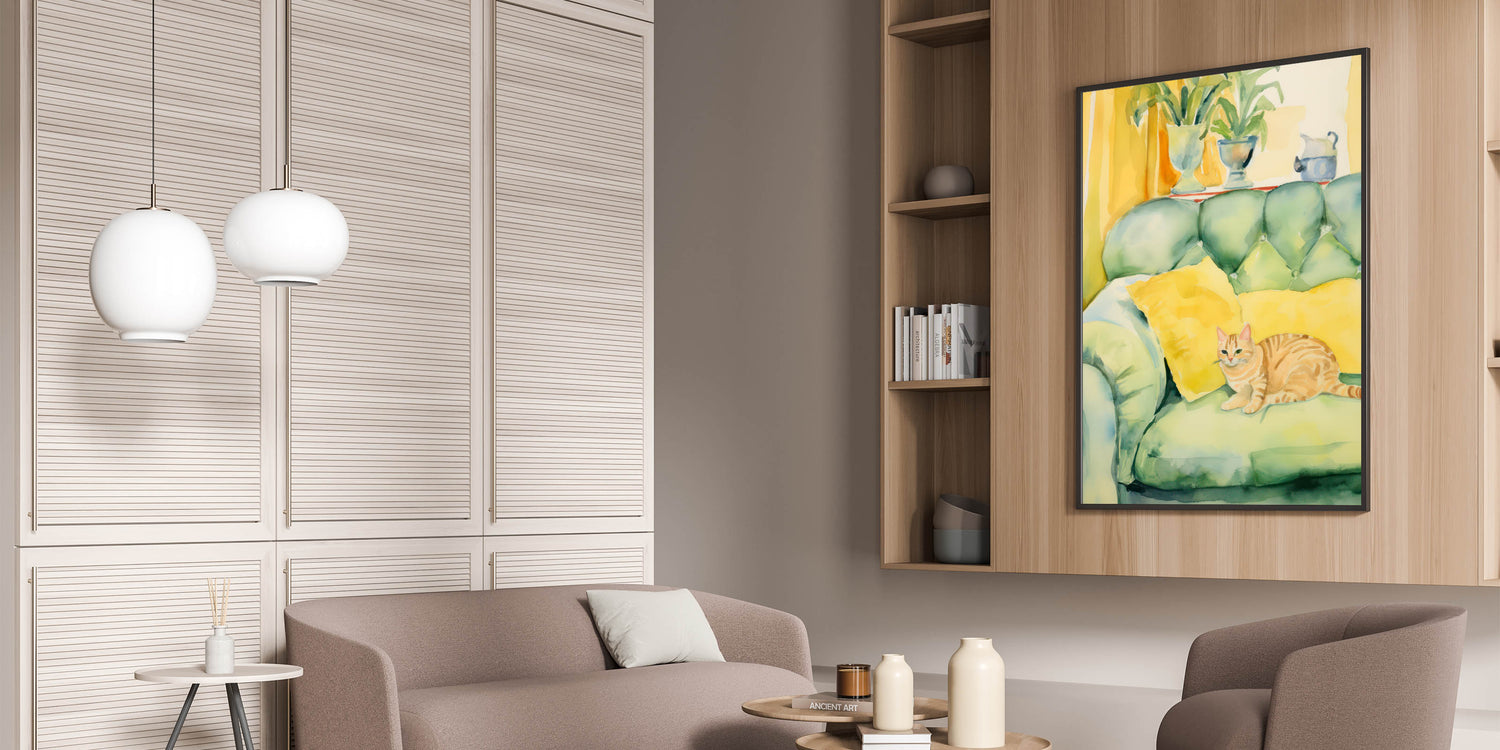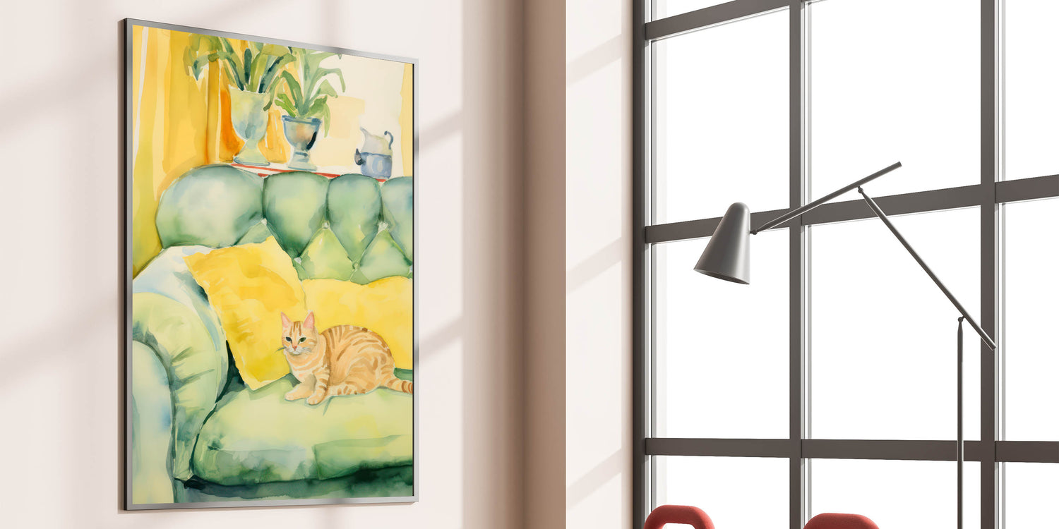 Bring a touch of whimsy to your space with this Maximalist Wall Art, featuring a charming depiction of a cat lounging on a cozy green sofa. The artwork is filled with vibrant colors, including shades of green, yellow, and warm orange, creating a visually delightful composition. Perfect for cat lovers and those who appreciate eclectic, playful decor, this piece adds a lively, inviting atmosphere to living rooms, bedrooms, or creative spaces.