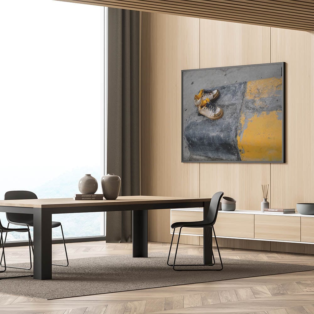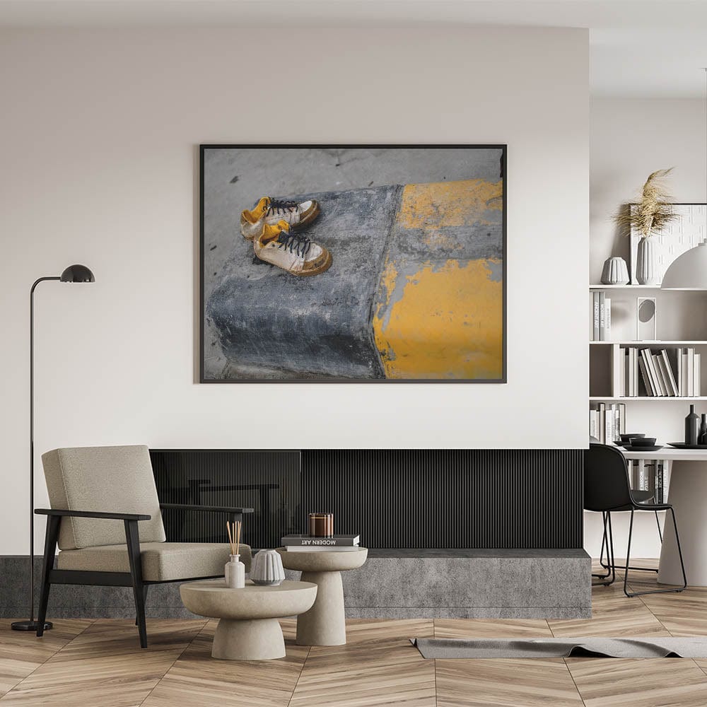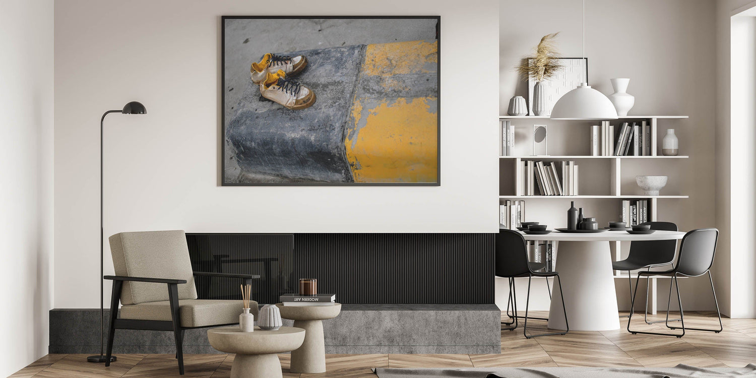 Emotion and simplicity collide in this raw piece of metropolitan photography art. A pair of worn sneakers rests on a cracked urban curb painted with fading yellow stripes, telling an untold story of footsteps and city life. The gritty textures and muted palette evoke emotion and realism, making this piece ideal for artistic, industrial-style interiors.