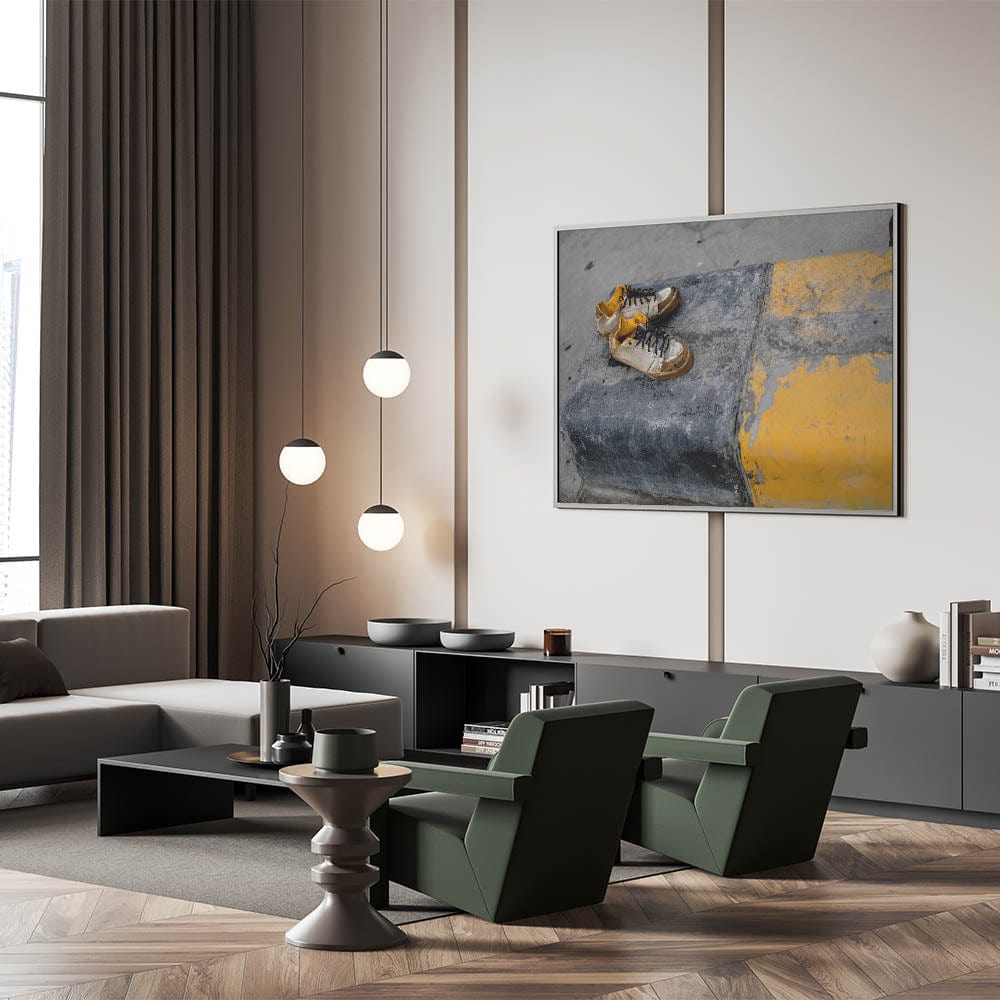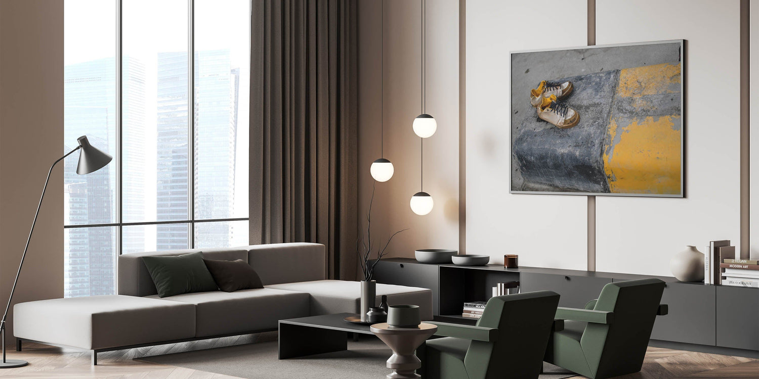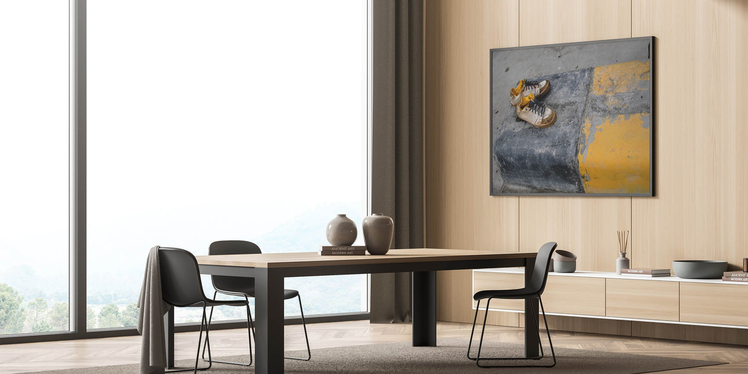 Emotion and simplicity collide in this raw piece of metropolitan photography art. A pair of worn sneakers rests on a cracked urban curb painted with fading yellow stripes, telling an untold story of footsteps and city life. The gritty textures and muted palette evoke emotion and realism, making this piece ideal for artistic, industrial-style interiors.