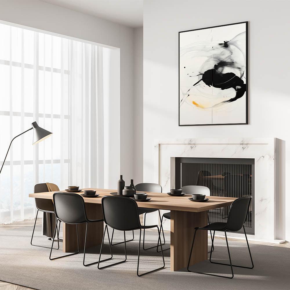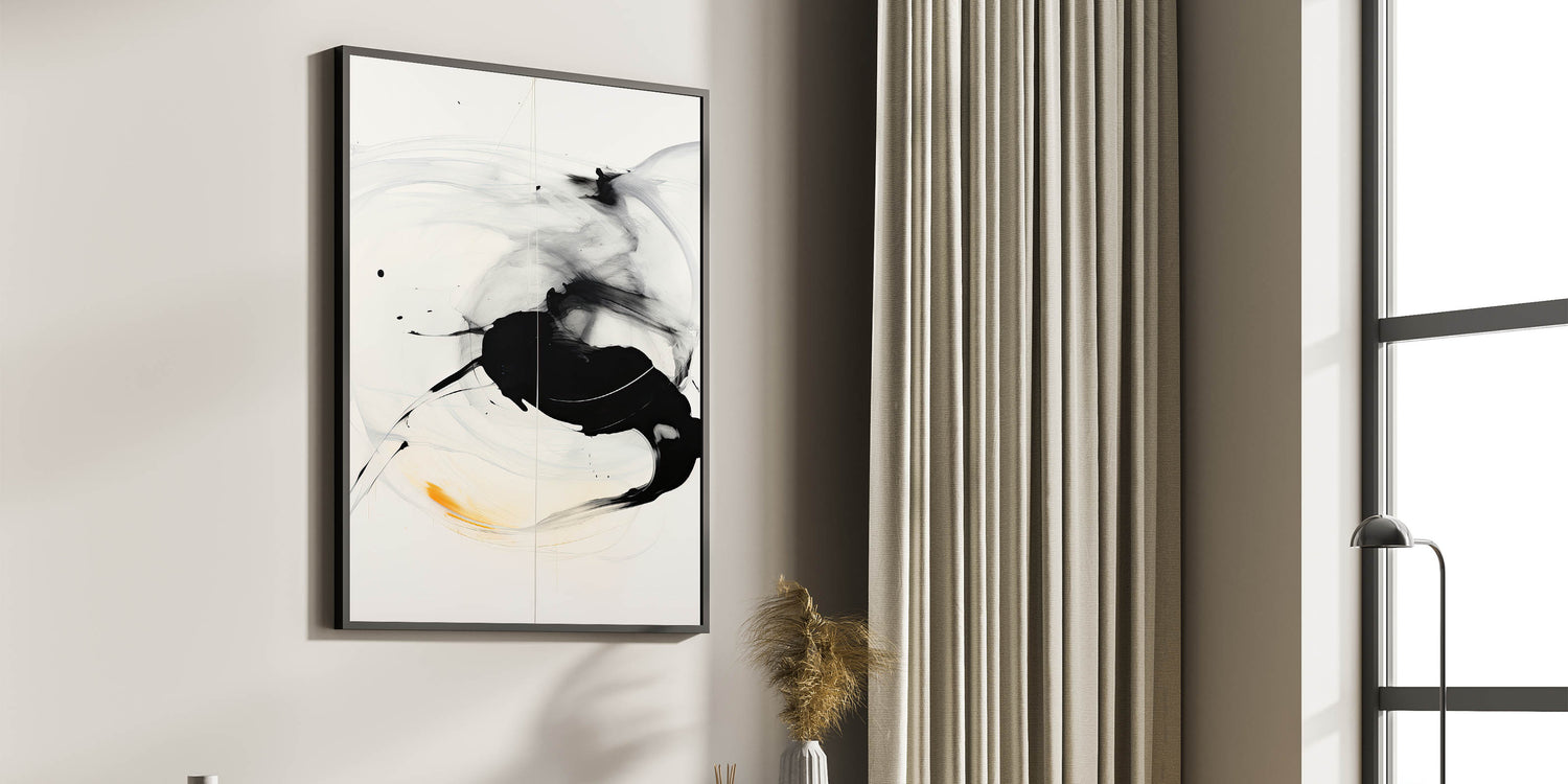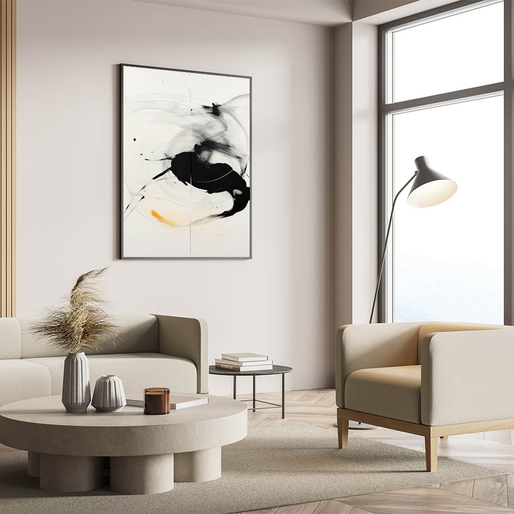 Minimalist Abstract Art - Black and White Brushstroke with Yellow Accent