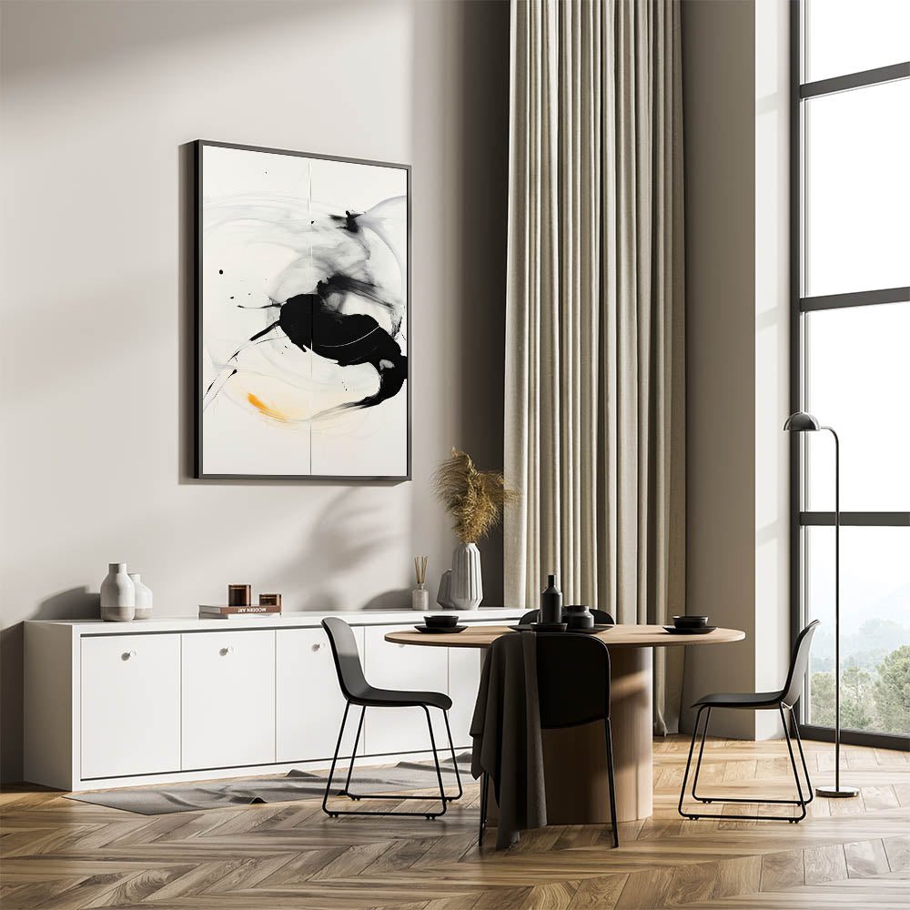 Enhance your home with this bold minimalist abstract wall art, featuring dynamic black brushstrokes with a striking yellow accent. The contrast between the flowing black strokes and the vibrant touch of yellow brings a sense of movement and energy to this contemporary piece. Perfect for modern interiors, this artwork adds a sleek and stylish touch to any space, whether it’s your living room, bedroom, or office.
