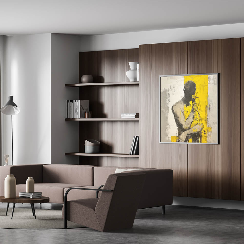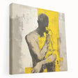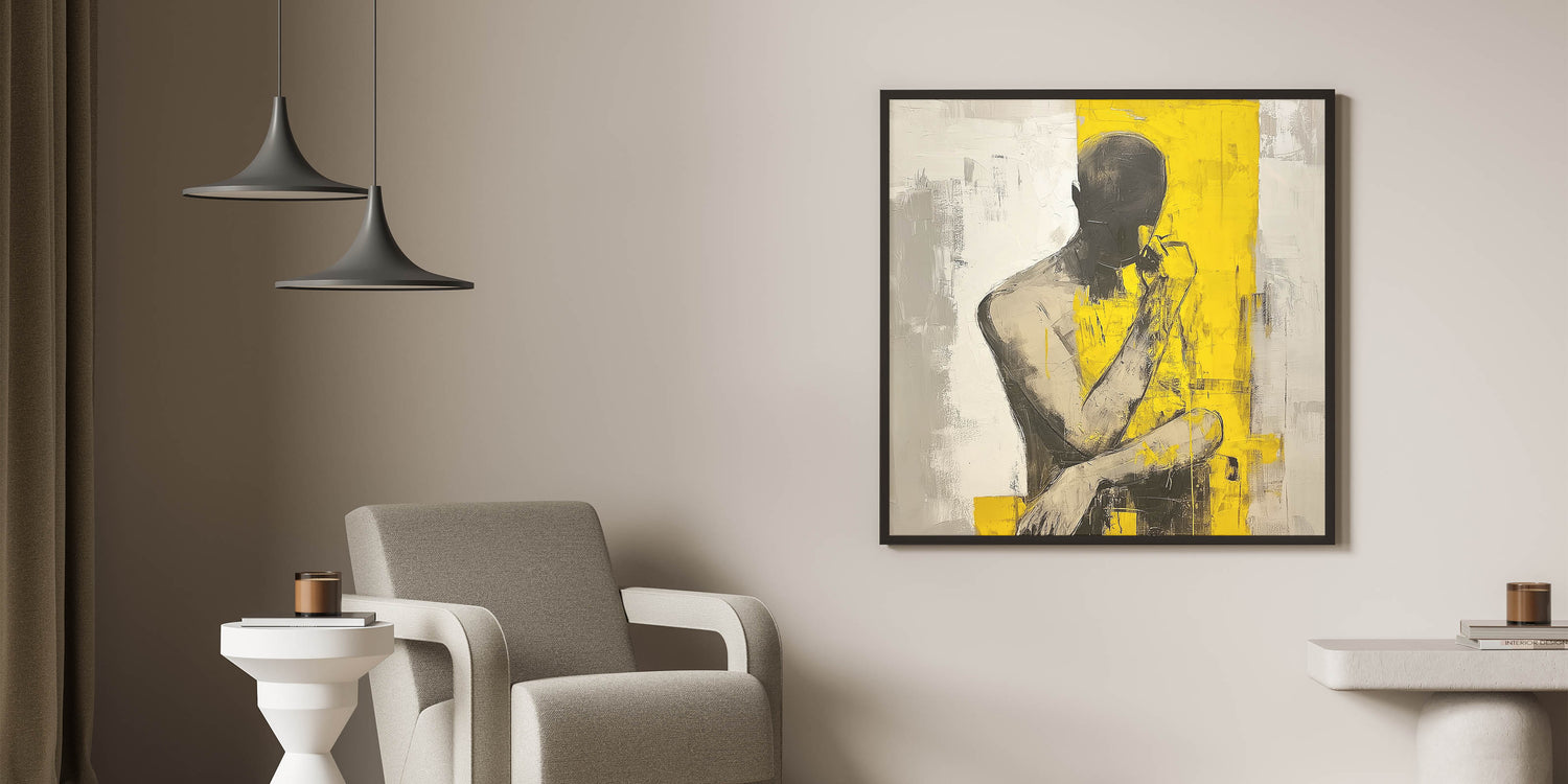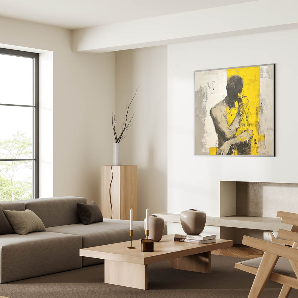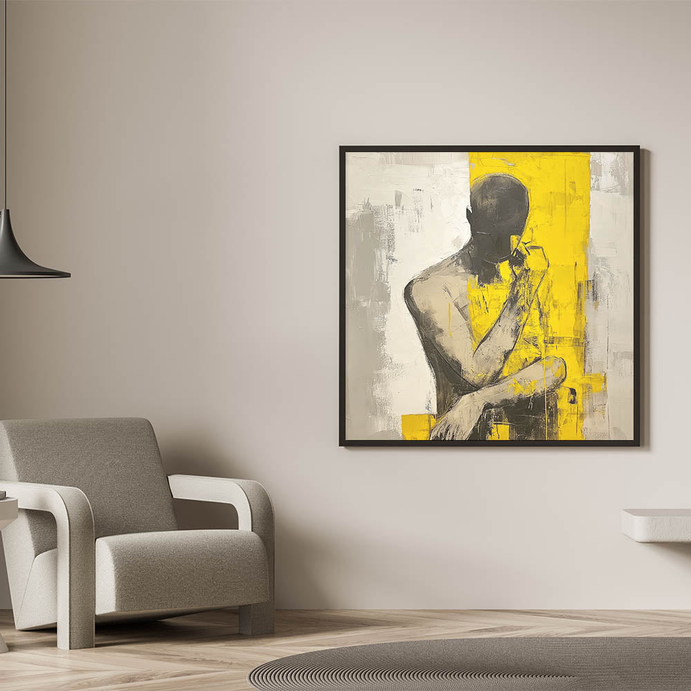This abstract figurative wall art captures raw emotion through bold brushstrokes and a striking contrast of monochrome and yellow. The faceless figure, depicted in a contemplative pose, embodies depth and introspection, making this a powerful modern abstract figure painting for contemporary spaces.