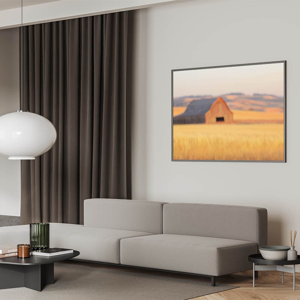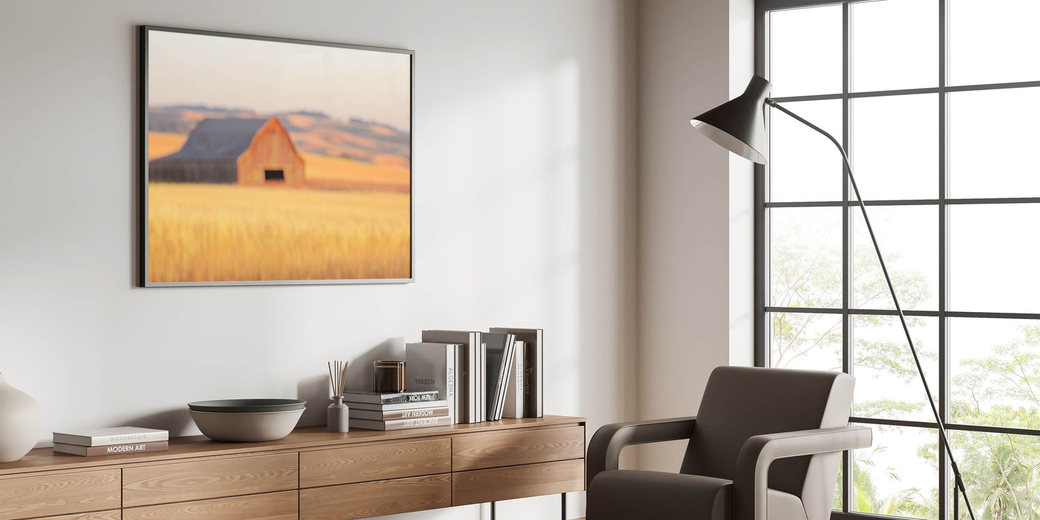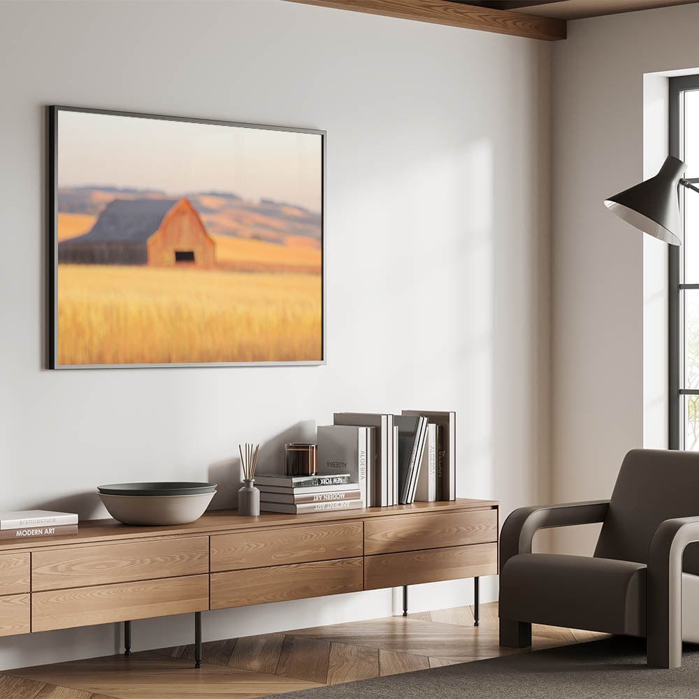 This radiant piece from our Minimalist Coastal Landscape Art collection reimagines countryside serenity through a minimalist lens. A softly blurred red barn sits quietly in golden wheat fields, with layers of rolling hills creating a dreamy, sun-drenched horizon.