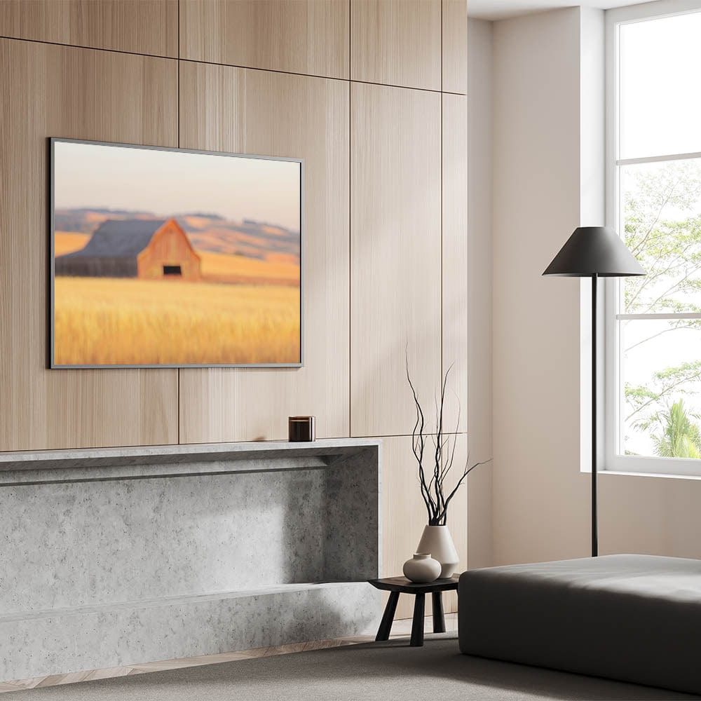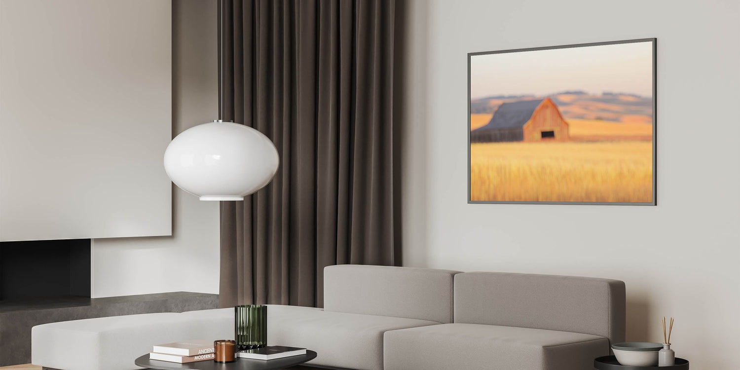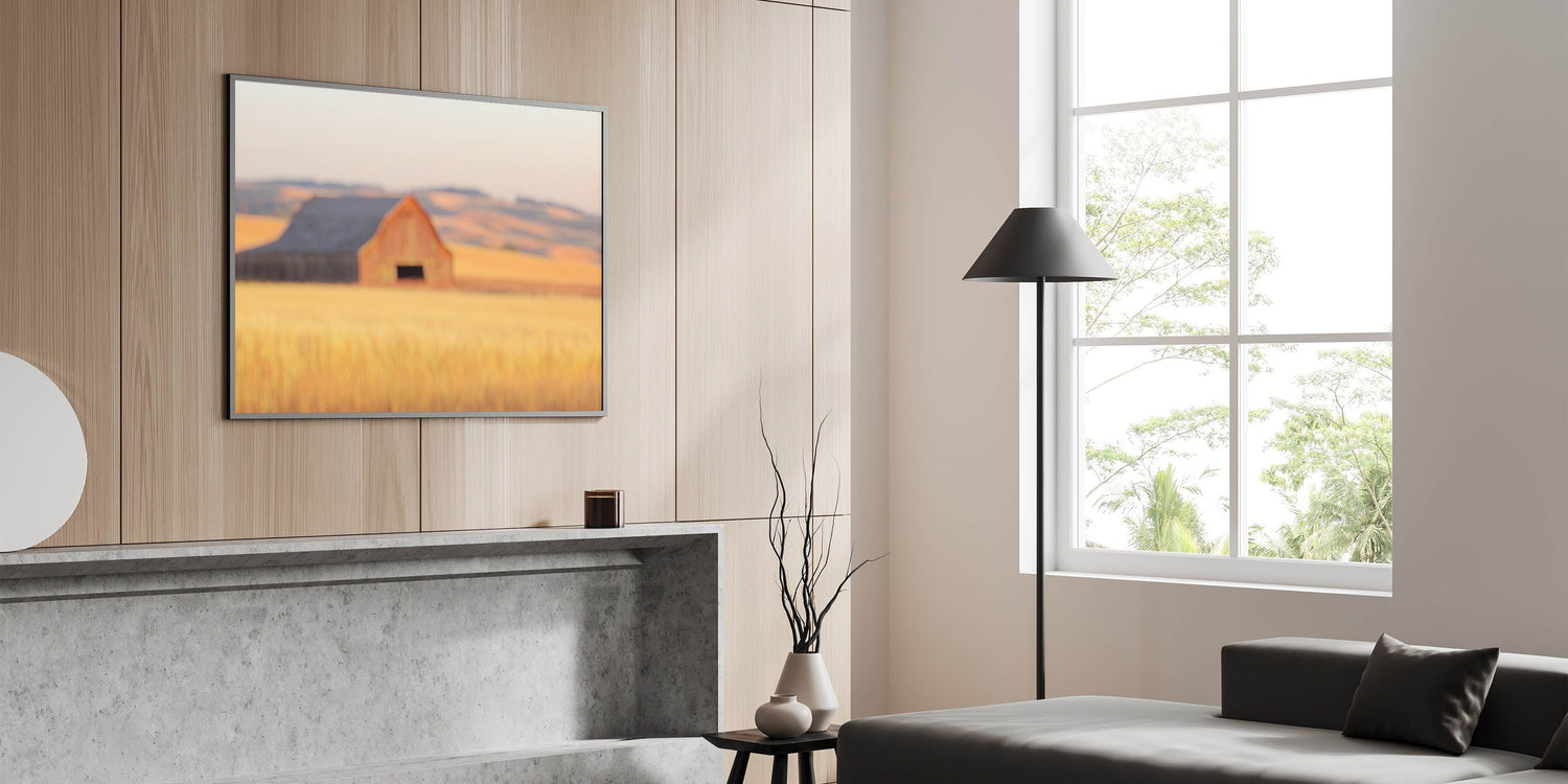 This radiant piece from our Minimalist Coastal Landscape Art collection reimagines countryside serenity through a minimalist lens. A softly blurred red barn sits quietly in golden wheat fields, with layers of rolling hills creating a dreamy, sun-drenched horizon.
