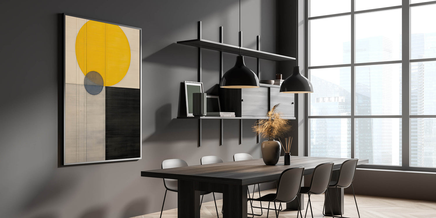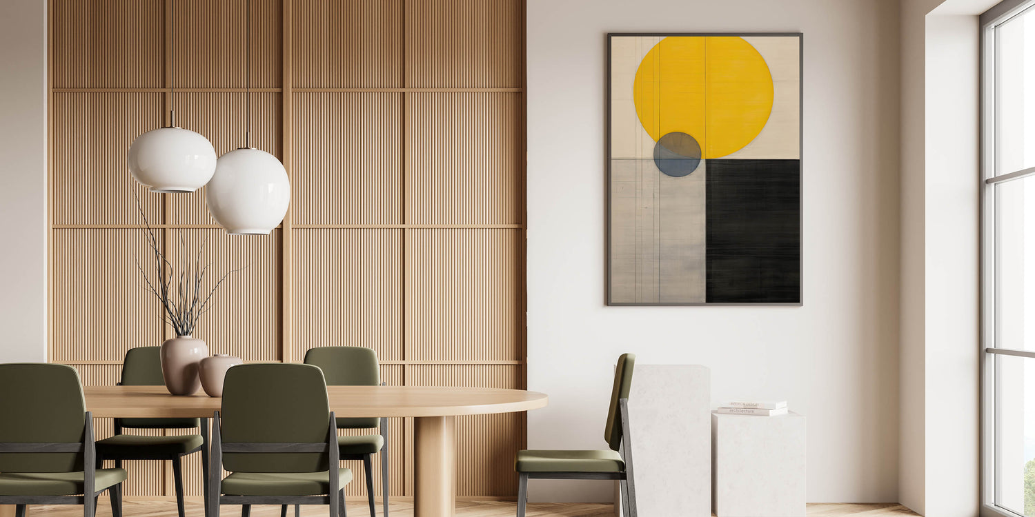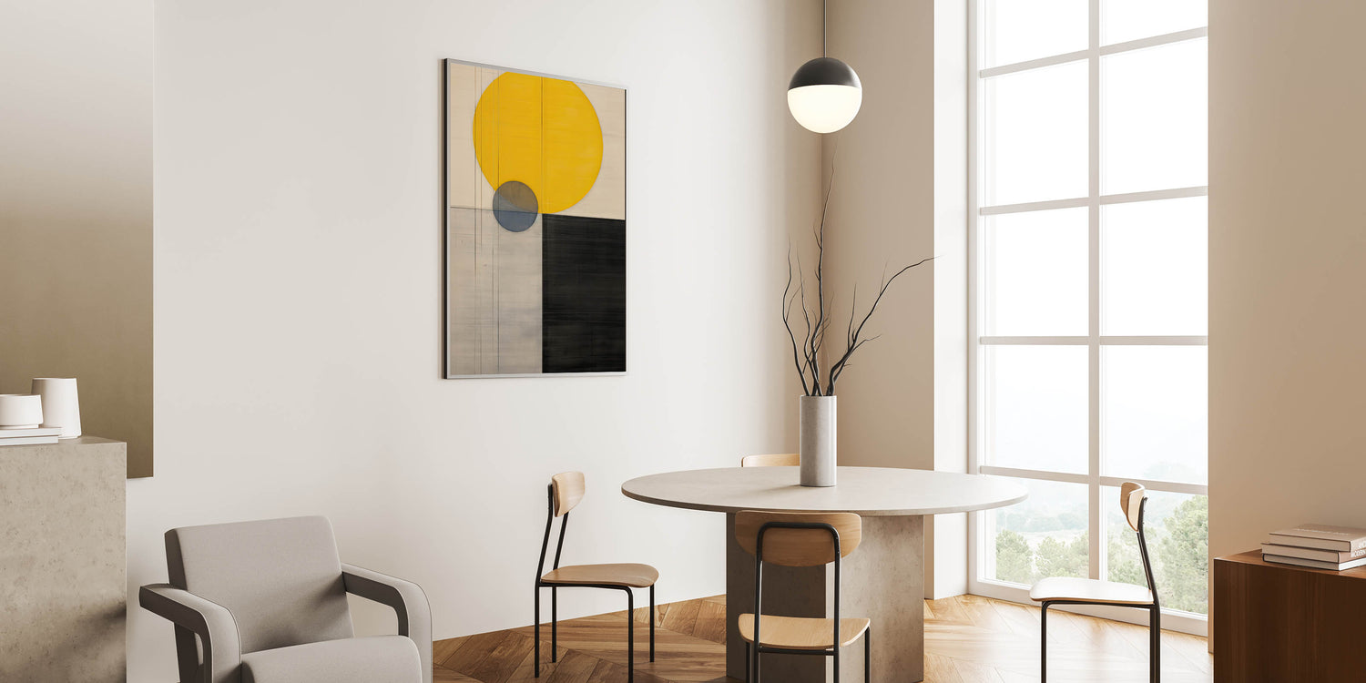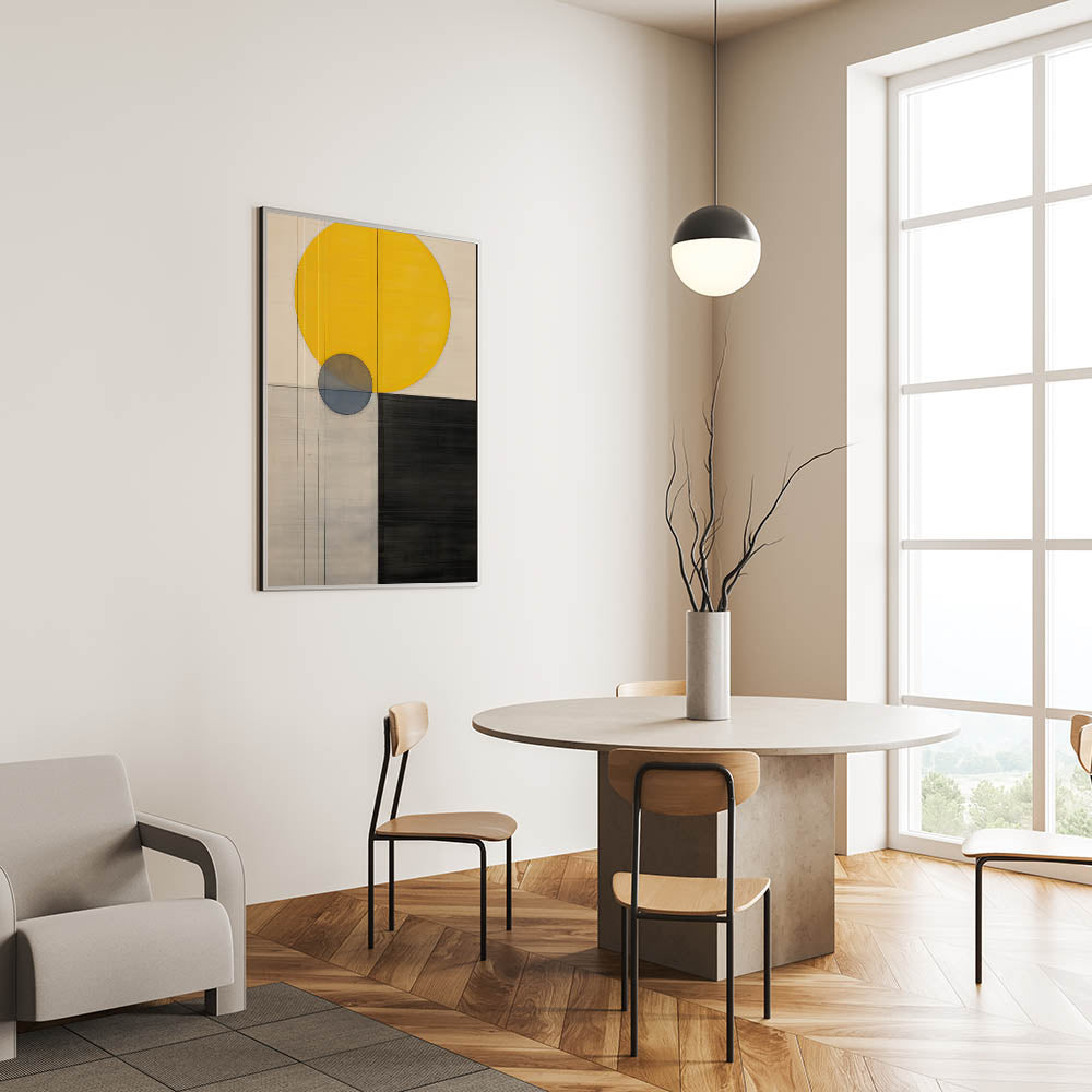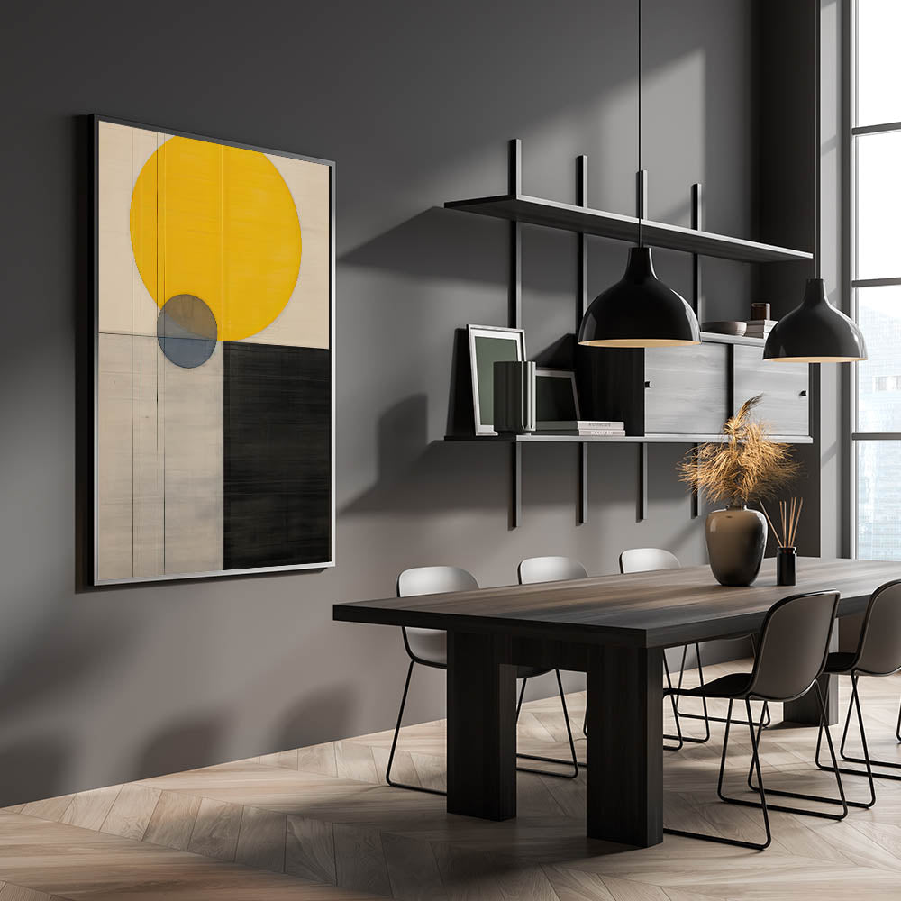 Bring modern elegance to your dining space with this minimalist geometric wall art, featuring a bold yellow circle, soft gray-blue accents, and structured black and beige elements. The strong contrast and clean, balanced composition make this piece a sophisticated focal point in any contemporary dining area. Perfect for lovers of modern, abstract, and minimalist art, this elegant dining room wall art creates a refined yet energetic atmosphere.