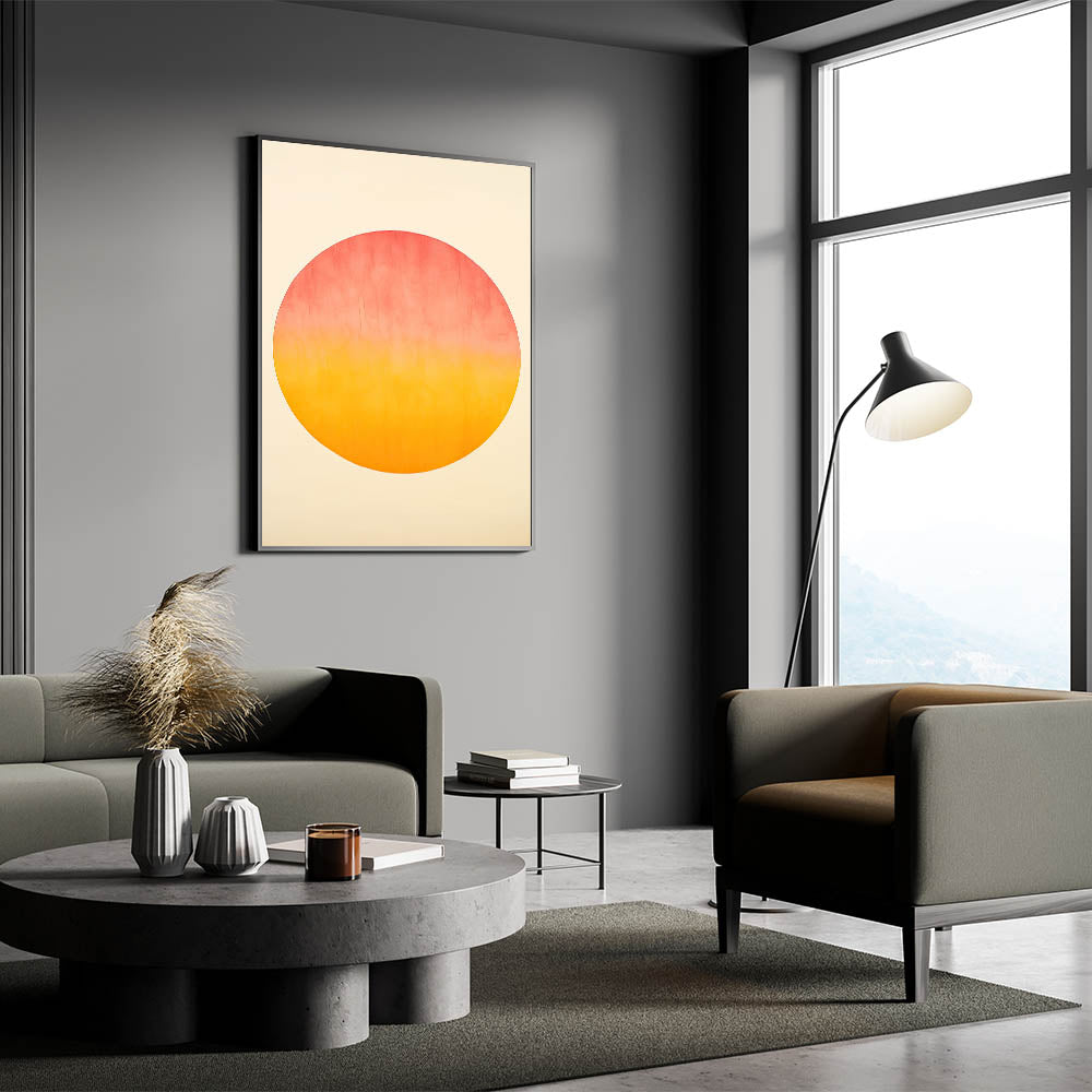 Add a bold, modern touch to your space with this minimalist wall art, featuring an abstract circle in vibrant sunset hues of pink, orange, and yellow. The clean, simple design embodies a modern minimalist aesthetic, making it perfect for contemporary homes and offices. This abstract artwork draws inspiration from the beauty of nature, with its radiant colors blending harmoniously to evoke a serene sunset.