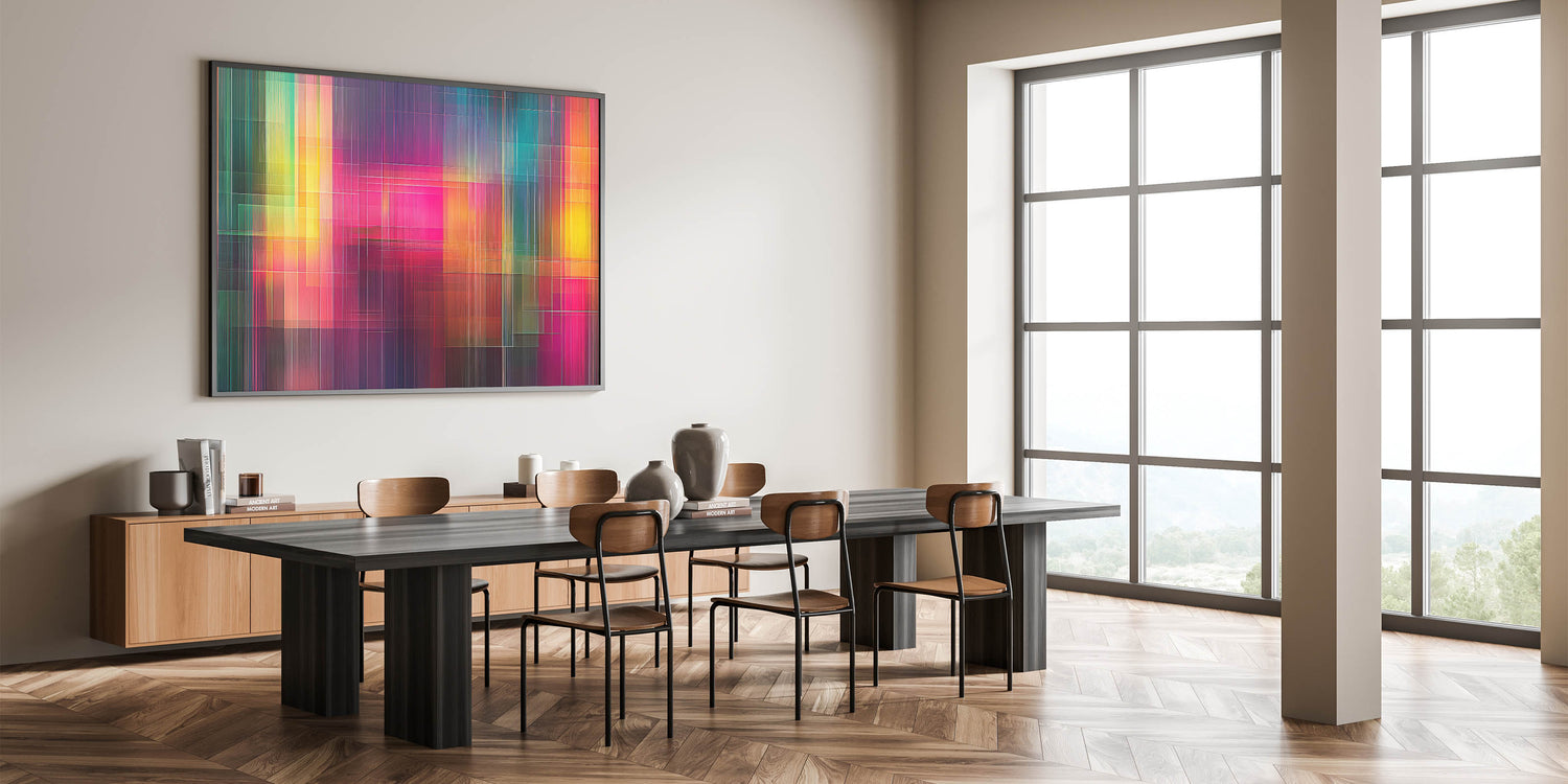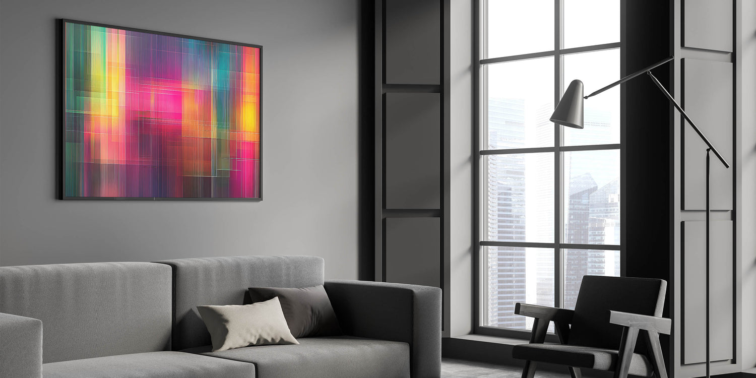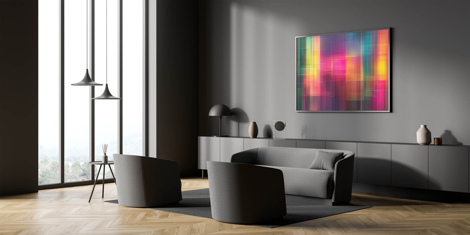This piece is a dynamic choice for large abstract wall decor for living spaces. As one of our most energetic geometric abstract art prints for modern aesthetics, it delivers visual depth and color in perfect harmony.