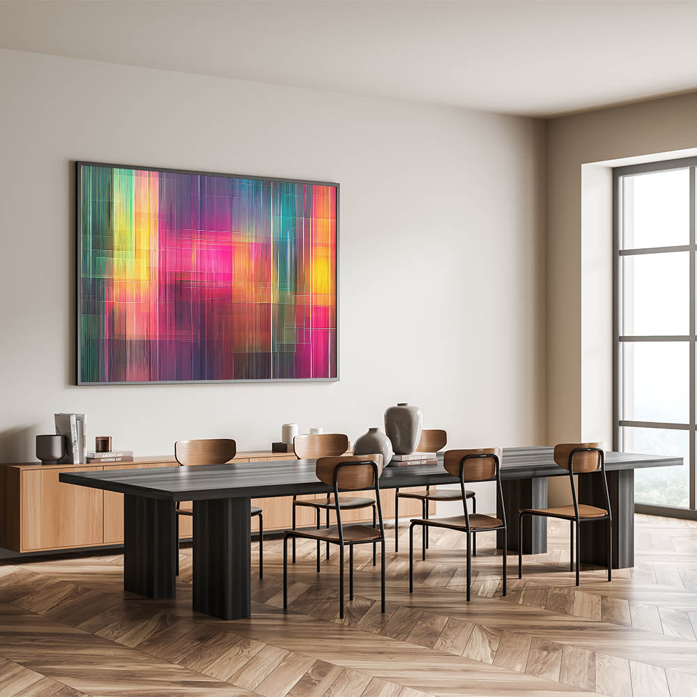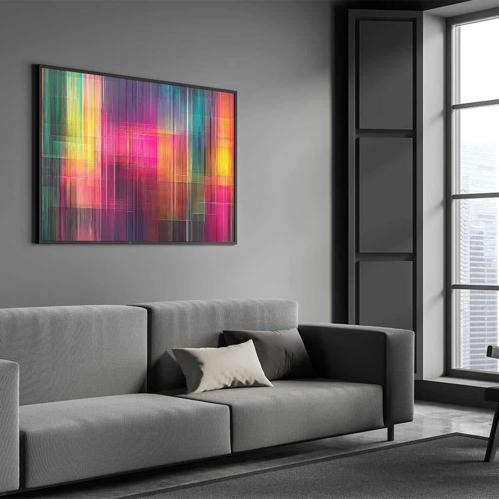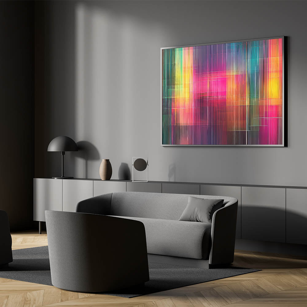 Energize your space with this bold abstract wall art from our High-Contrast Abstracts collection. Featuring a vibrant grid of intersecting lines, this piece fuses glowing hues of fuchsia, teal, yellow, and orange into a geometric composition bursting with motion and intensity. It radiates modern sophistication and high-energy style.