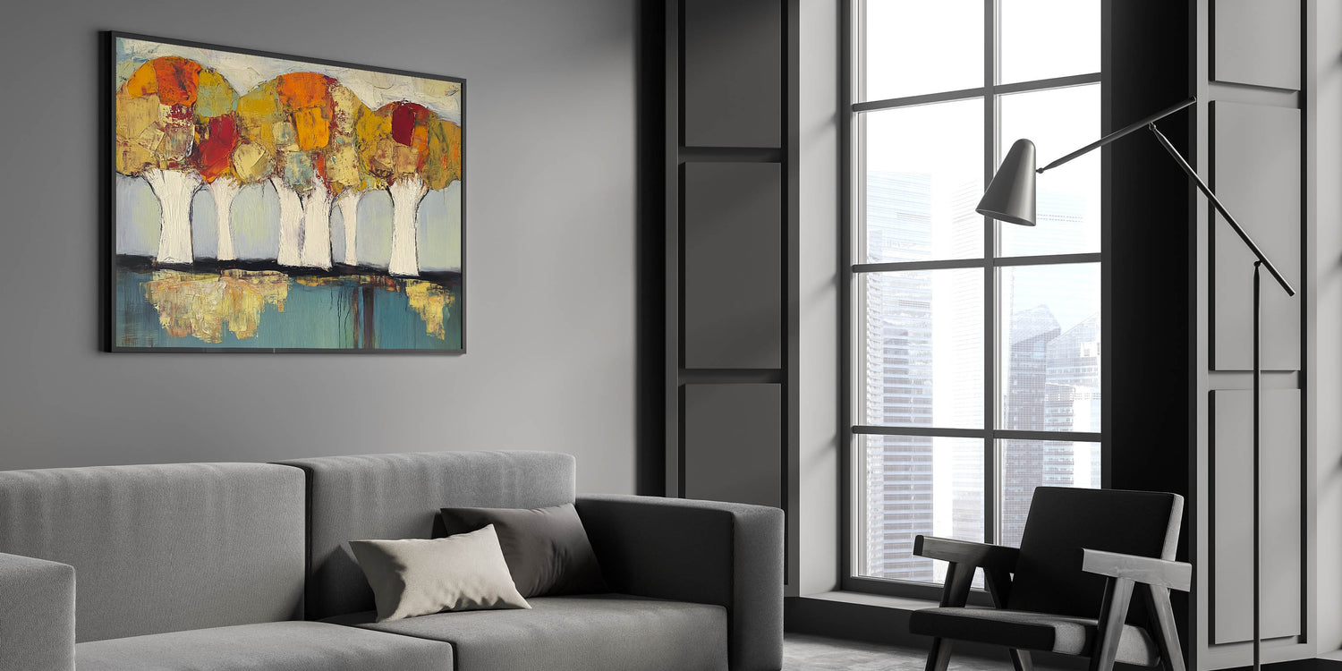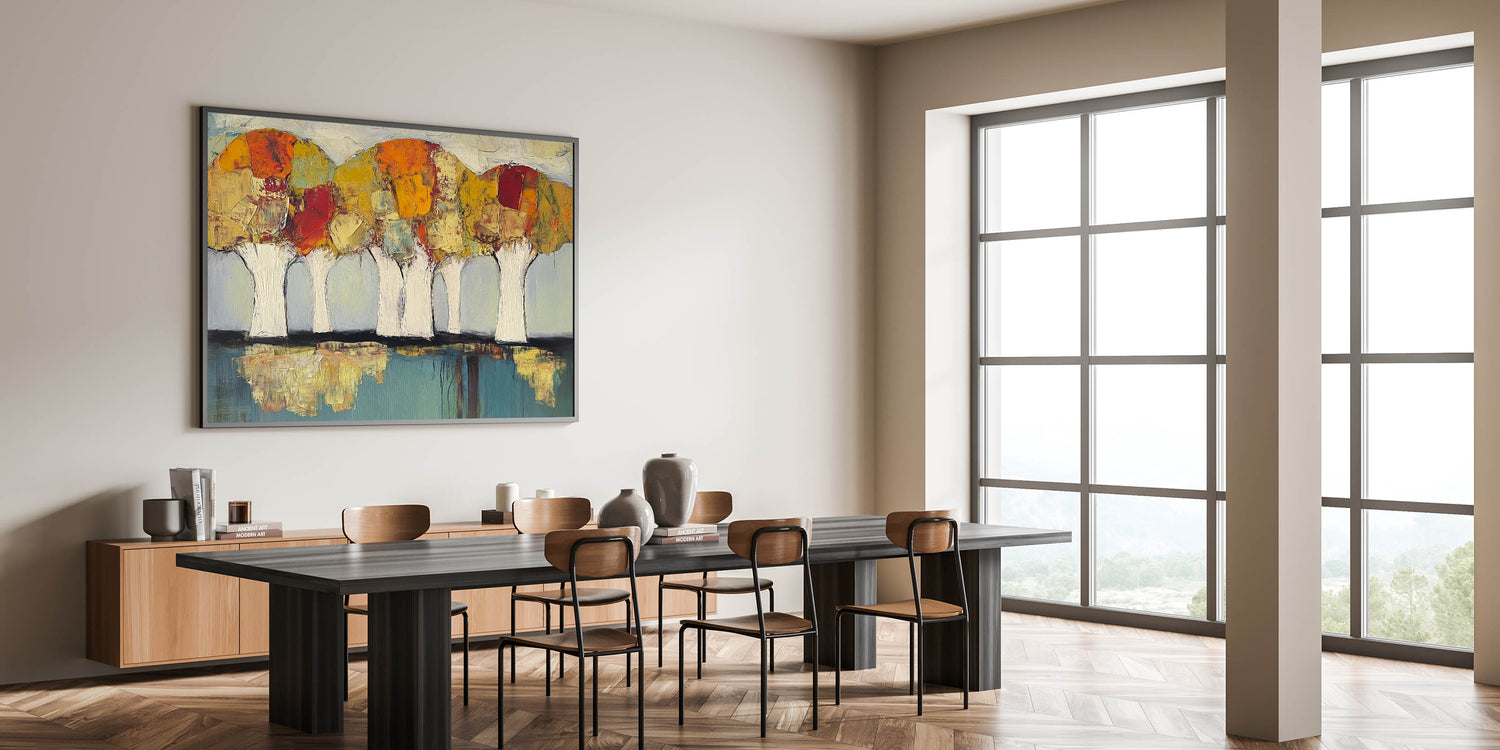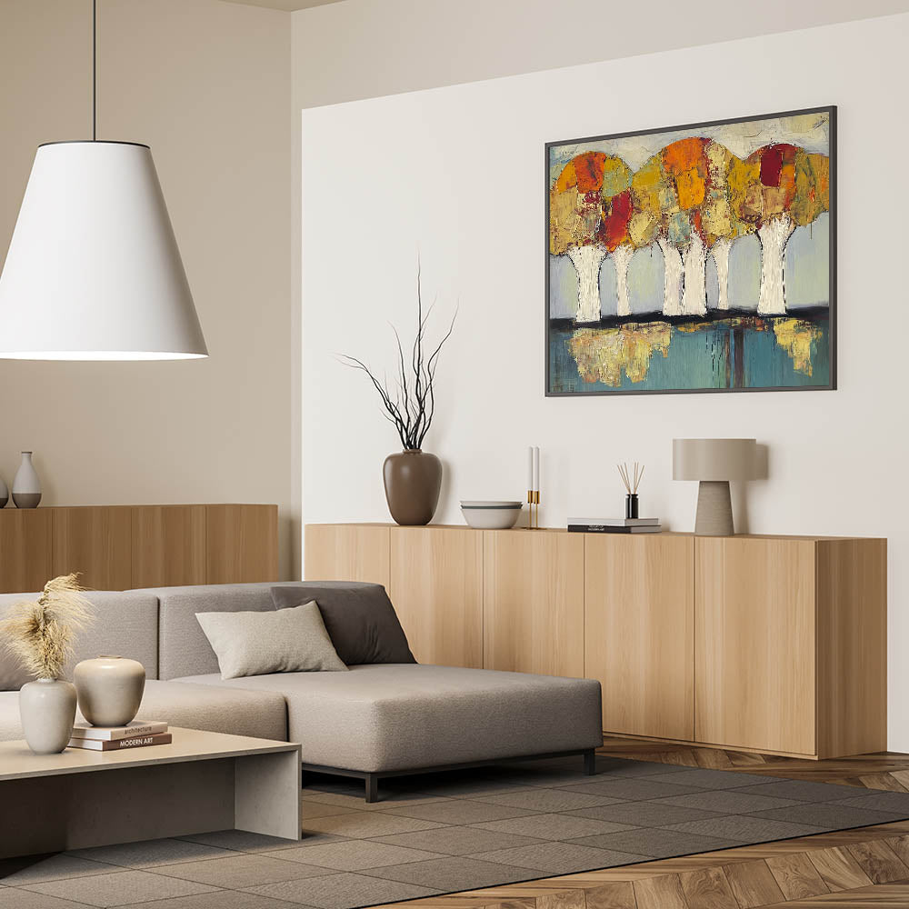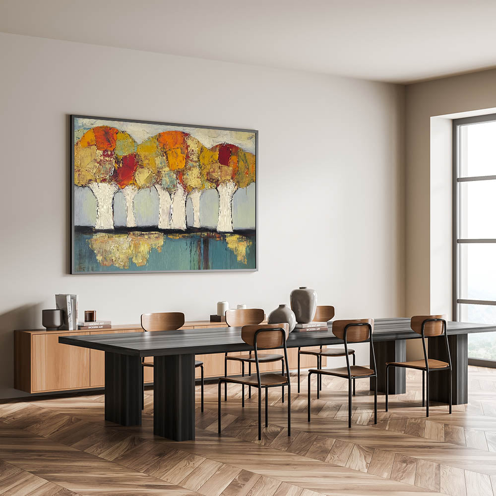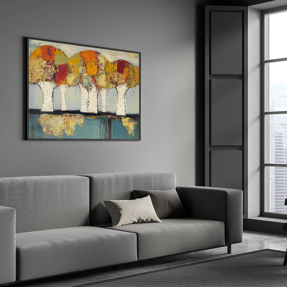 Transform your space with this captivating wall art for the living room, featuring an abstract wall art design of vibrant autumn trees reflected on water. This modern wall art piece showcases a harmonious blend of warm oranges, yellows, and reds with calming teal tones, making it a perfect statement piece for any contemporary home.