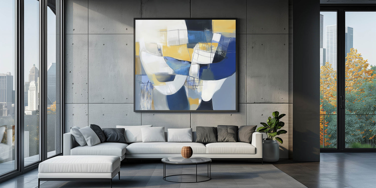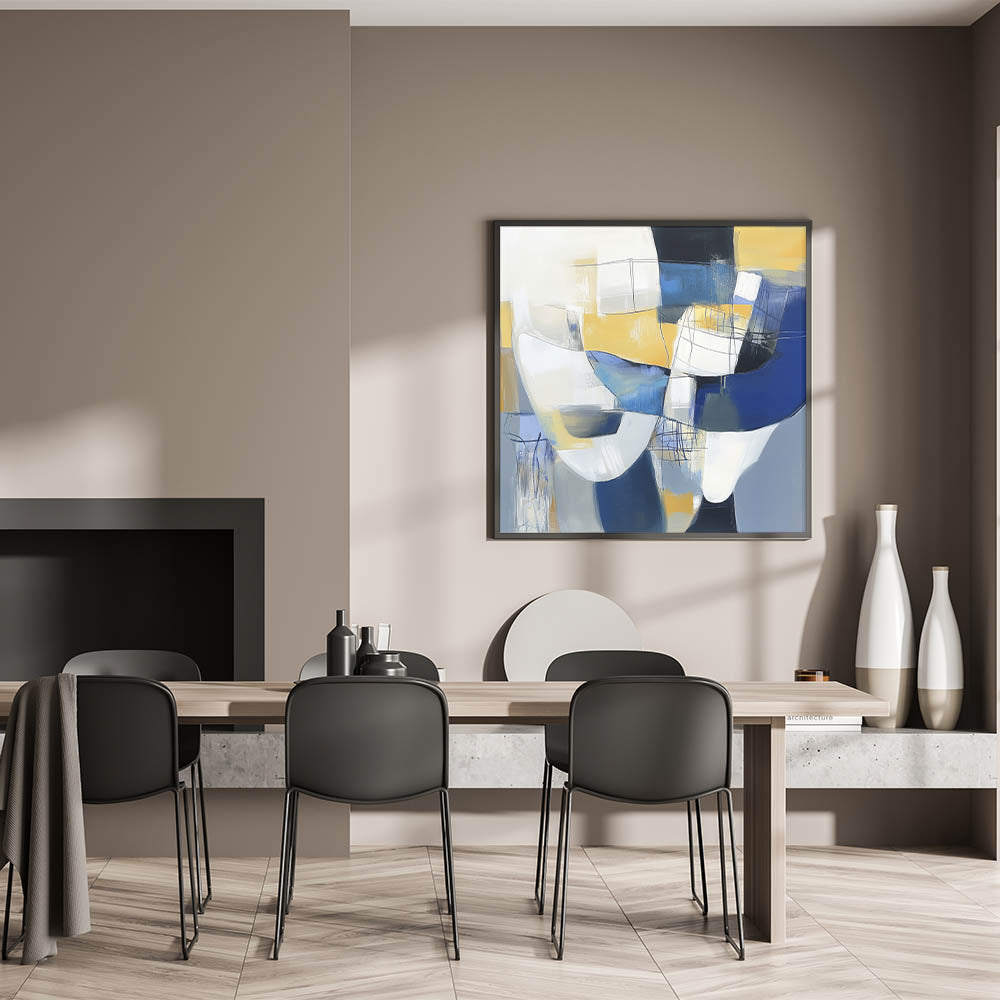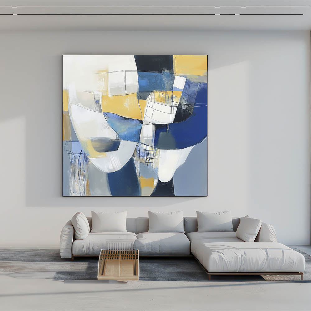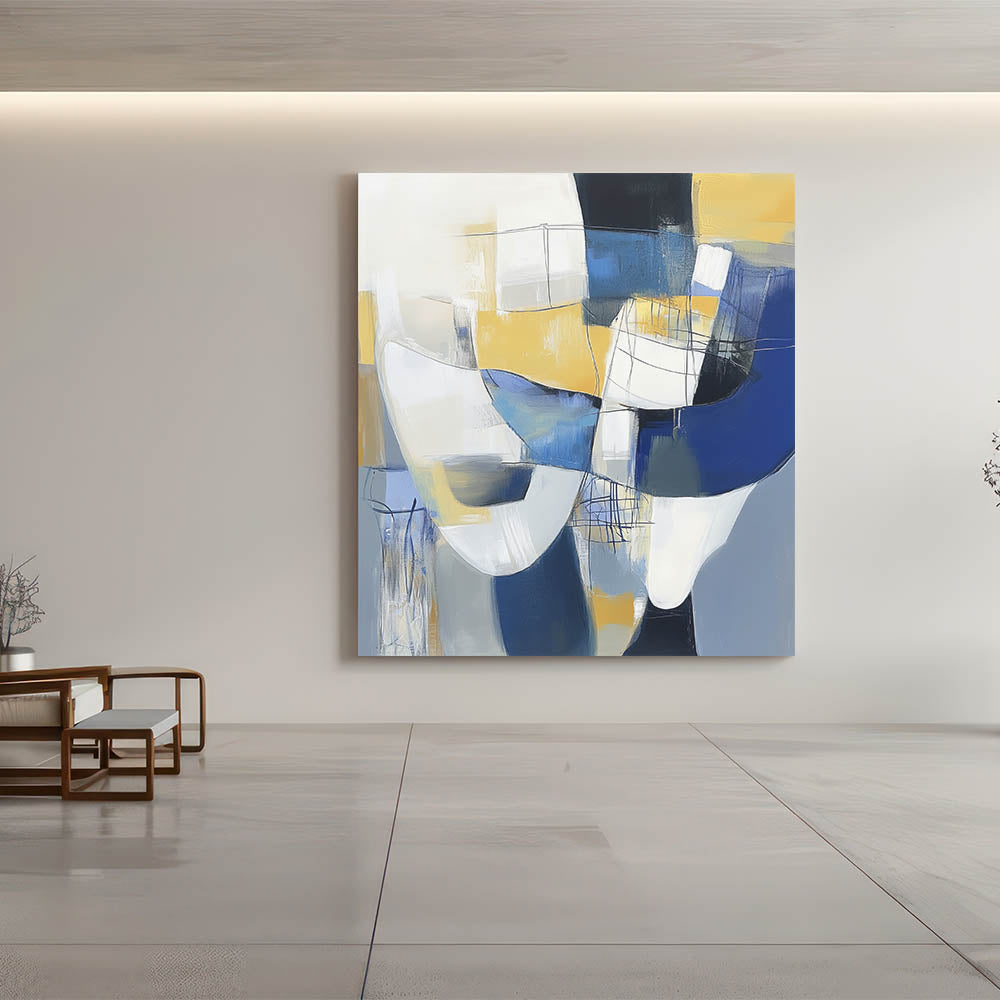 Brighten up your space with this expressive modern abstract wall art, featuring bold, curved shapes and layered brushwork in navy blue, vibrant yellow, white, and soft gray. This captivating composition delivers both structure and flow—making it an excellent choice for contemporary interiors that need an energetic yet balanced focal point.