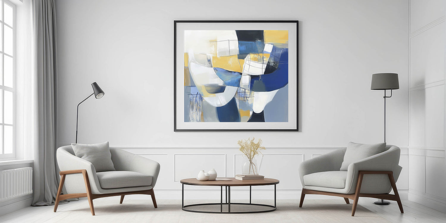 Modern Abstract Wall Art – Blue, Yellow & White Geometric Shapes