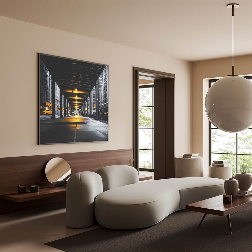 This high-quality urban photography print encapsulates the fast-paced, cinematic atmosphere of a bustling metropolis. Whether you’re looking for contemporary city wall decor or a vibrant cityscape canvas print, this artwork transforms your space with modern elegance and depth.
